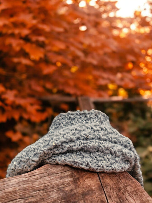 Adult's Handmade Knitted Moss Stitch Grey Sequin Cowl