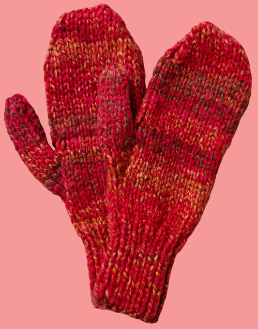 Adult's Mittens - Handmade Knitted Chunky Red, Orange, Rust, Fawn Tweed