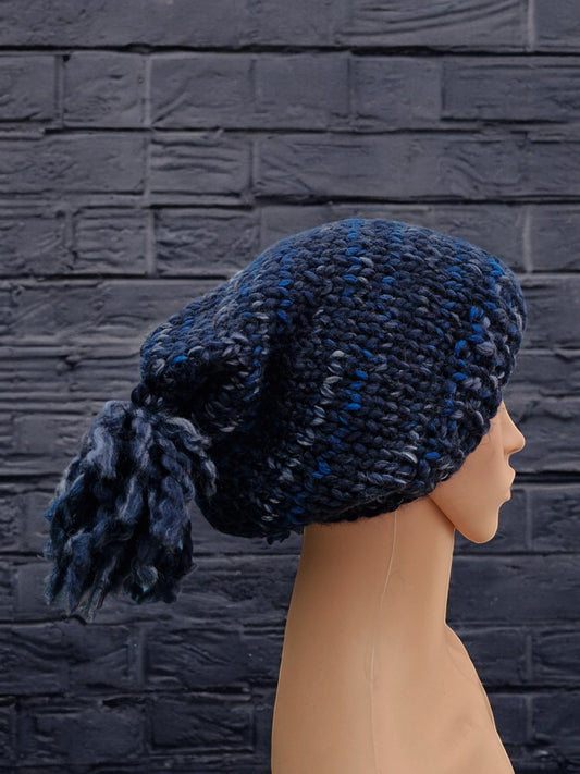 Women's Handmade Knitted Super Chunky Teabag Hat with Tassels in Dark Navy Blue tweed