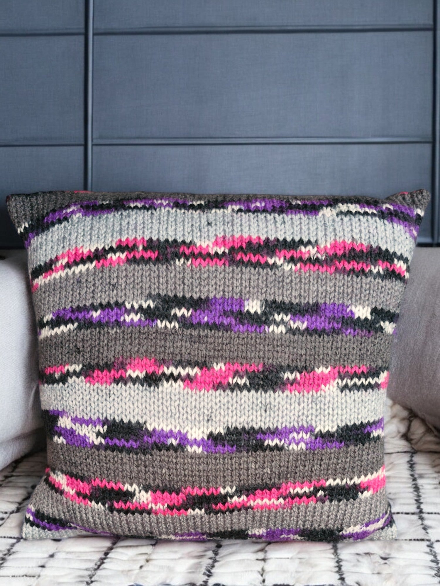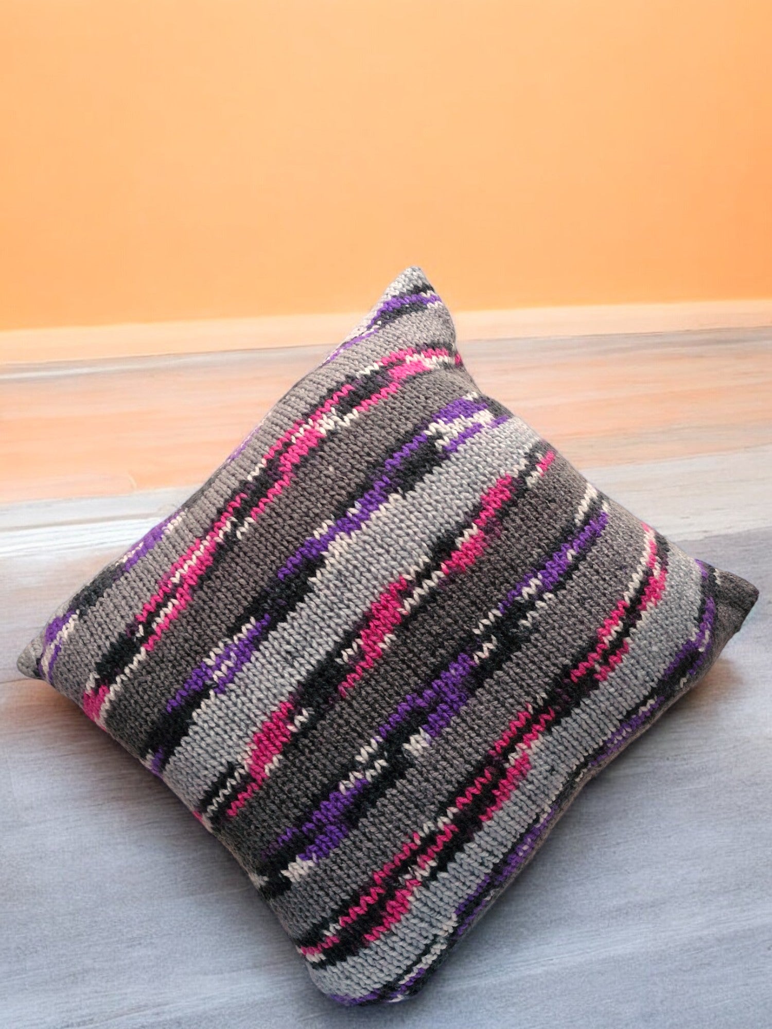 Handmade Knitted Chunky Cushion Cover - Grey with Multi Colour Stripe