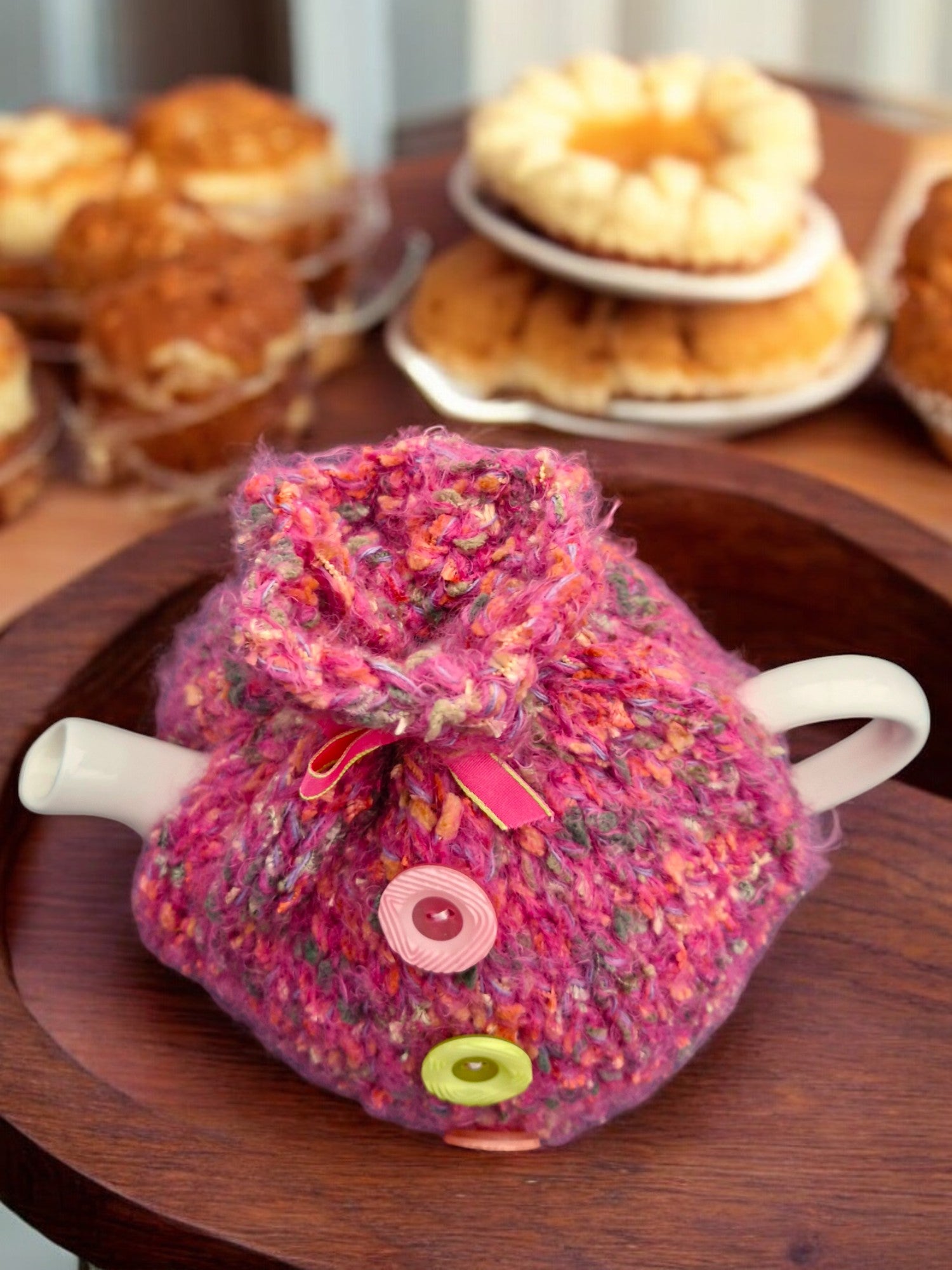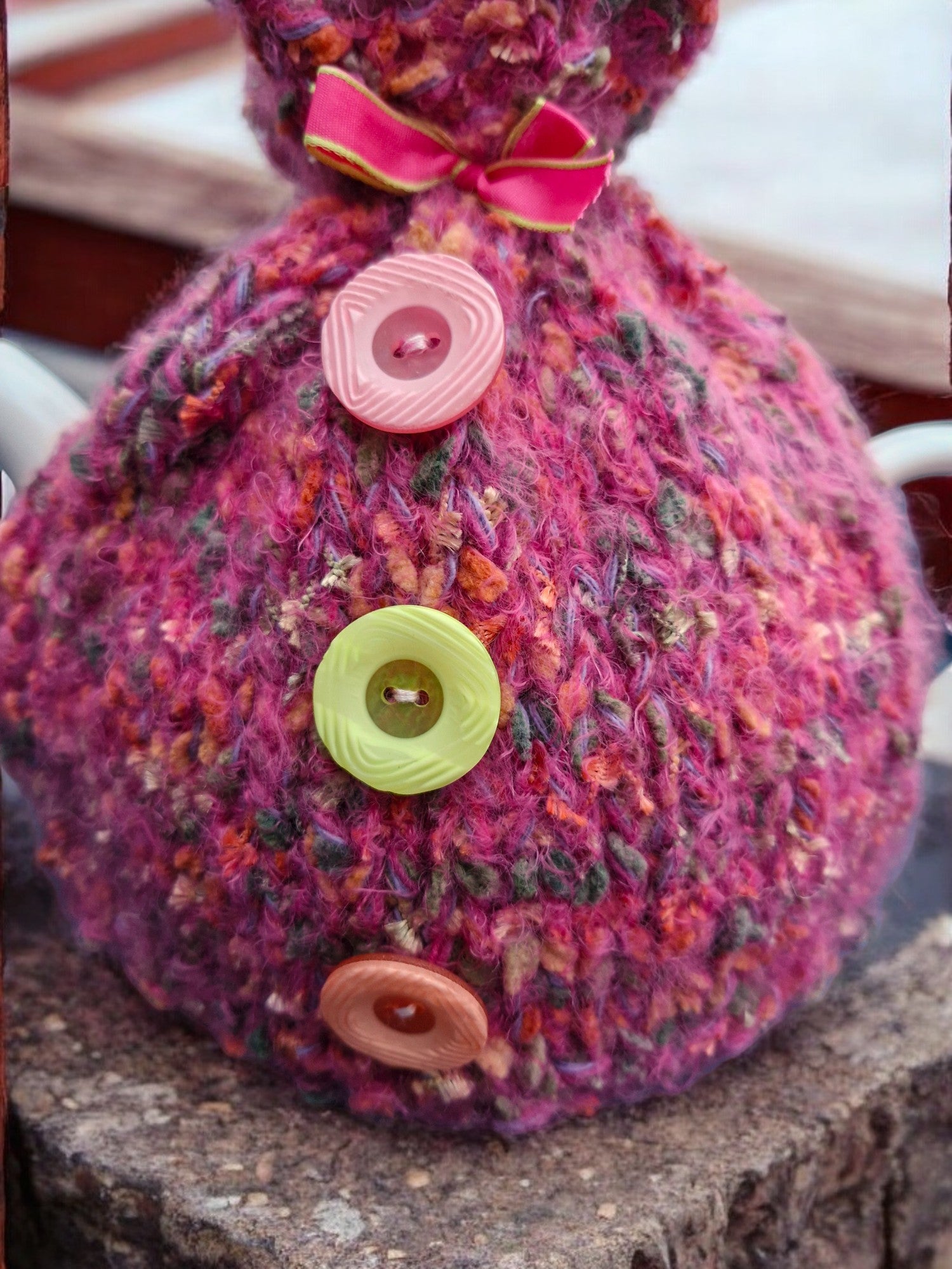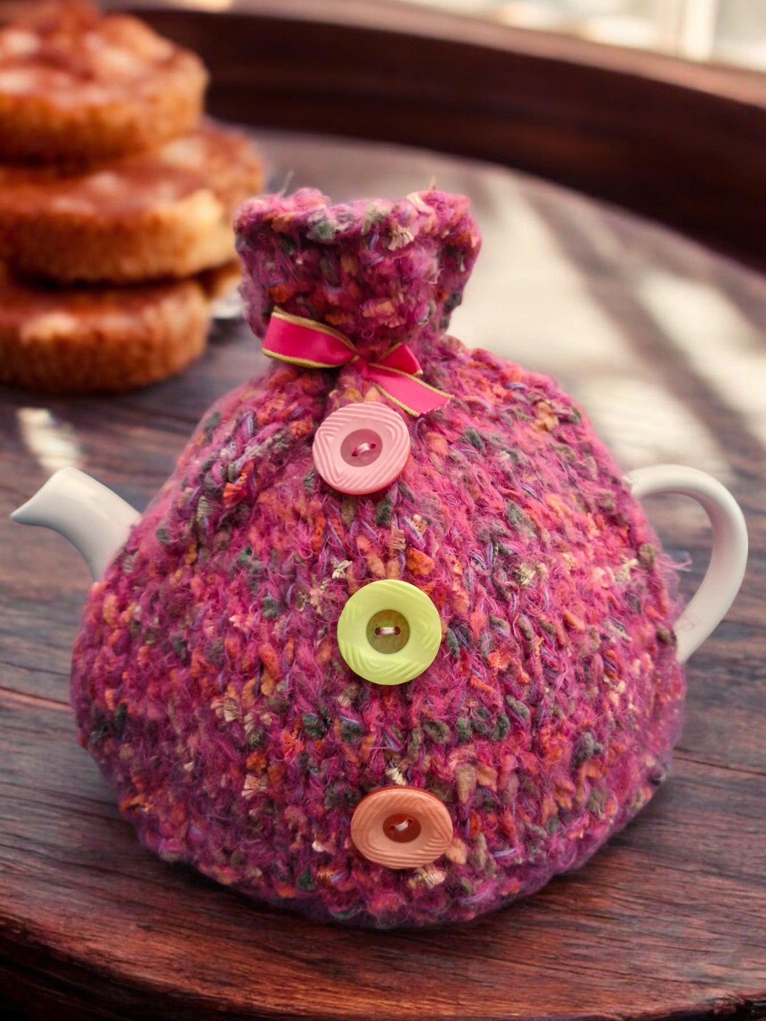Brand new Hand Knitted Thick Super Chunky Tea Cosy in Dark Pink with flecks of Orange, Brown and Gold. Tea Cosy is made from Super Chunky Yarn and decorated with three buttons and a pink bow to gather and fasten the top. Yarn has a tweed effect and is slightly fluffy. Made from 60% acrylic,10% Nylon,20% Wool, 10% Polyester - requires cool machine wash.