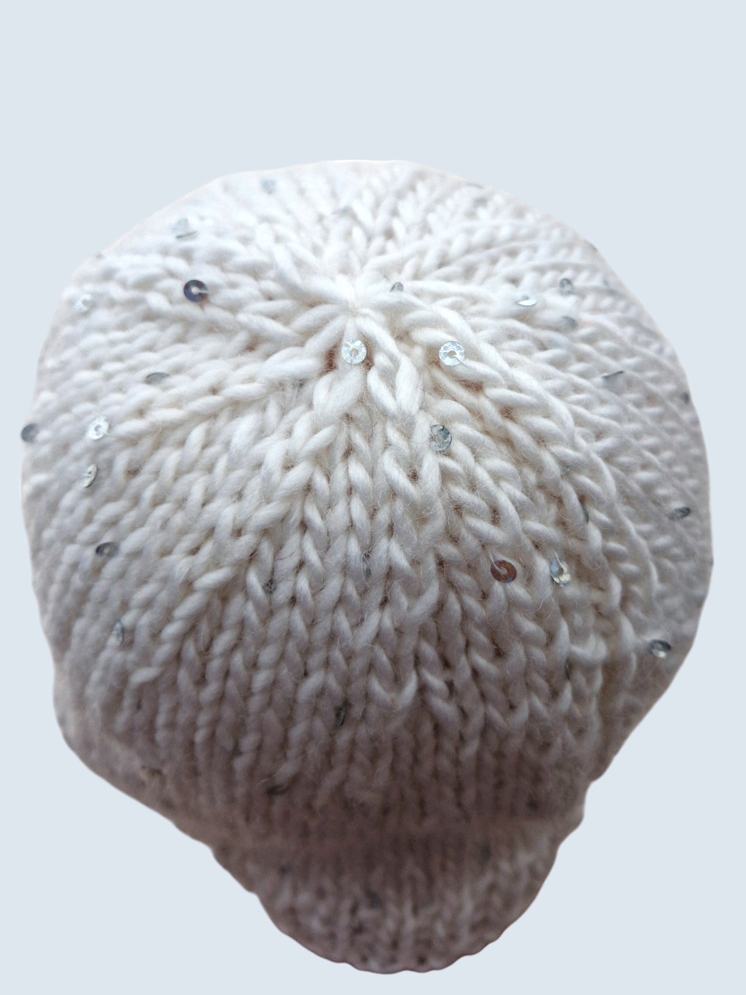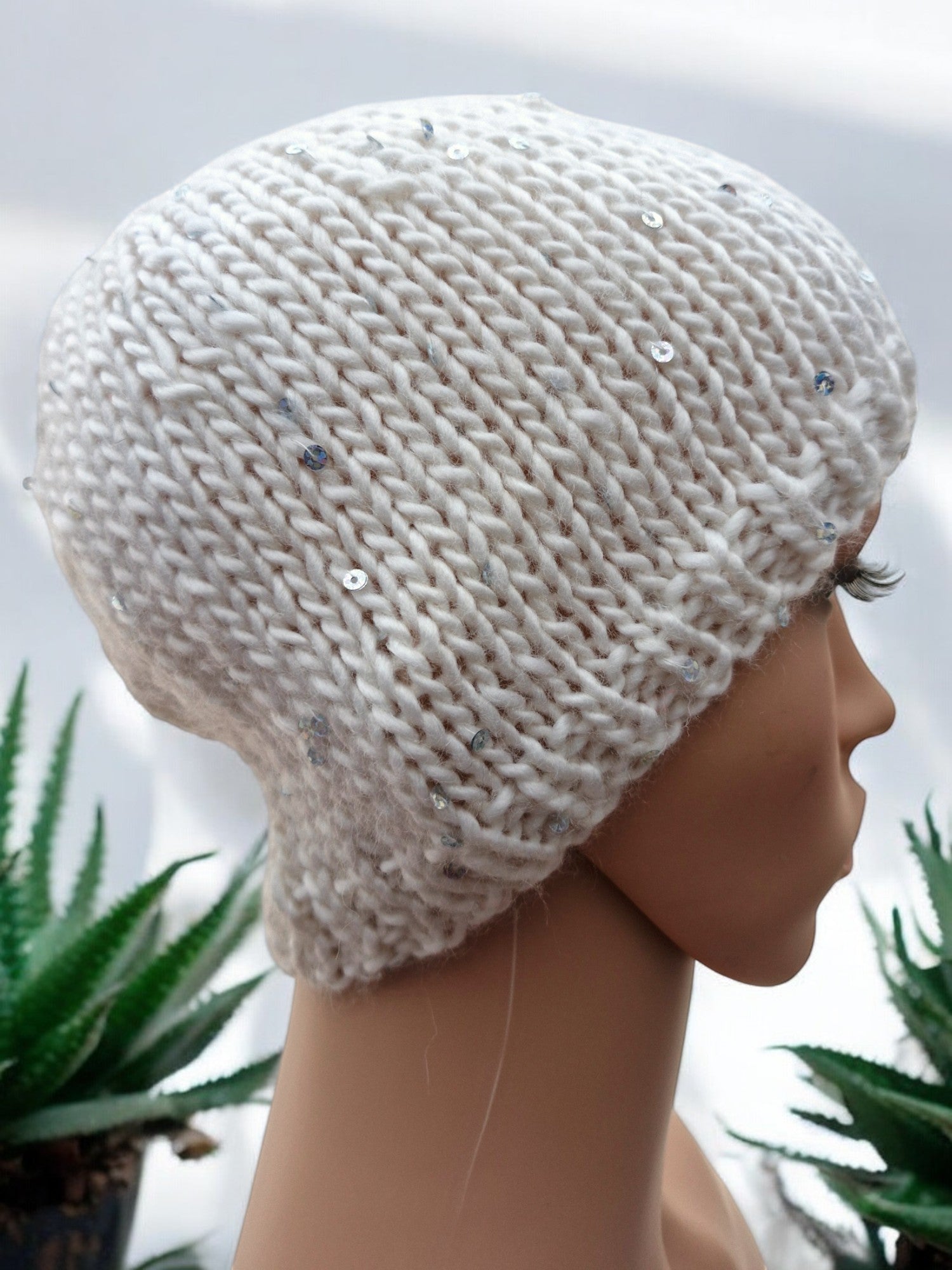 Brand new Hand Knitted Sequined Hat in White with Silver sequins. Size is small ladies or teenagers - a pull on Beanie style worked in Stocking Stitch pattern. Yarn is soft, sparkly and snuggly. Made from 80% acrylic,10% Wool, 10% Sequins - cool machine wash.