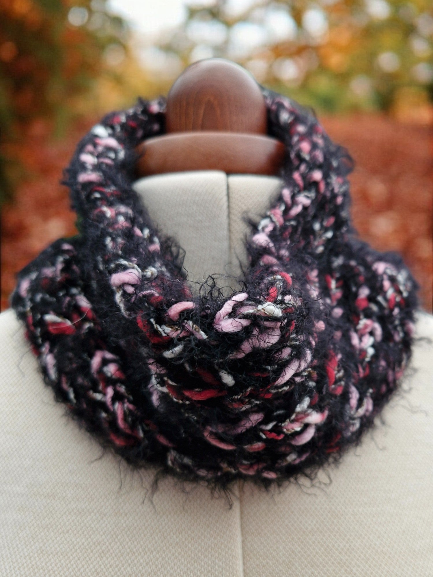 Brand new Adult's Hand Knitted Thick Super Chunky Cowl in Black, Red, Pink and White. Cowl pulls on over the head and fills the v in your coat neckline keeping your neck and throat warm and away from Winter chills . Yarn is soft, slightly fluffy, chunky and snuggly. Made from 80% acrylic,10% Nylon,10% Wool - cool machine wash.
