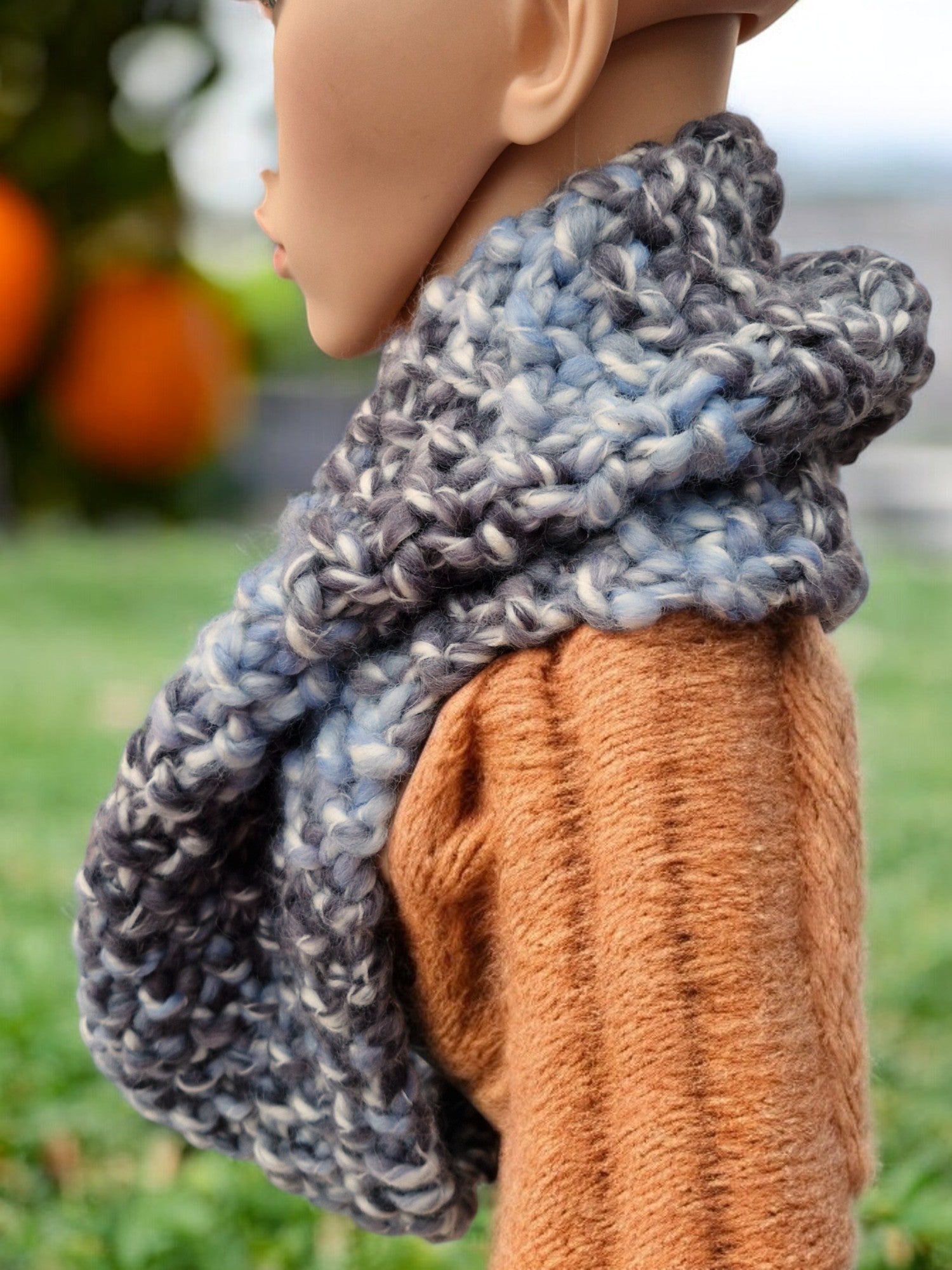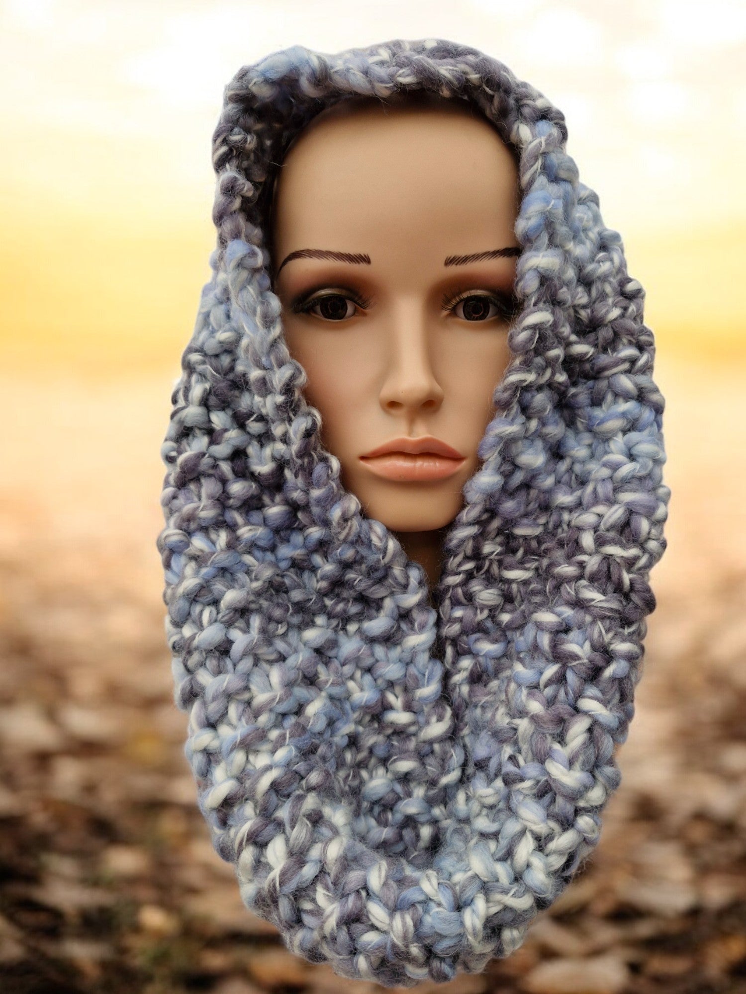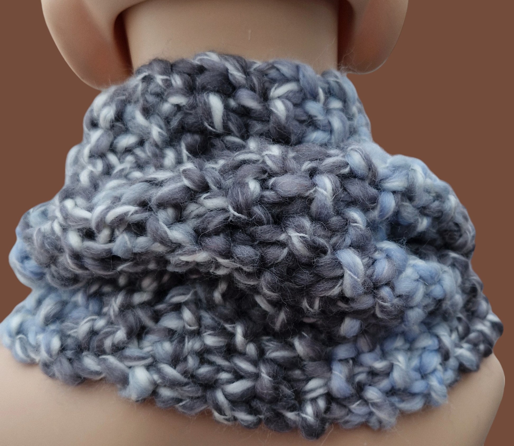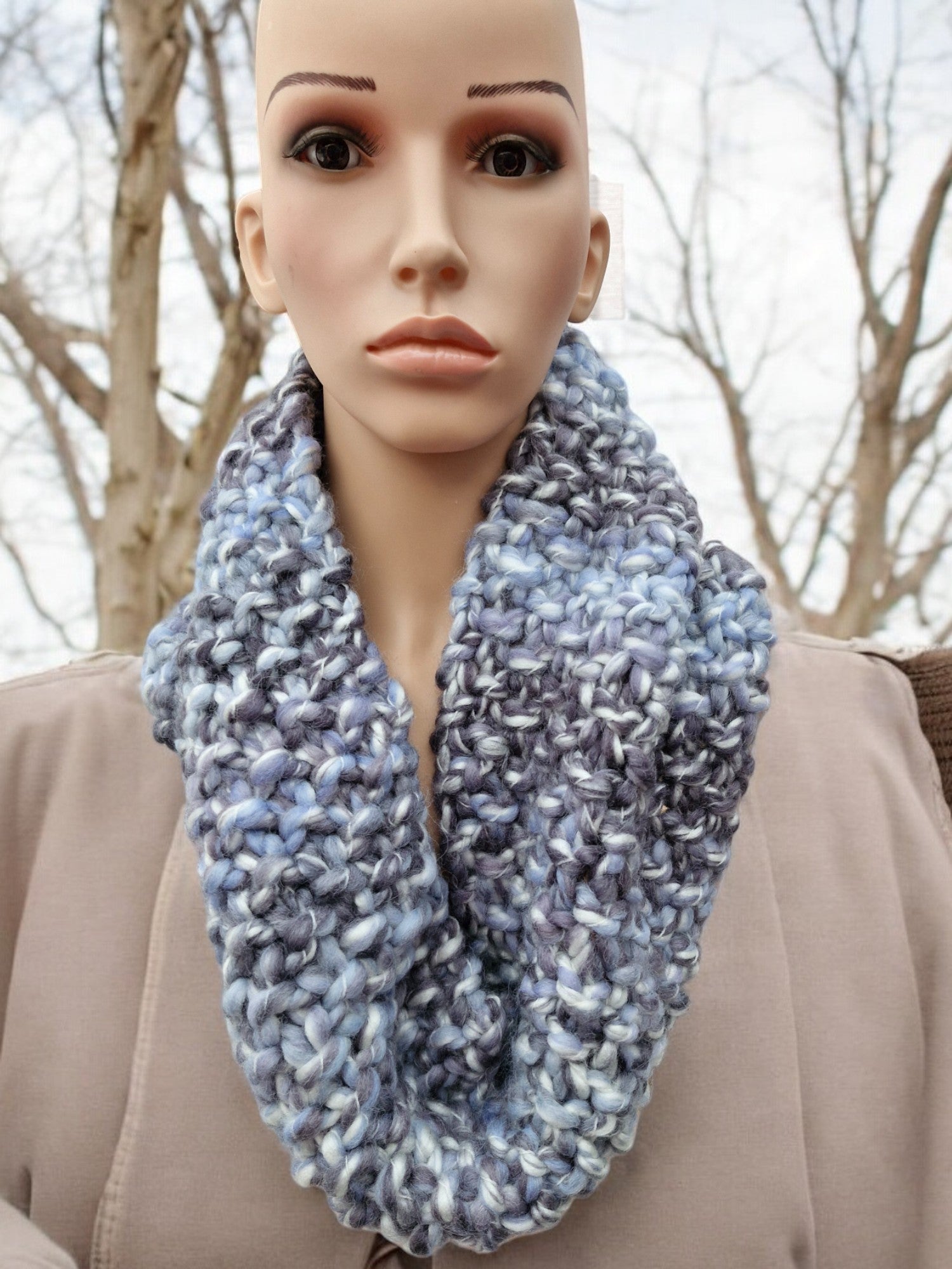 Brand new Adult's Hand Knitted Thick Super Chunky Cowl in Greys. Cowl is worked in Moss Stitch pattern made from Super Chunky yarn in many shades of Grey. Soft, chunky and snuggly. Can be worn just around the neck to cover the V in your coat or over your head to keep your ears warm too. Made from 80% acrylic,10% Wool, 10% Nylon - cool machine wash.