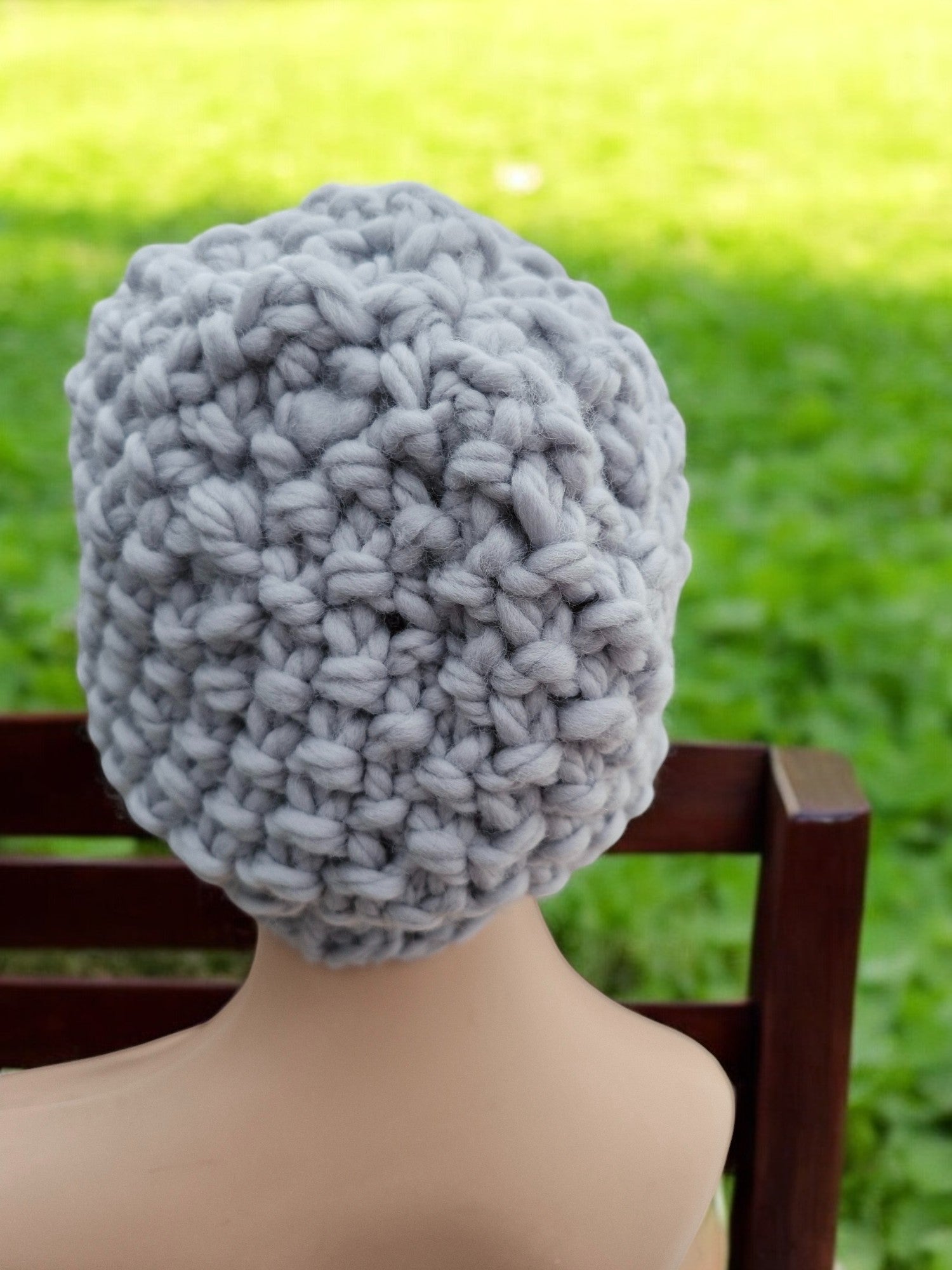 Brand new Adult's Hand Knitted Mega Chunky Hat in Medium Grey. Hat is a pull on Beanie style worked in Moss Stitch pattern. Yarn is very thick and chunky. Made from King Cole Big value Big Mega Chunky 100% acrylic - machine washable.