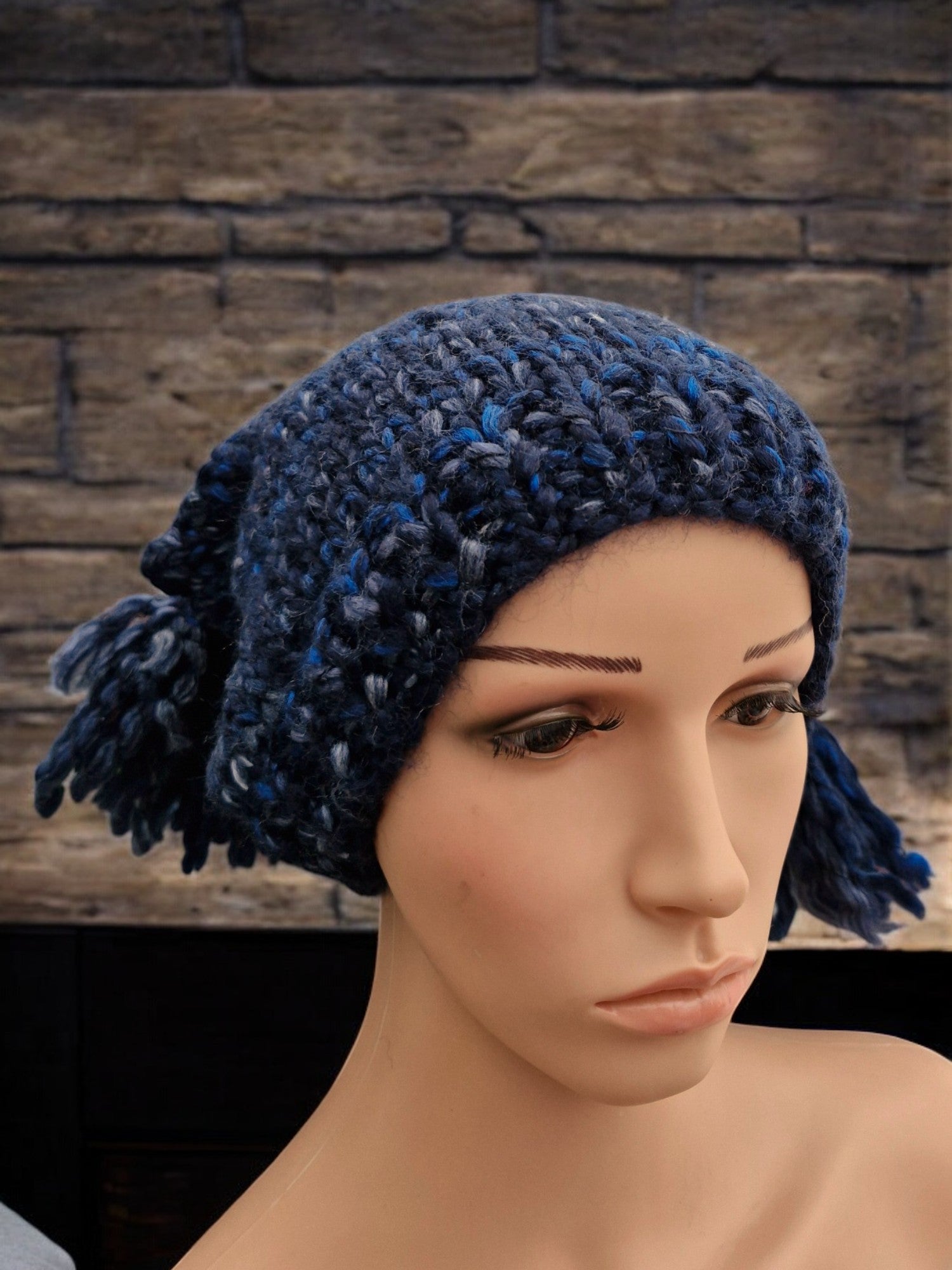 Women's Handmade Knitted Super Chunky Teabag Hat with Tassels in Dark Navy Blue tweed