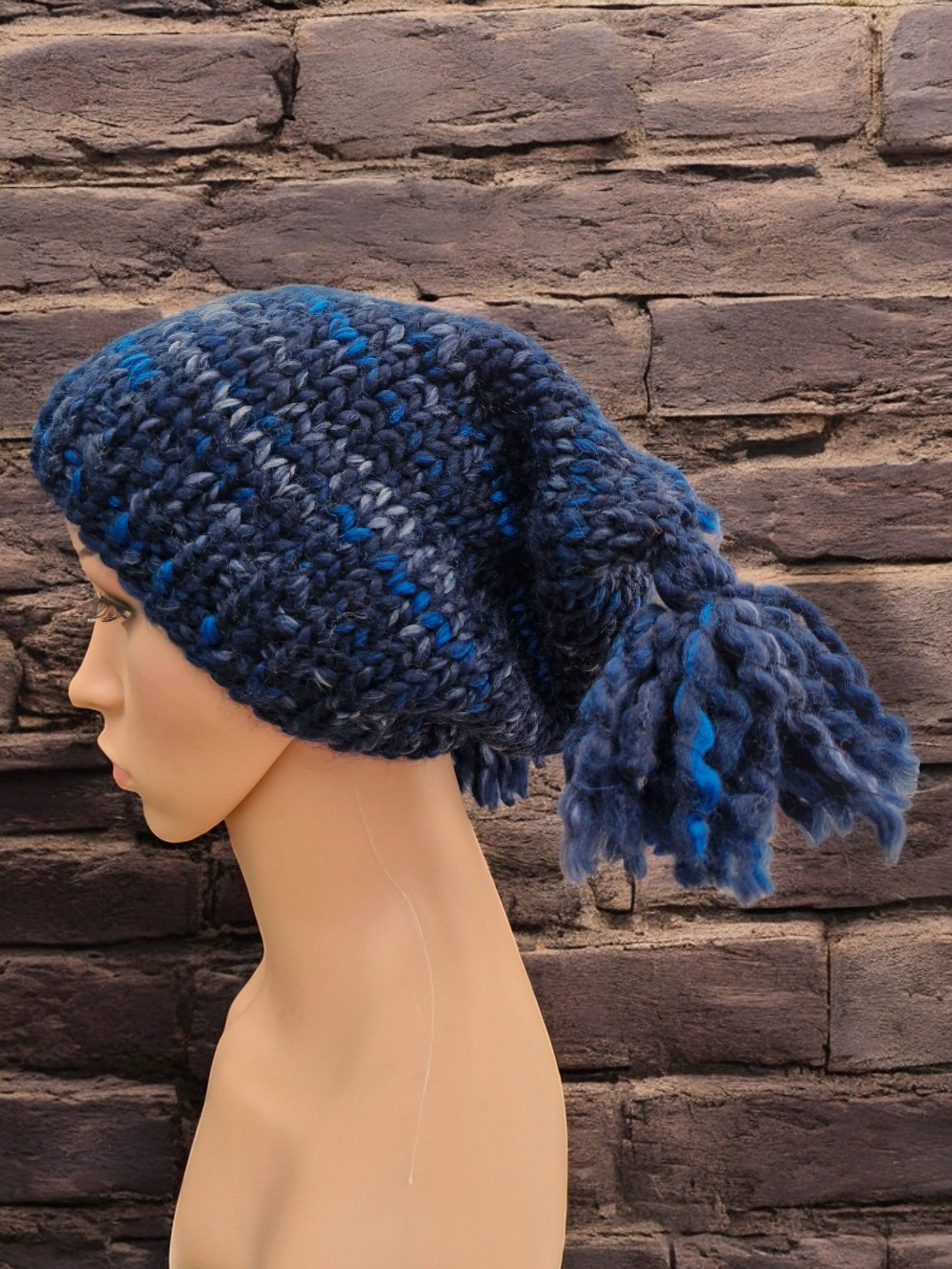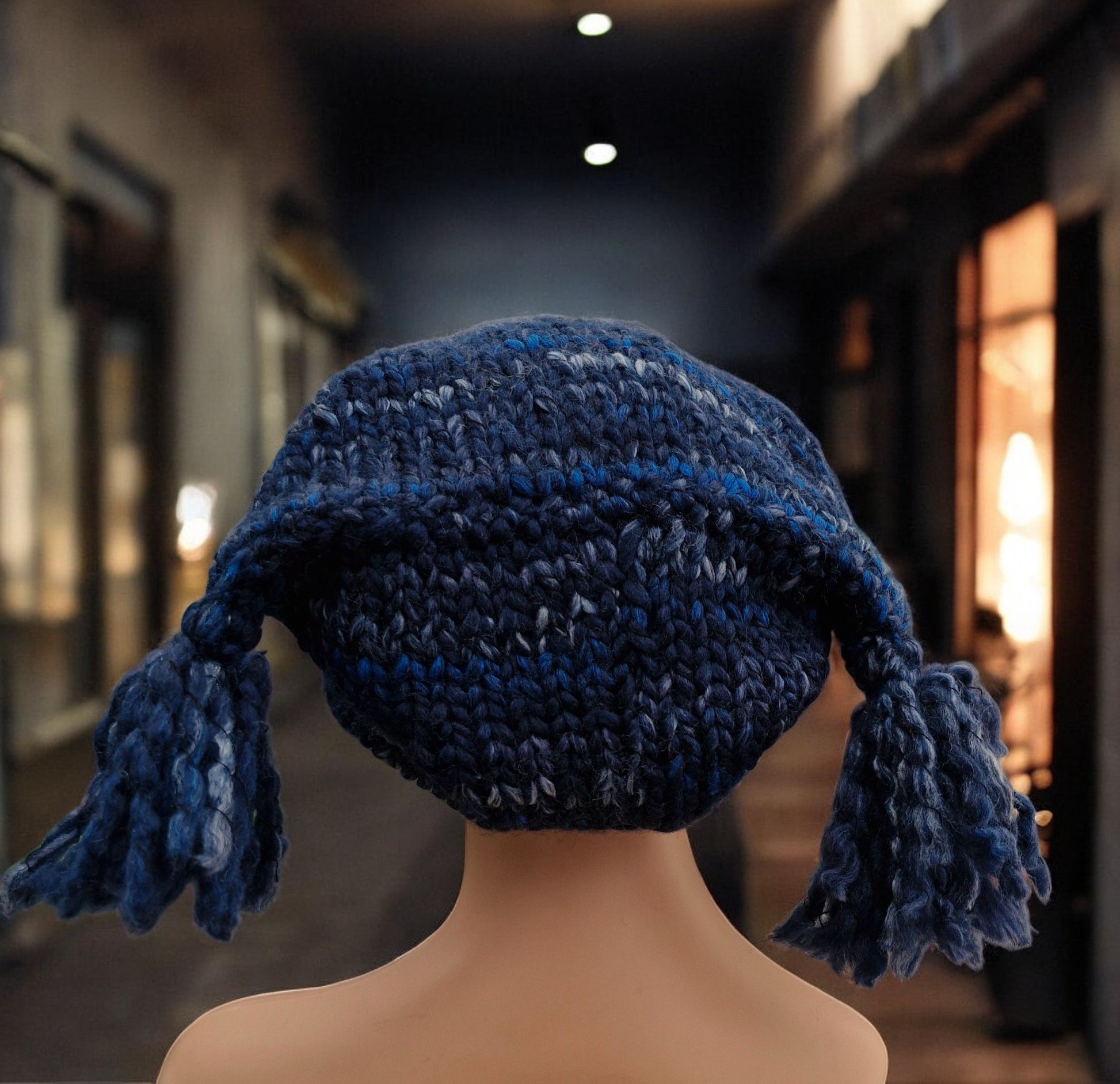 Adult's Hand Knitted Super Chunky Teabag Hat in Dark Navy with multi-shade Blue Twists. Hat is a pull on, Teabag style hat with tassels at two top corners and worked in Stocking Stitch pattern. Yarn is soft, chunky and snuggly - King Cole Big Value Super Chunky Tints. Made from 100% acrylic - machine washable.