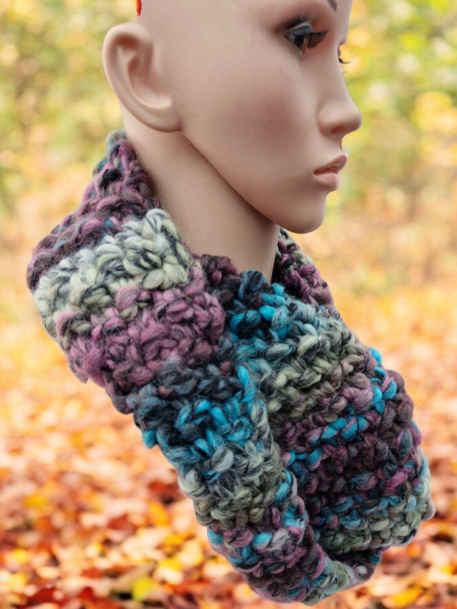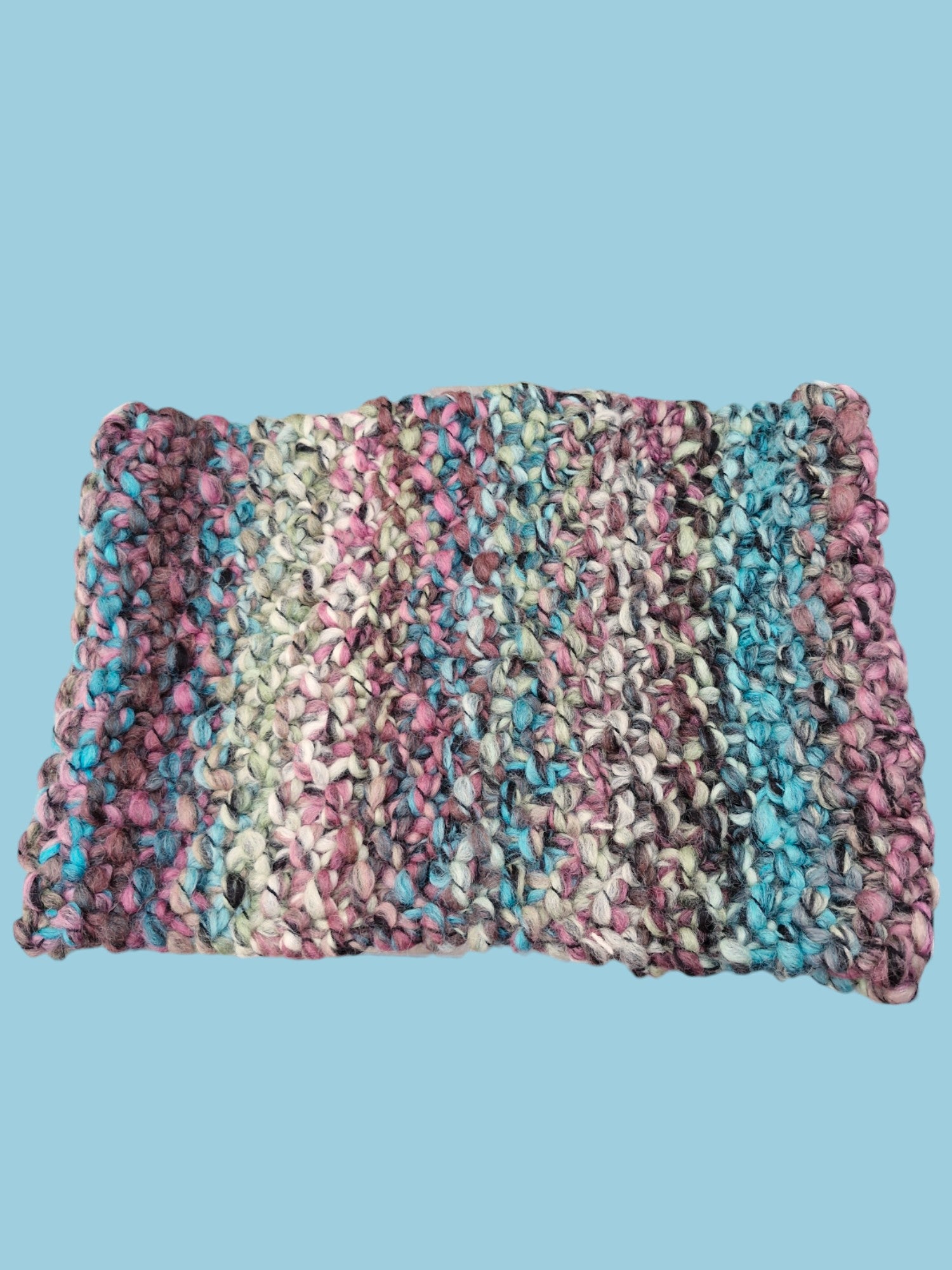 Brand new Adult's Hand Knitted Mega Chunky Moss Stitch Cowl in Moss Green, Turquoise and Rose Pink. Cowl pulls on over the head, very thick and snuggly to keep your neck and throat warm and away from Winter chills . Yarn is Wendy Mega Chunky yarn, which is multi coloured with a black twist. Made from 90% acrylic,10% Wool - cool machine wash.