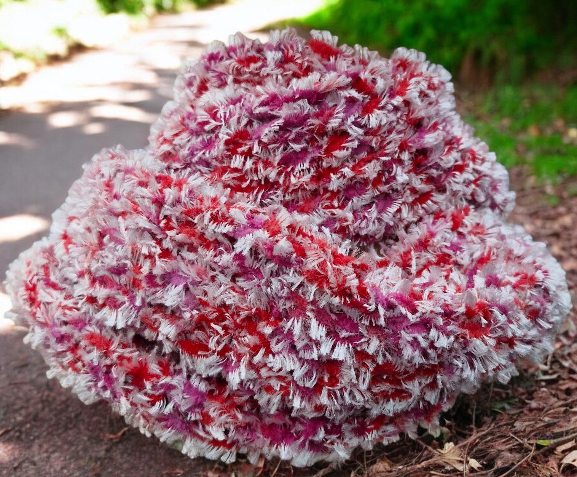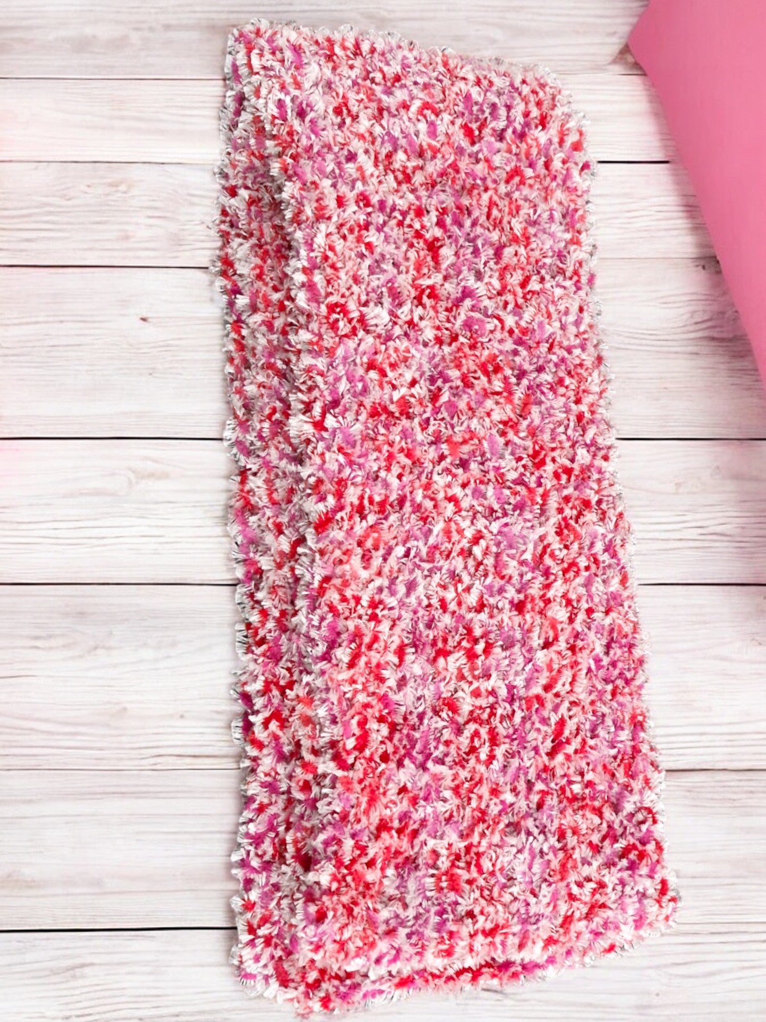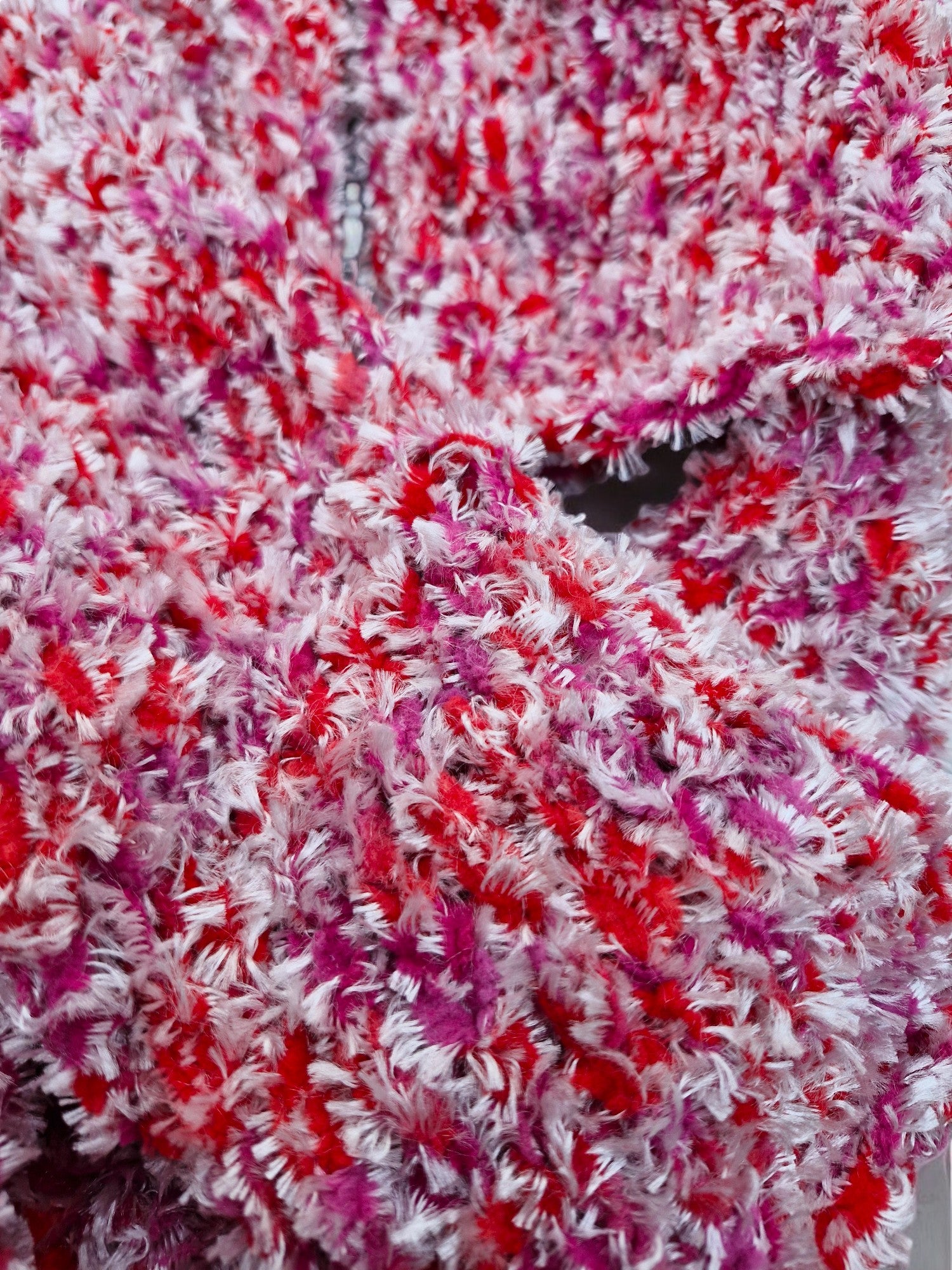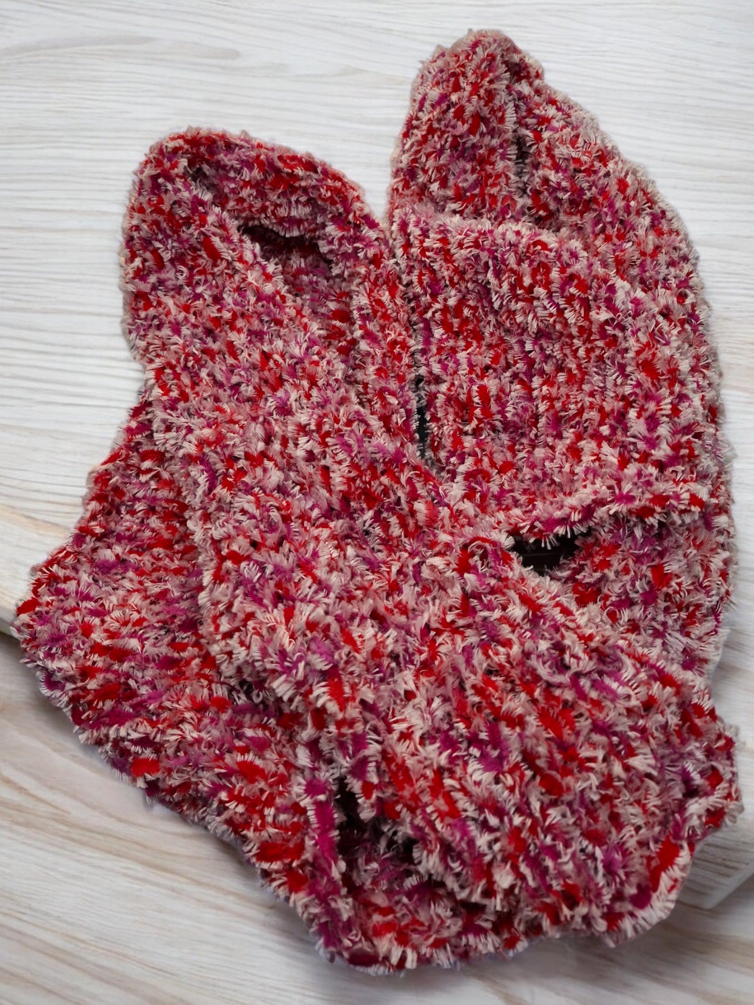 Brand new Adult's Hand Knitted Chunky Stocking Stitch, Long Scarf in Red, Cerise and White. Yarn is Velour fabric lengths which alternates between Red and Cerise and is edged on both sides with White satin fringe - Chunky weight - soft and cuddly. Made from 90% acrylic,10% Polyamide - cool machine wash.