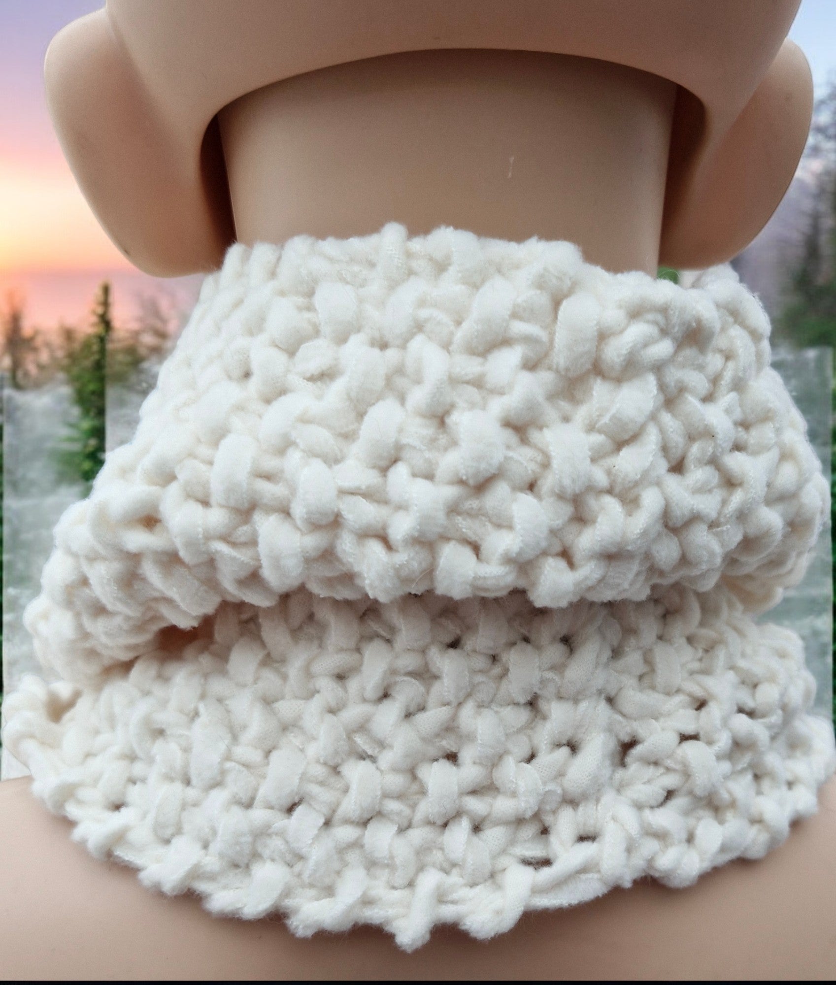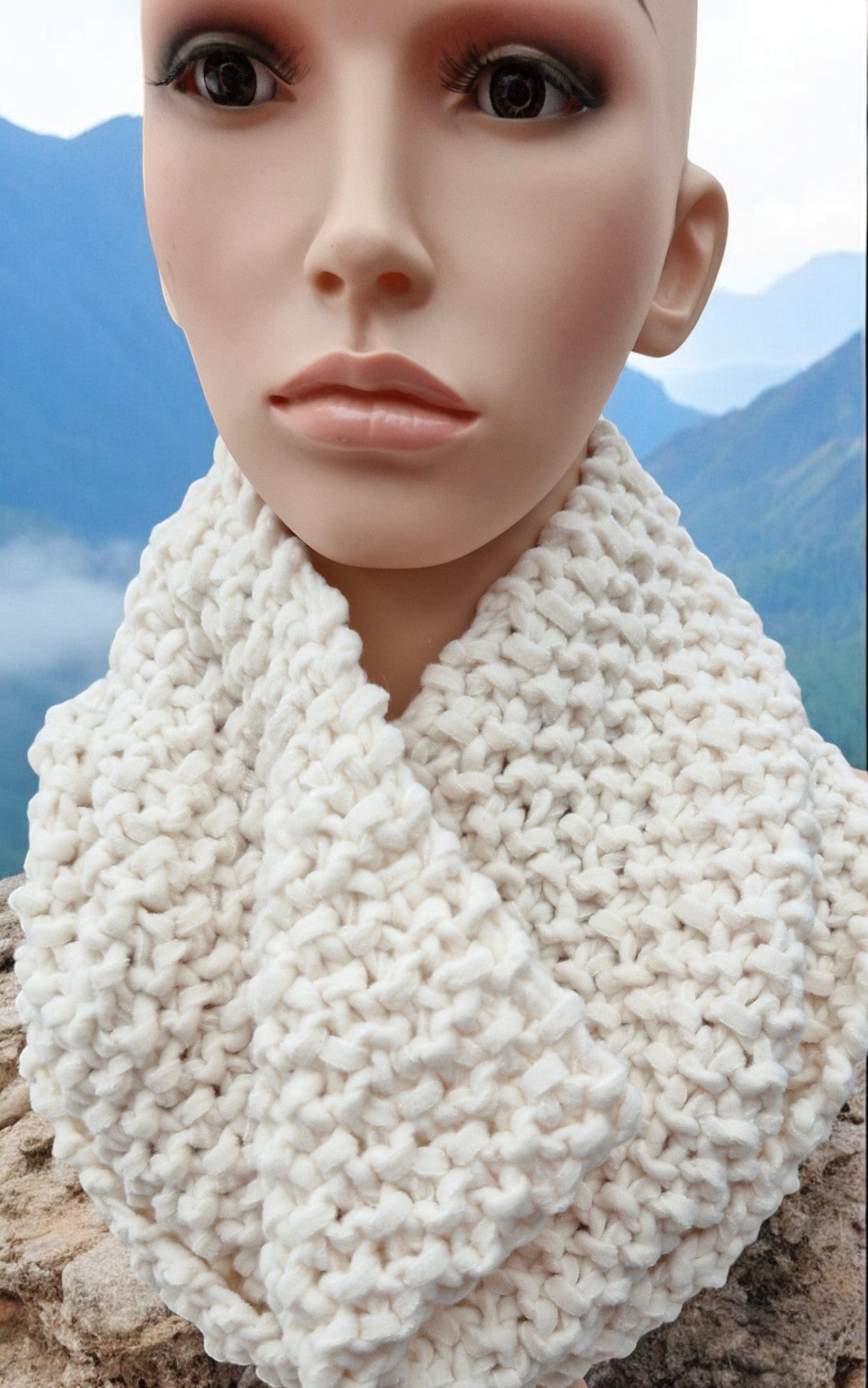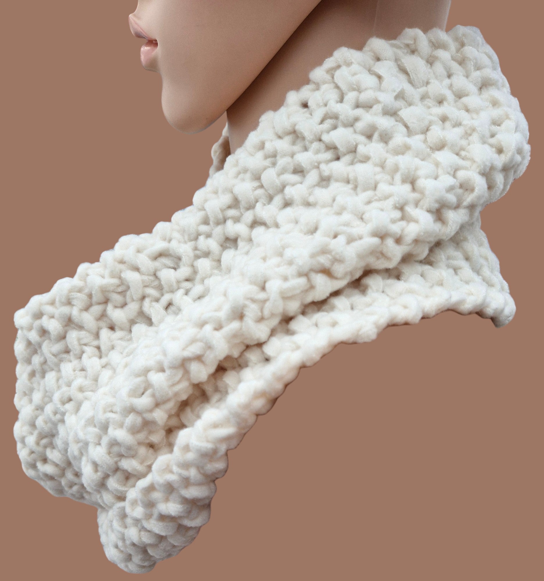 Brand new Adult's Hand Knitted Chunky Moss Stitch Cowl in Cream. Cowl pulls on over the head and fills the v in your coat neckline keeping your neck and throat warm and away from Winter chills . Yarn is King Cole's Funky Felt which is Velour fabric lengths used as yarn - Chunky weight. Made from 90% acrylic,10% Polyamide - cool machine wash.