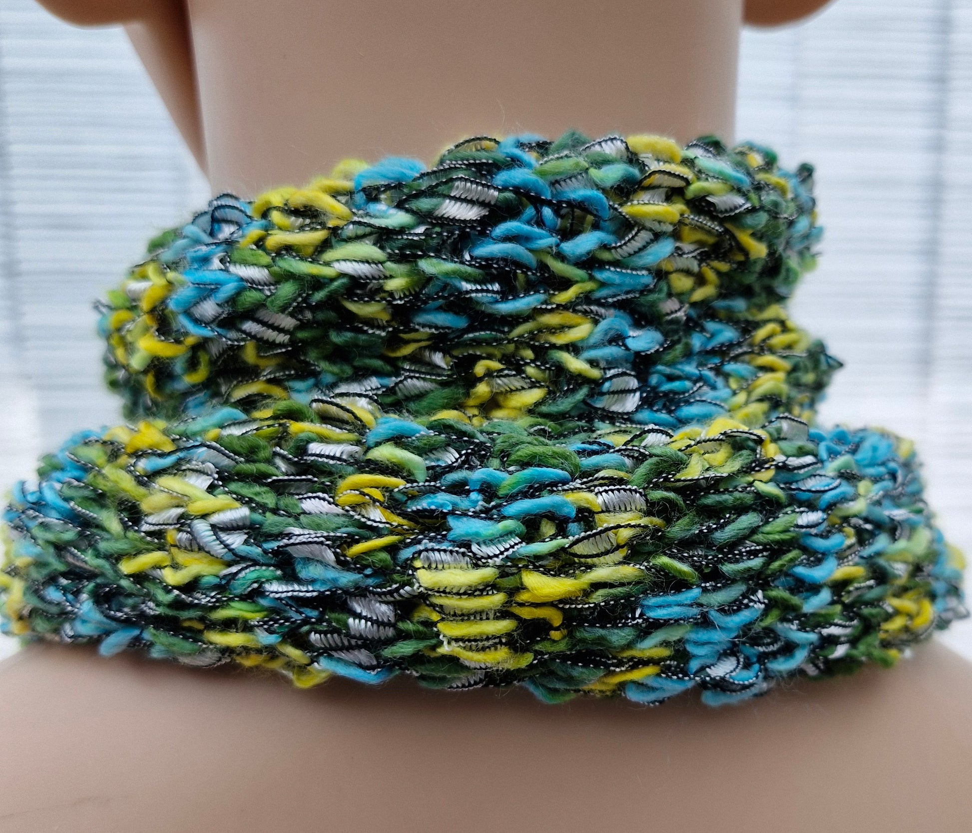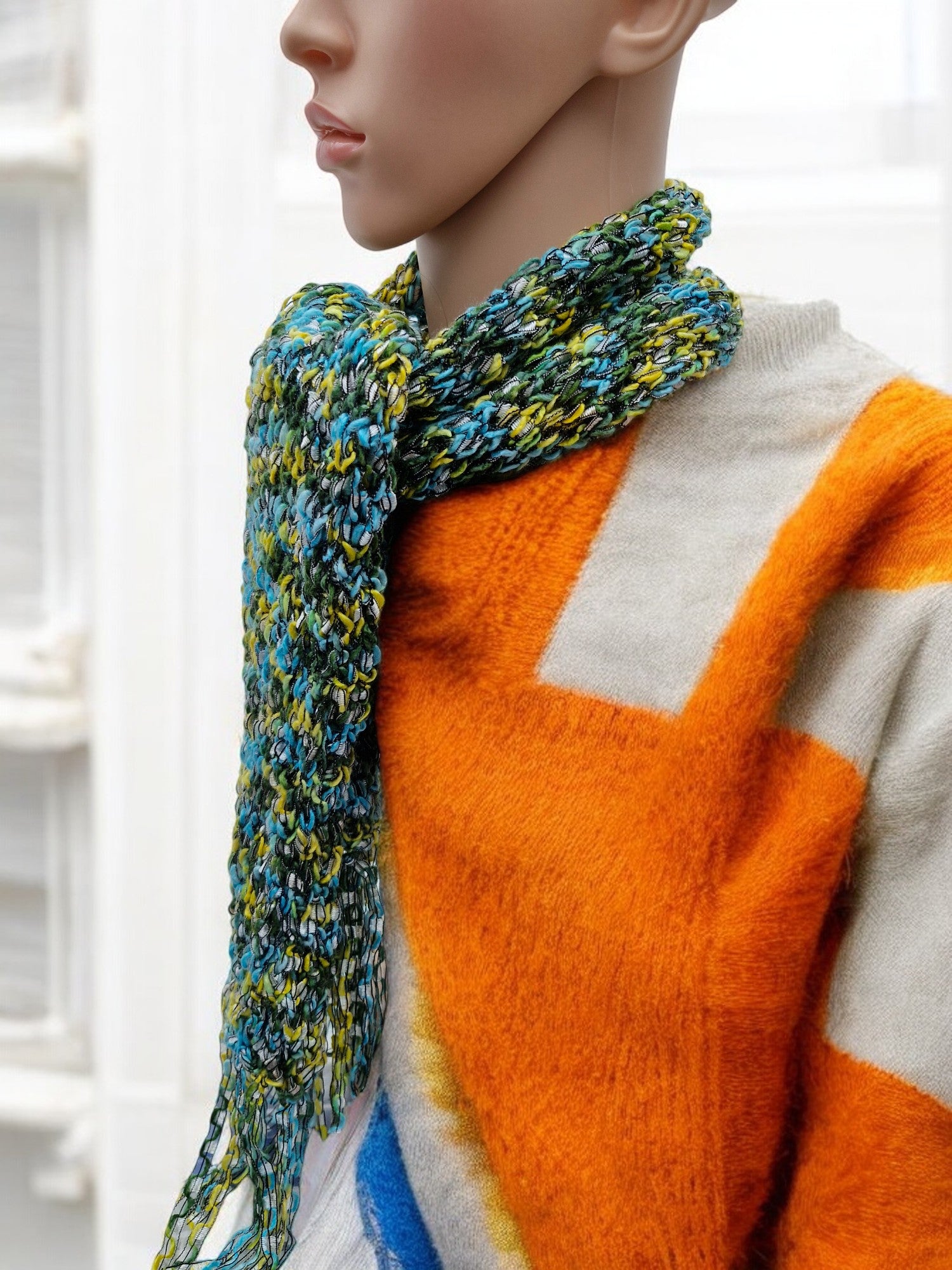 Brand new Adult's Hand Knitted Stocking Stitch, Ribbon Scarf in Green, Lime, Turquoise and Silver. Yarn is two stands of thin black cotton yarn with ribbon between which alternates between Turquoise, Lime Green, Dark Green and Silver - DK weight. Scarf is edged on both sides with fringe - elegant and dressy. Made from 90% acrylic,10% Polyamide - cool machine wash.