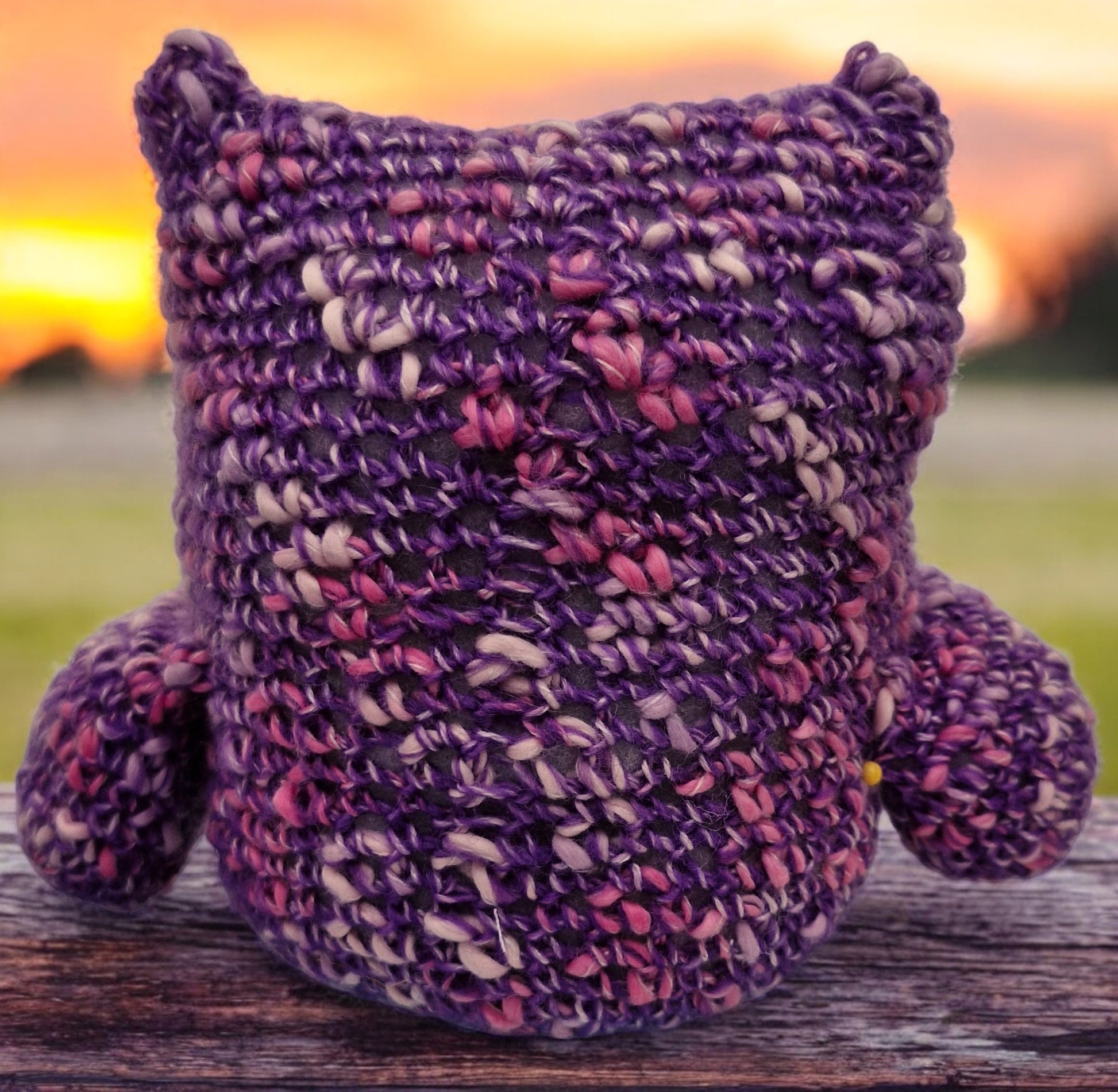 Hand Crocheted Owl in Purple Tweed. Owl is knitted with Chunky Purple Tweed King Cole yarn and stuffed with flame proof toy stuffing. Two large eyes with Black stemmed buttons for the centres. Yarn is soft and cuddly. Made from 90% acrylic,10% Wool - cool machine wash.