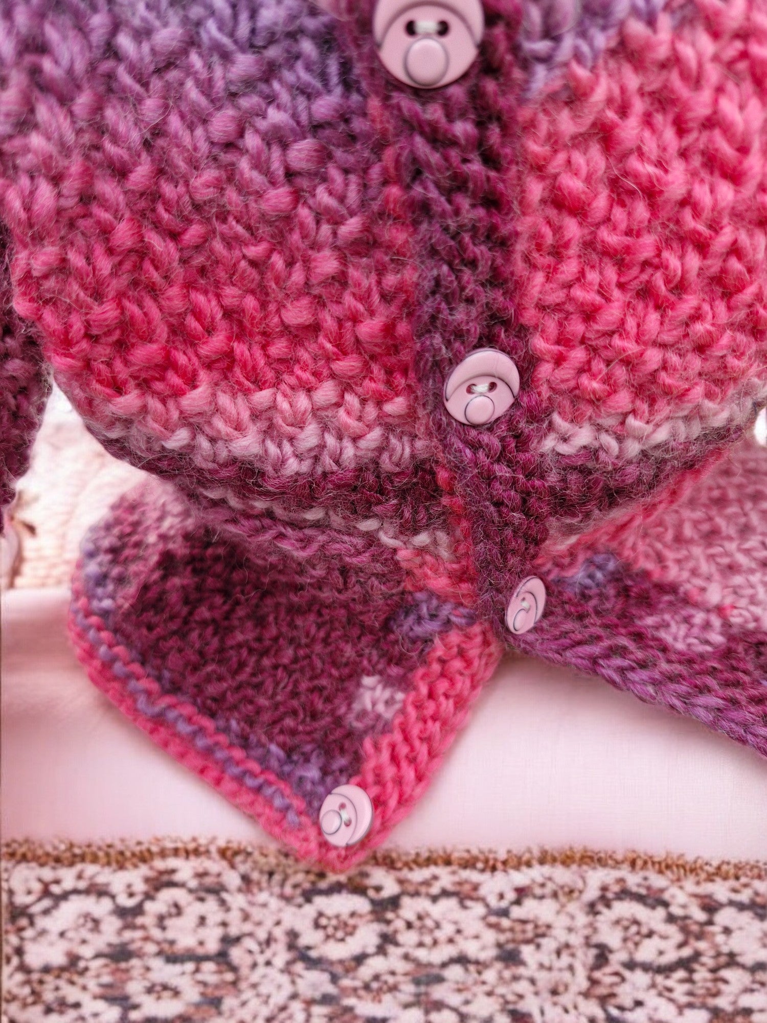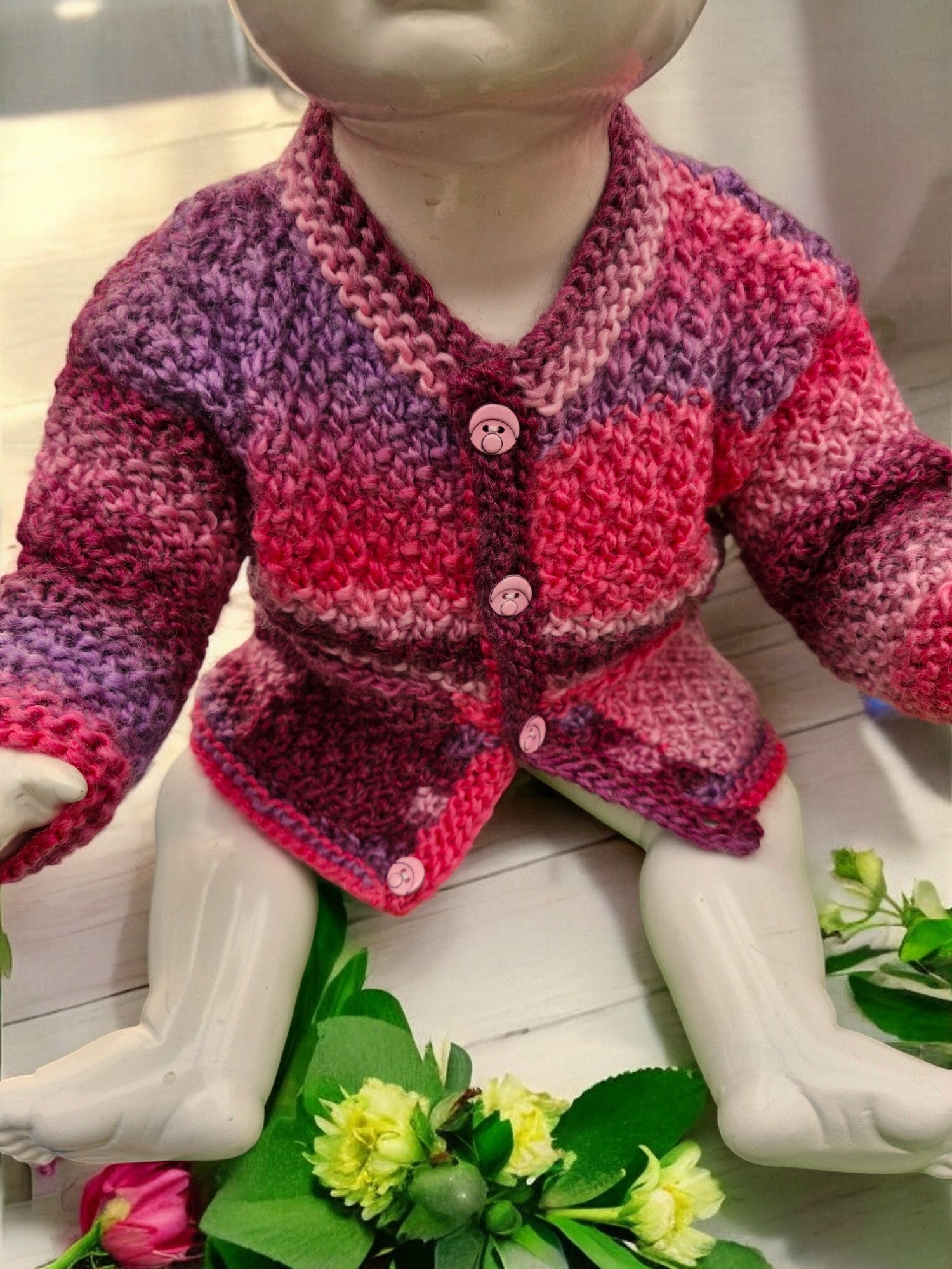 Brand new Baby's Hand Knitted Jacket in Baby Pink, Candy Pink, Maroon and Mauve Moss Stitch. Jacket has a round neck, Long Sleeves, two small front Pockets and fastens with 4 Pale Pink Face Buttons. Machine washable - DK weight yarn. Yarn used King Cole Riot DK (30% Wool, 70% Acrylic).