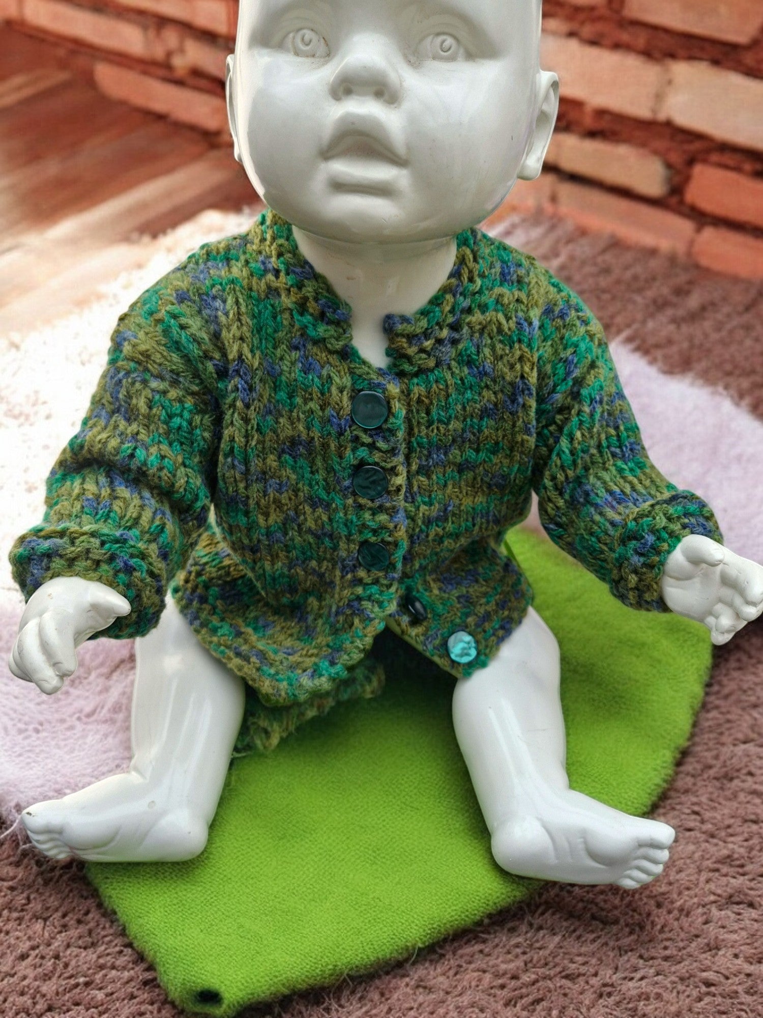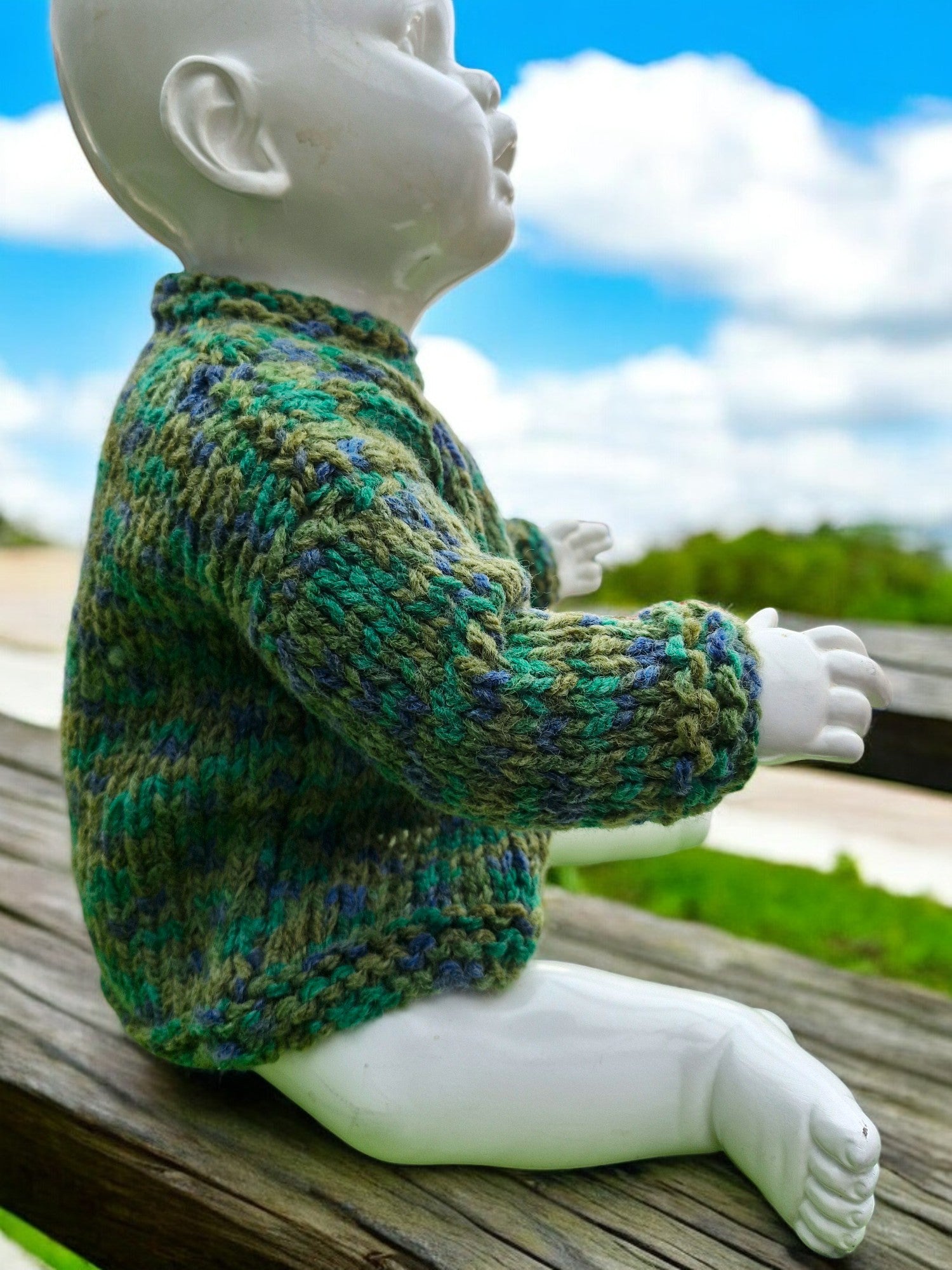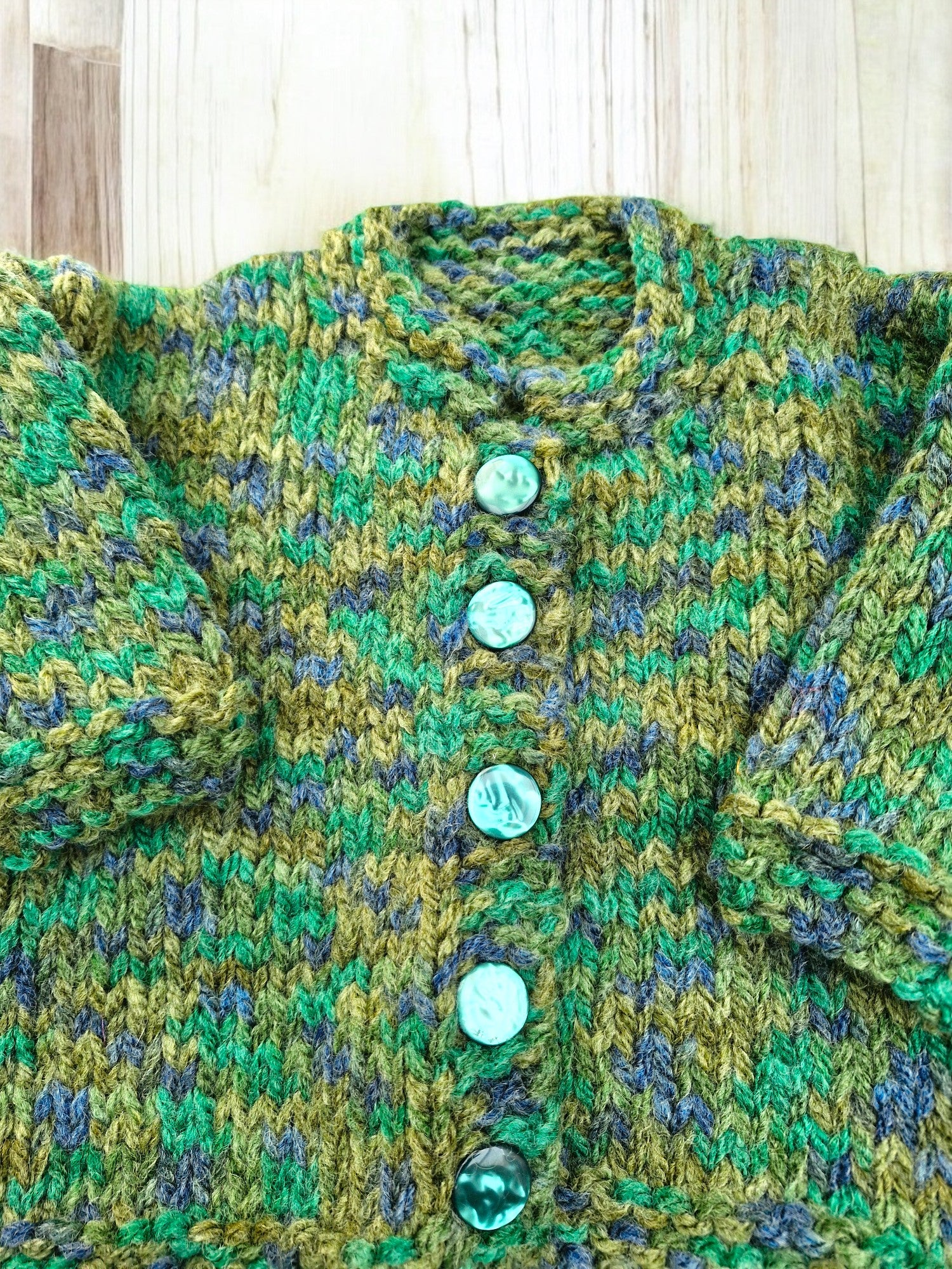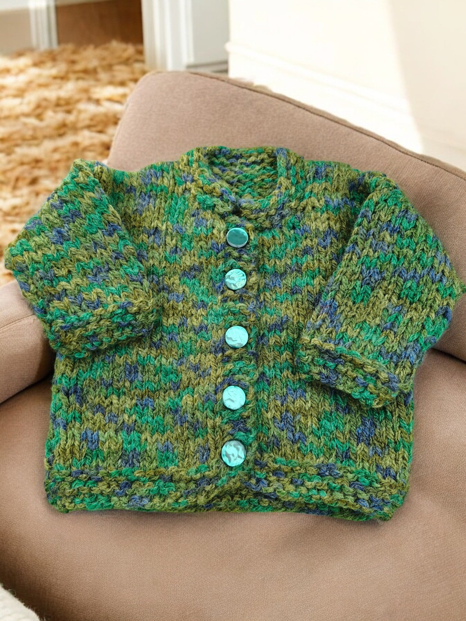 Brand new Baby's Hand Knitted Thick Warm Jacket in Tweed Green. Jacket has Round Neck, Long Sleeves and fastens with 5 shiny Green round buttons. Yarn is Ice Super Chunky Tweed yarn which is a mixture of two shades of Green plus Navy Blue - 100% Acrylic - machine washable.