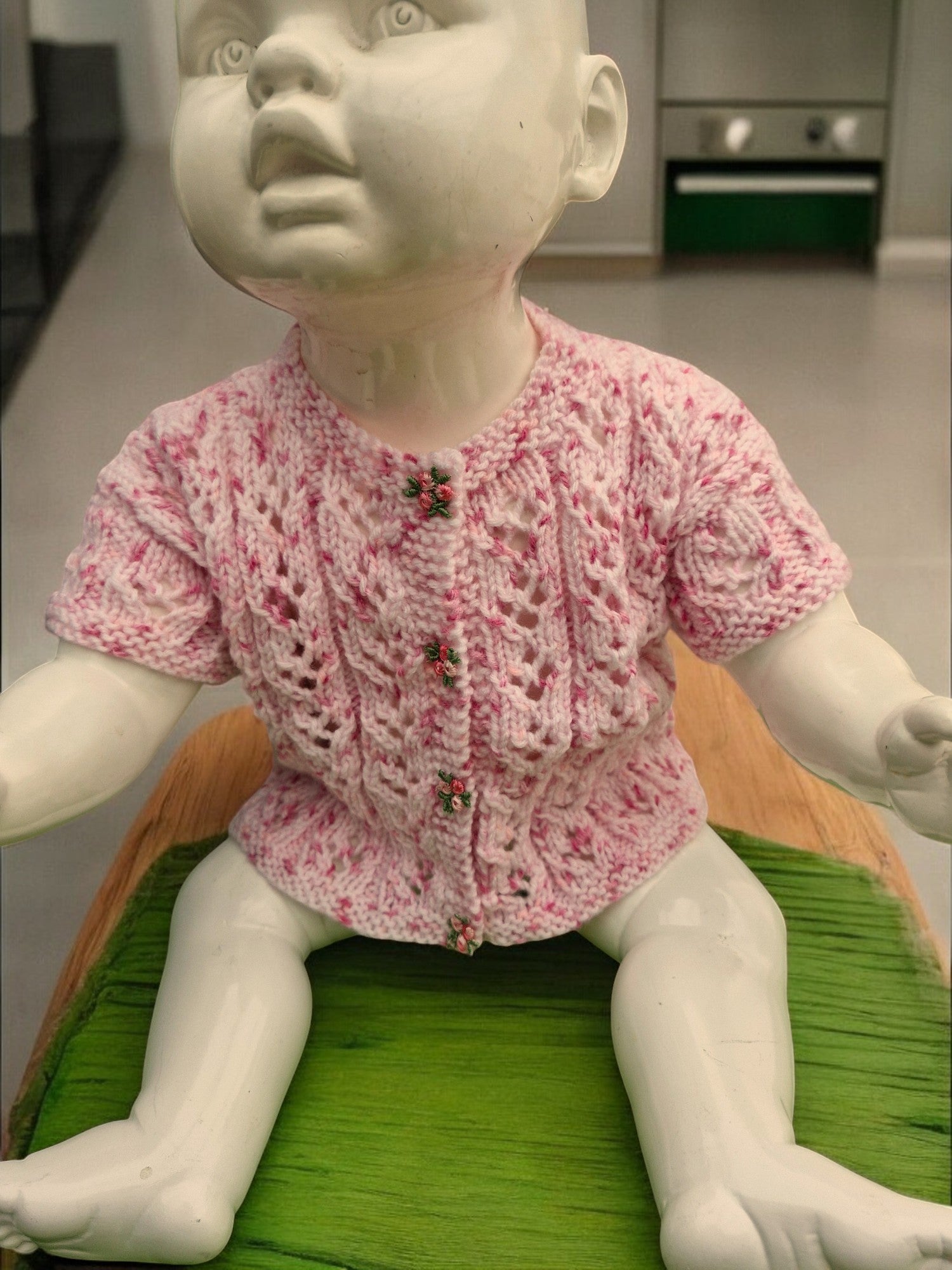 Brand new Baby's Hand Knitted Lacy Jacket in Pink Tweed. Jacket has Round Neck, Short Sleeves and fastens with 4 press stud covered with embroidered Pink bouquets. Yarn is James Brett Baby DK yarn. Made from 100% Acrylic - cool machine wash - DK weight yarn.