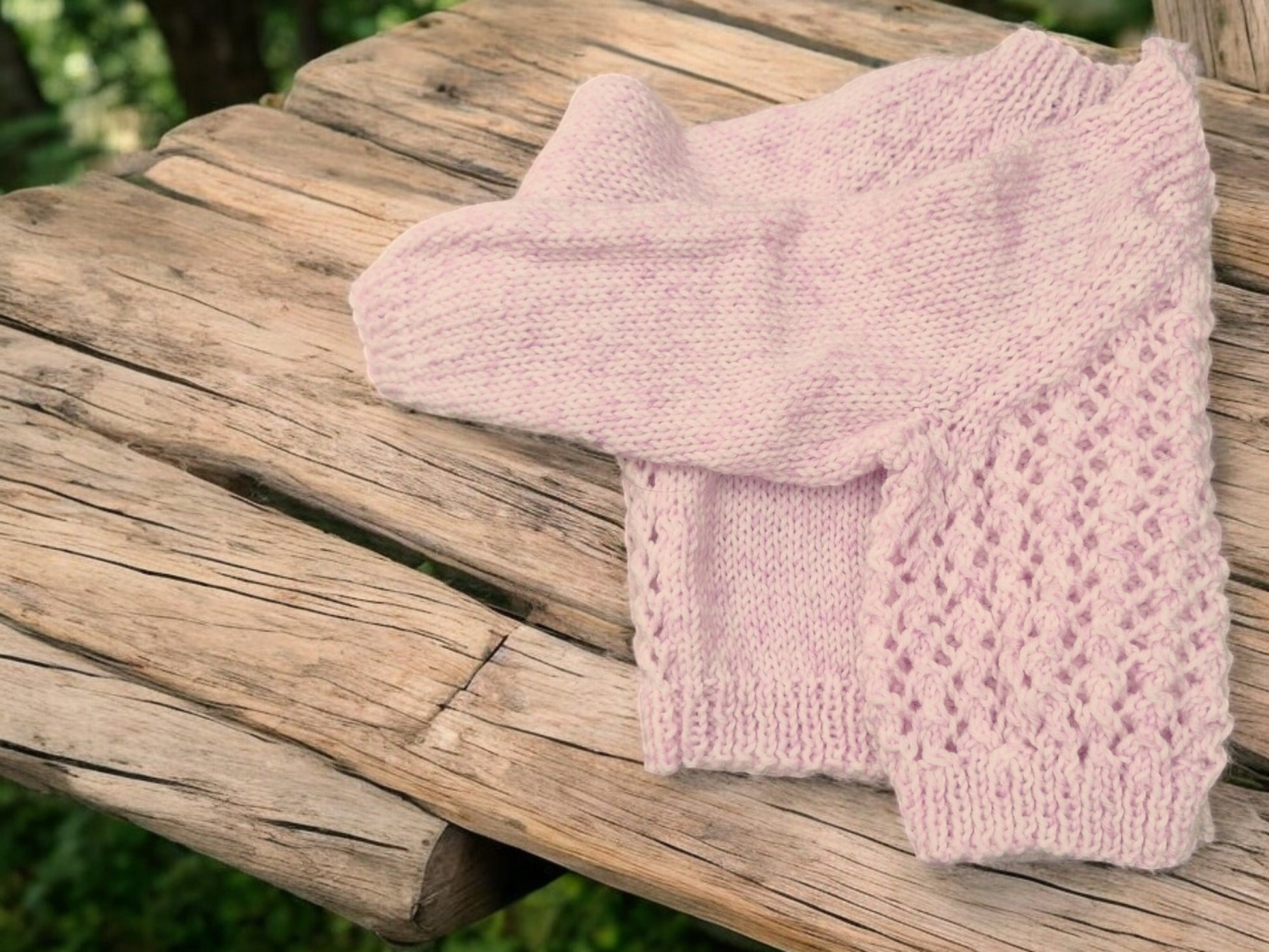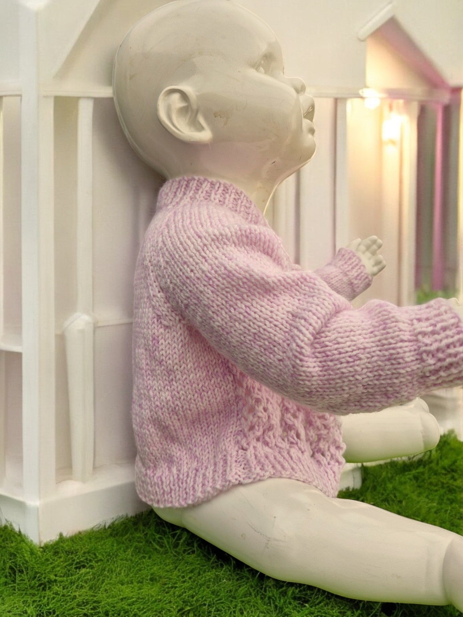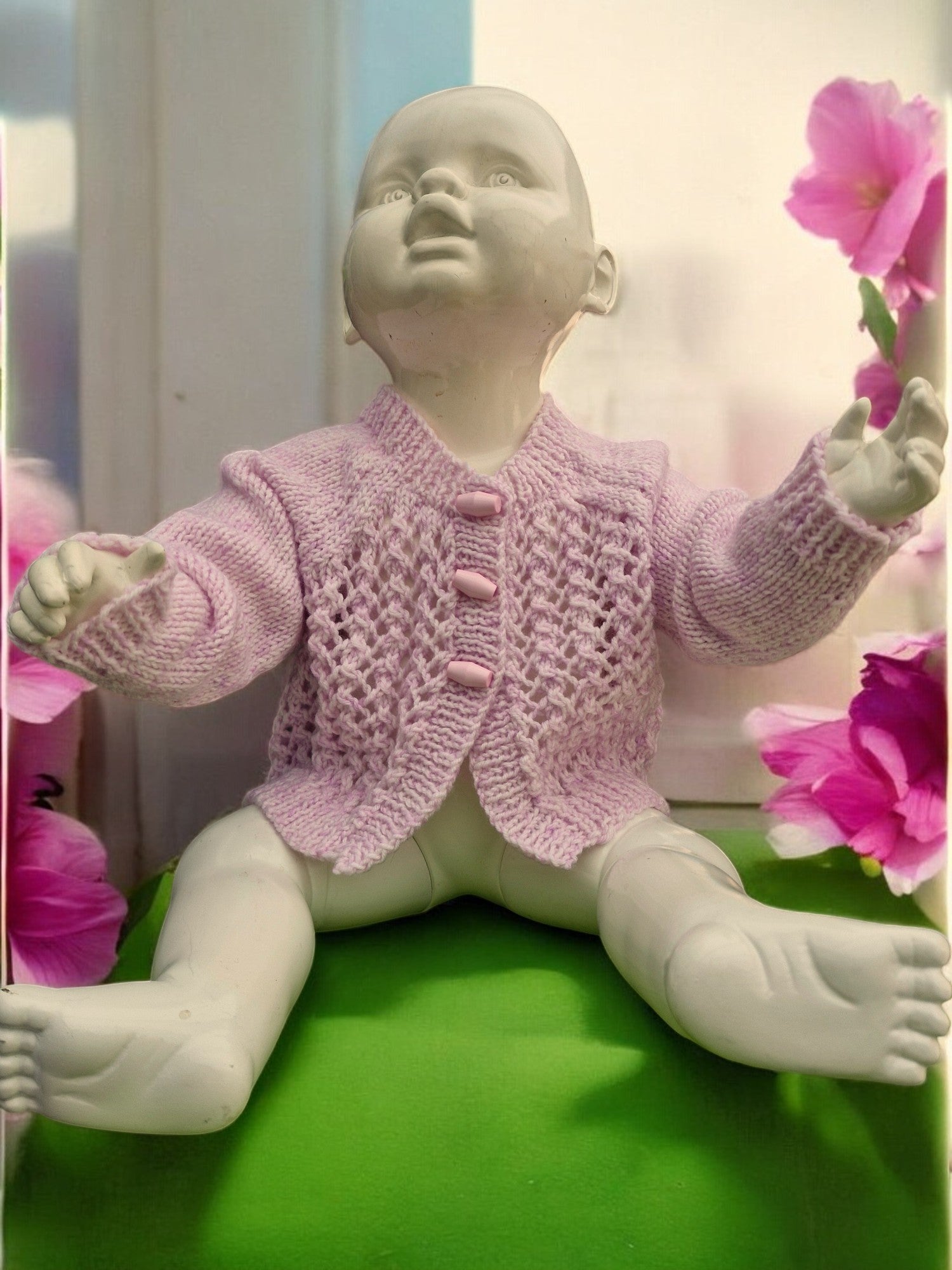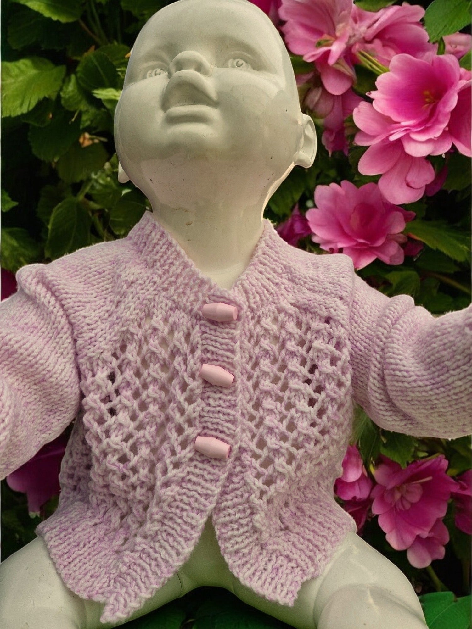 Brand new Baby's Hand Knitted Lacy Jacket in Lilac. Jacket has Round Neck, Long Sleeves and fastens at the neck with 3 small toggle buttons. Yarn is King Cole Baby Pure DK yarn. Made from 100% Acrylic - cool machine wash - DK weight yarn.