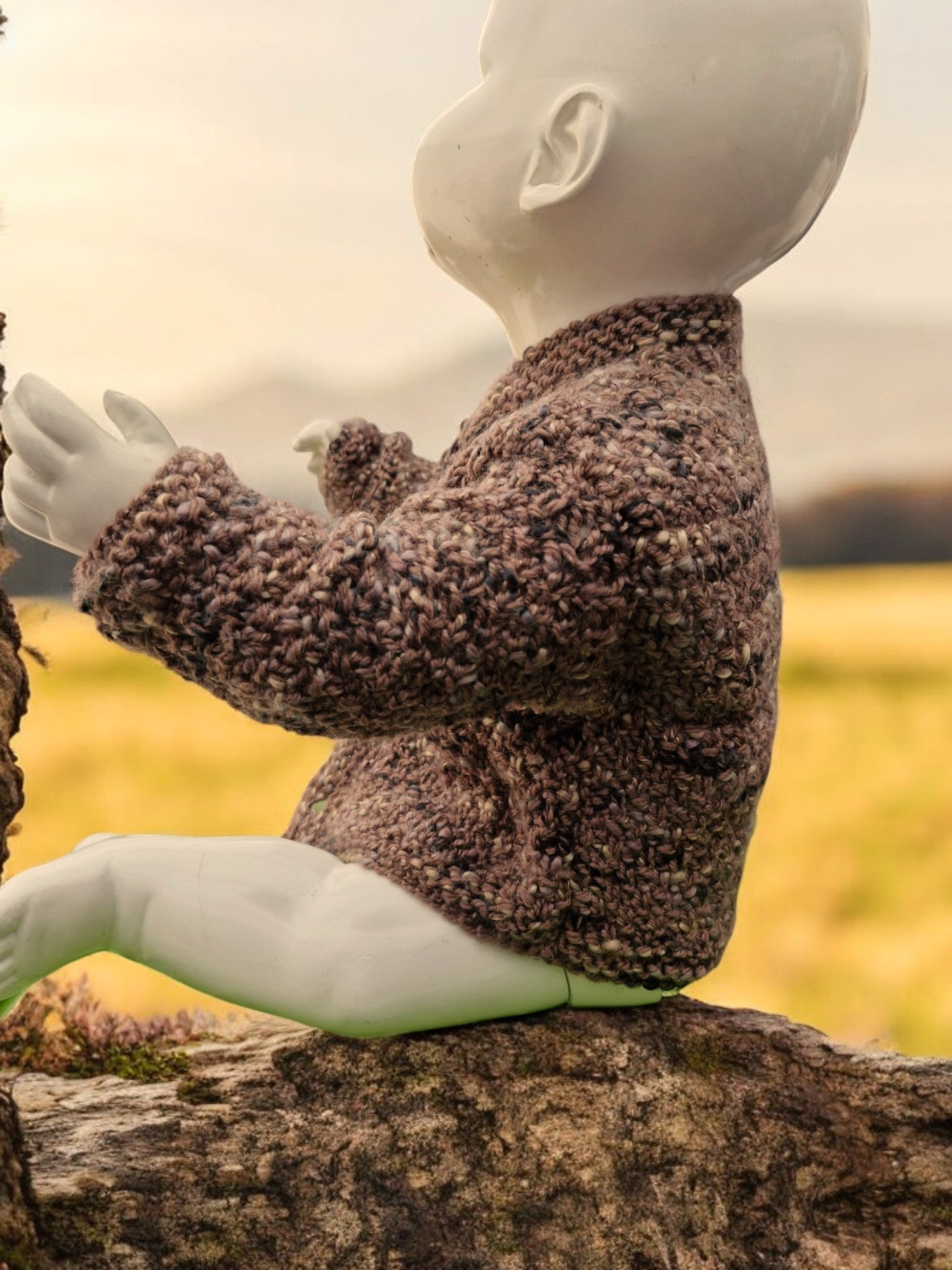 Brand new Baby's Hand Knitted Jacket in Brown Tweed Moss Stitch. Jacket has a round neck, Long Sleeves, two small front Pockets and fastens with 4 Pale Brown Smiley Face Buttons. Machine washable - Aran weight yarn. Yarn used King Cole Fashion Aran (30% Wool, 70% Acrylic).