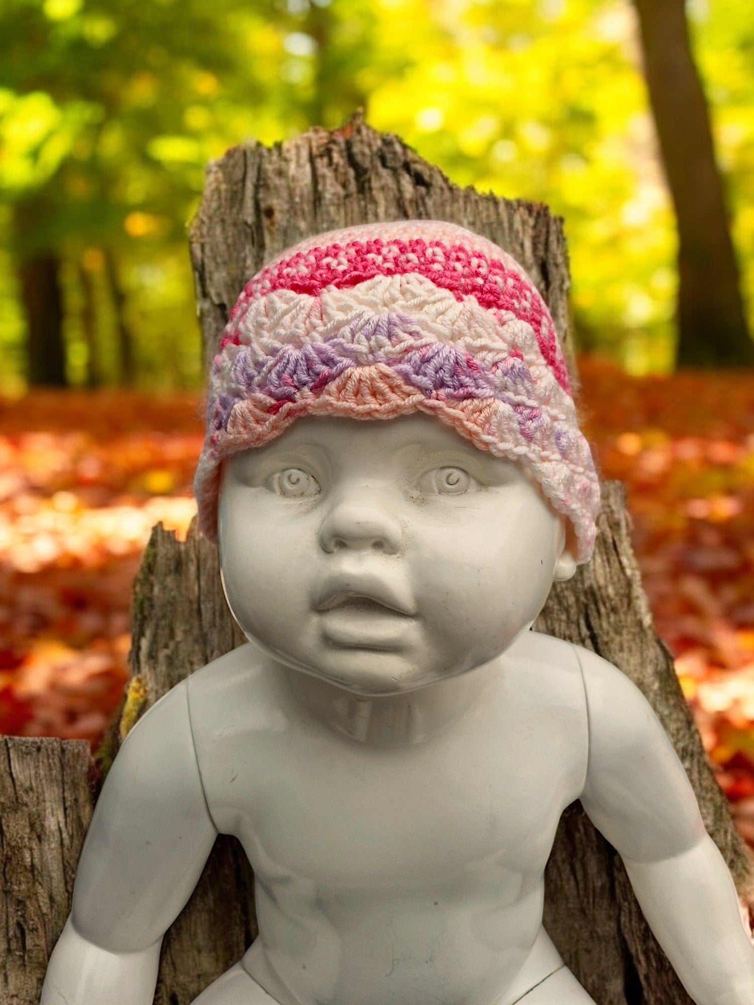 Handmade Baby's Crochet Beanie Style Shell Hat in a mix of Peach, Lilac, Cream, Raspberry. Hat just pulls on with a wide Shell brim. Yarn is variegated which gives random splashes of colour throughout. Made from 100% Acrylic Cherish Baby yarn - machine washable.