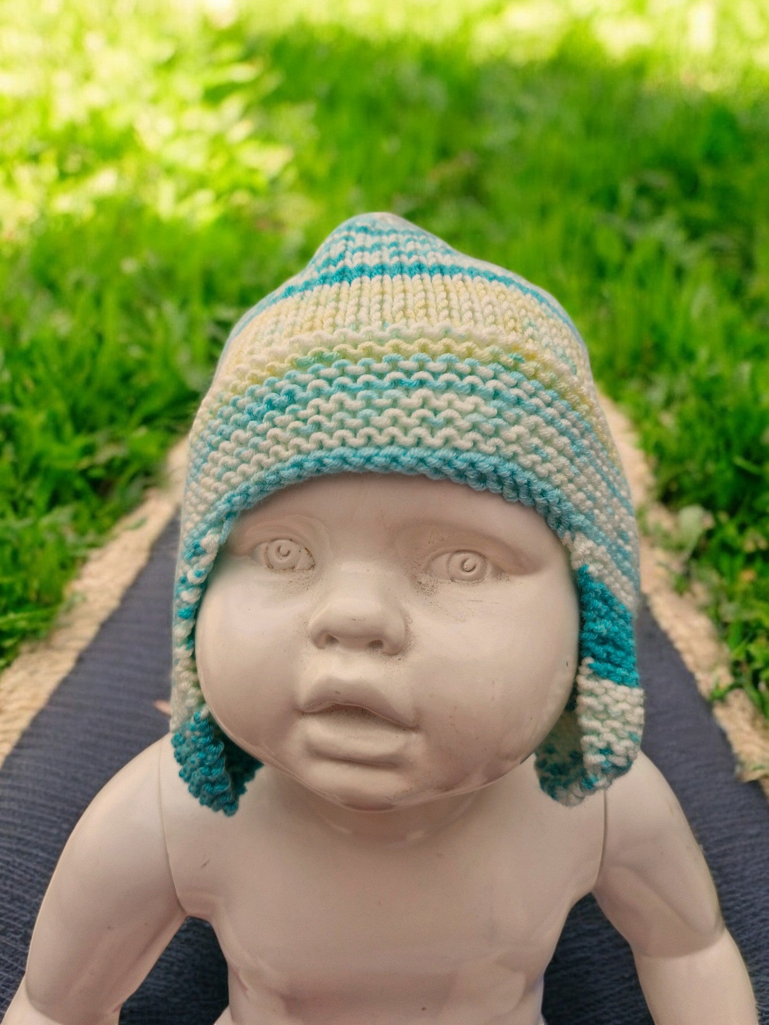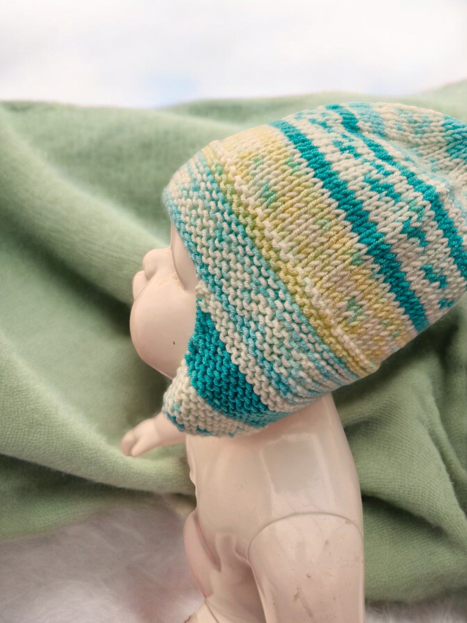 Brand new Baby's Hand Knitted Ear Flap Helmet in Teal Green, Lemon and Cream. Hat just pulls on - no fastenings to avoid choking hazards. Worked in all-over Stocking Stitch pattern. Yarn is variegated, so changes colour throughout the garment making the Fair Isle type design. Made from King Cole Cherish 100% Acrylic yarn - machine washable.