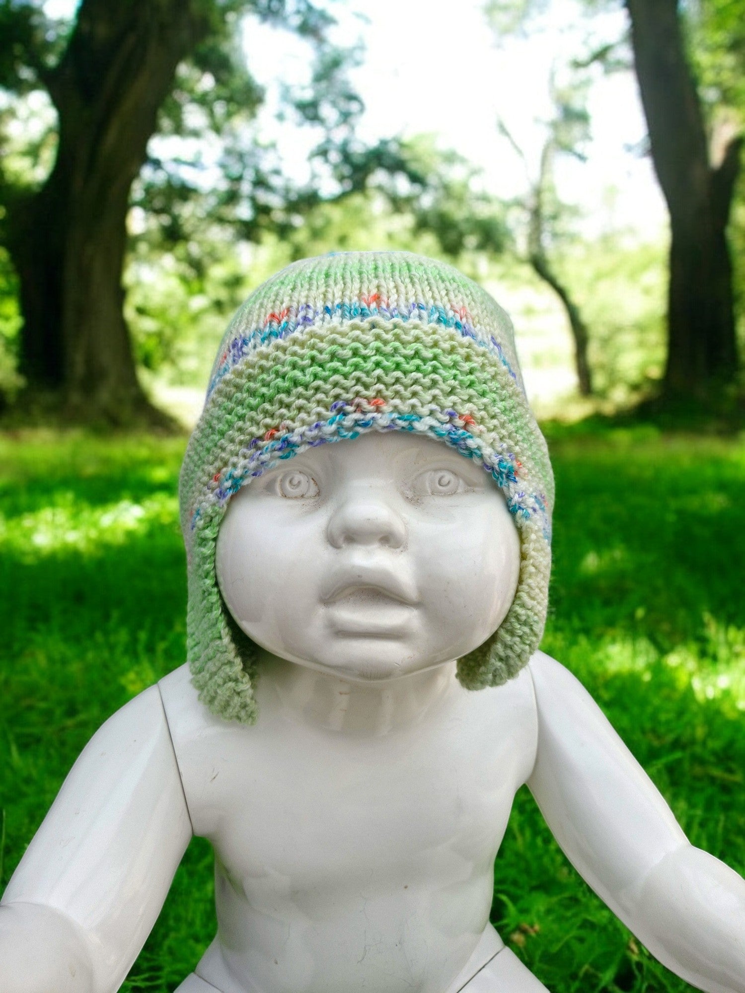Brand new Baby's Hand Knitted Ear Flap Helmet in Greens with Cream, Turquoise, Orange and Blue Tweed stripe. Hat just pulls on - no fastenings to avoid choking hazards. Worked in all-over Stocking Stitch pattern. Yarn is variegated, so changes colour throughout the garment making the stripey design. Made from King Cole Baby Drifter yarn (69% Acrylic, 25% Cotton, 6% Wool) - machine washable.