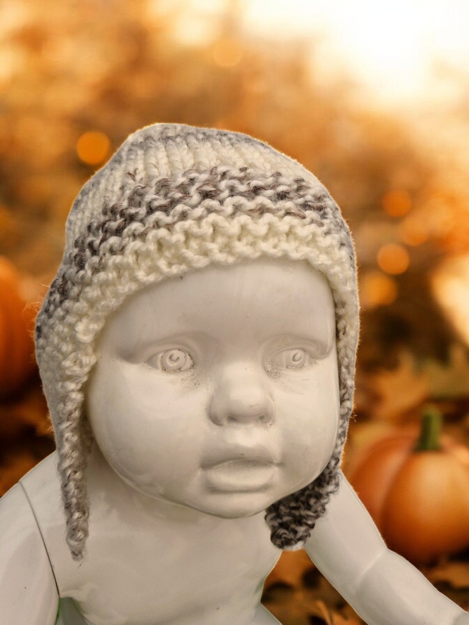 Baby's Handmade Knitted Ear Flap Helmet - Cream/Brown