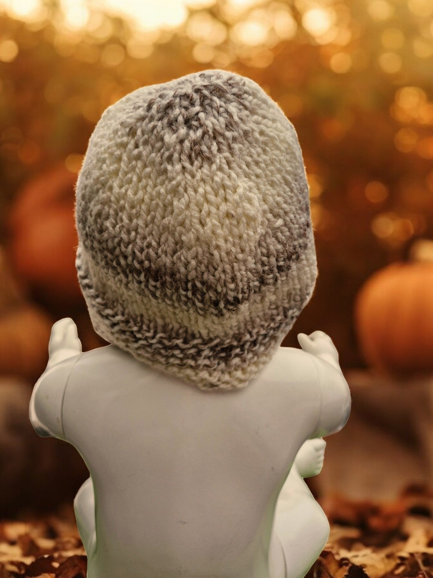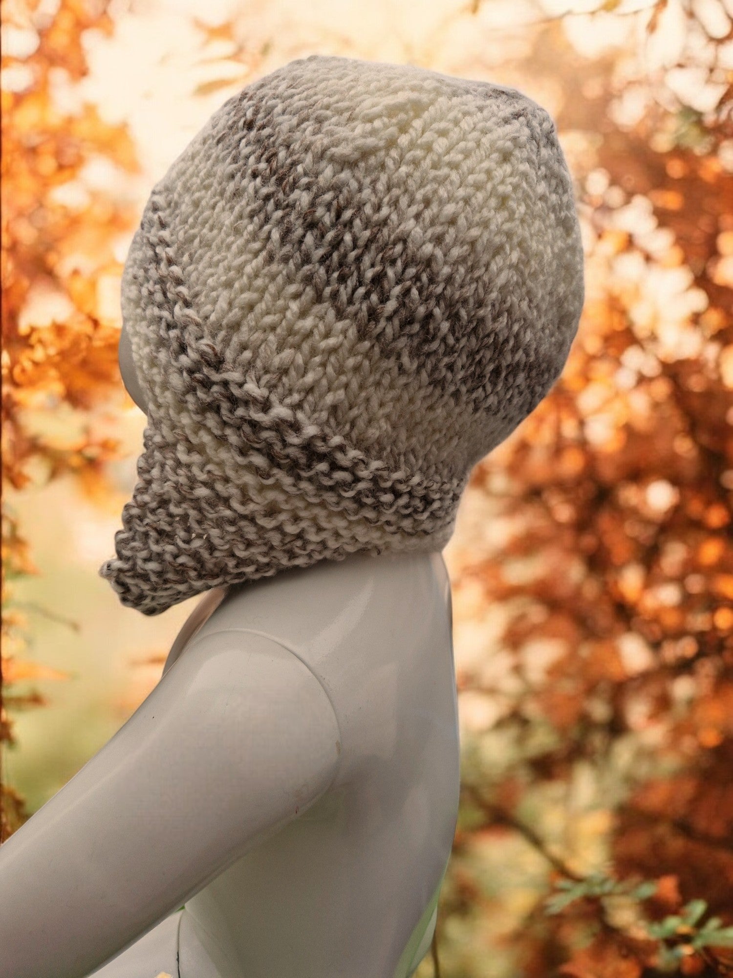 Brand new Baby's Hand Knitted Ear Flap Helmet in Cream with Brown splashes. Hat just pulls on - no fastenings to avoid choking hazards. Worked in all-over Stocking Stitch pattern. Yarn is variegated, so changes colour throughout the garment but it's mostly cream with intermitent Brown splashes. Made from King Cole Baby Soft 100% Acrylic Chunky yarn - machine washable.