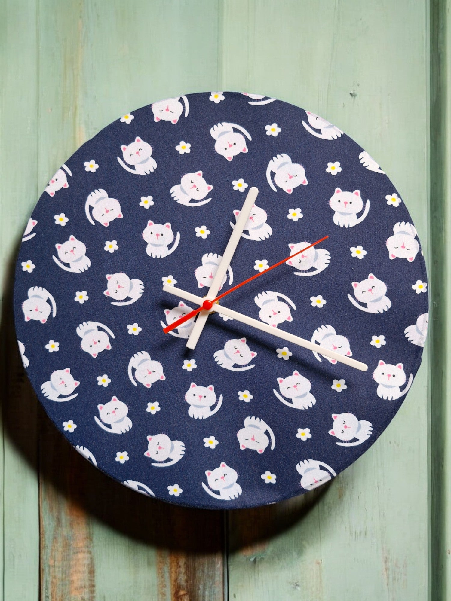 Handmade 30cms Round fully functioning Clock. The 100% cotton fabric has a plain Navy Blue background and features White Cartoon Cats and small daisies. The minute and hour hands are in White with a Burnt Orange second hand.