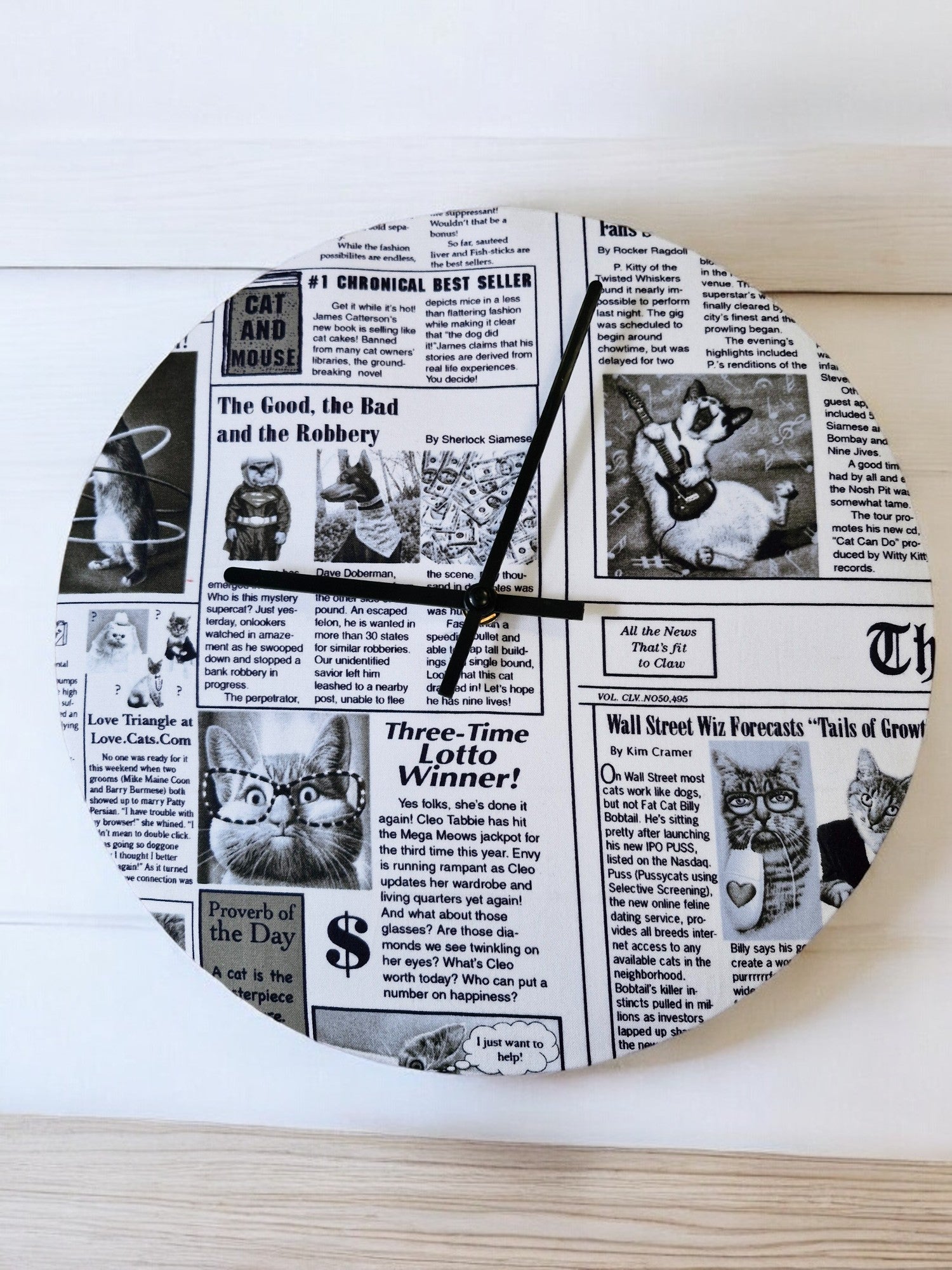 Cat Newspaper Clock Handmade 30cms 12" Diameter