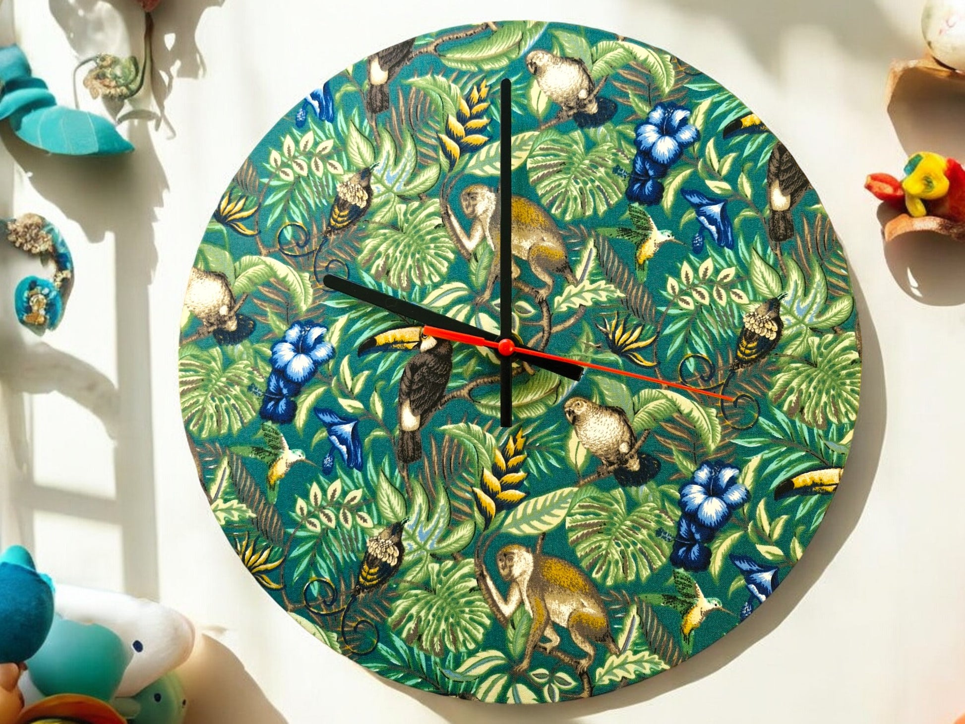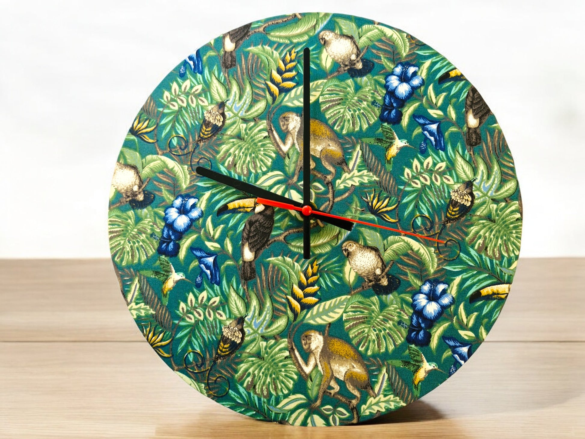 Handmade 30cms Round fully functioning Clock. The 100% cotton fabric has a Green Jungle background and features Monkeys, Pelicans and tropical birds. The minute and hour hands are in Black with a Burnt Orange second hand.