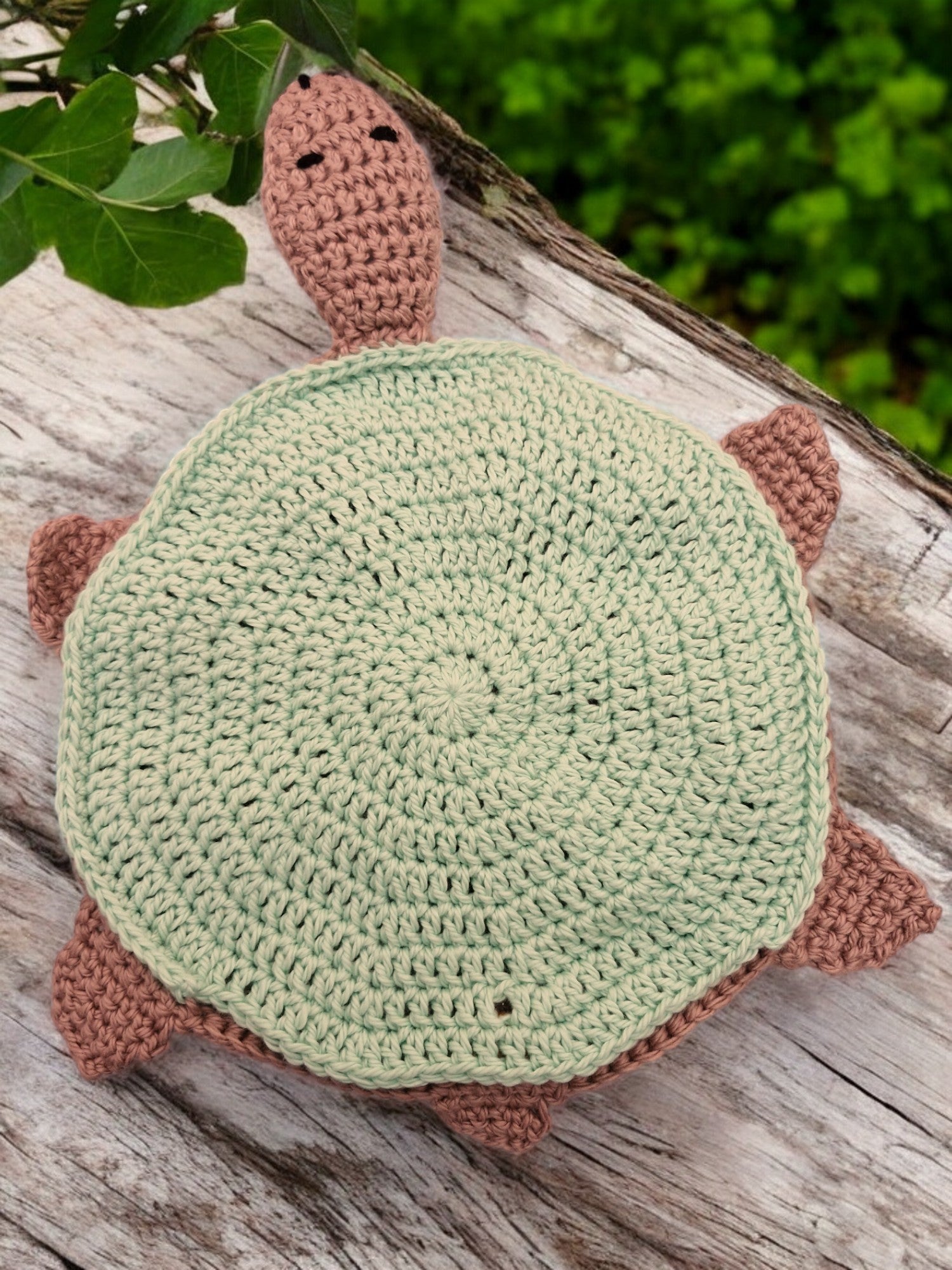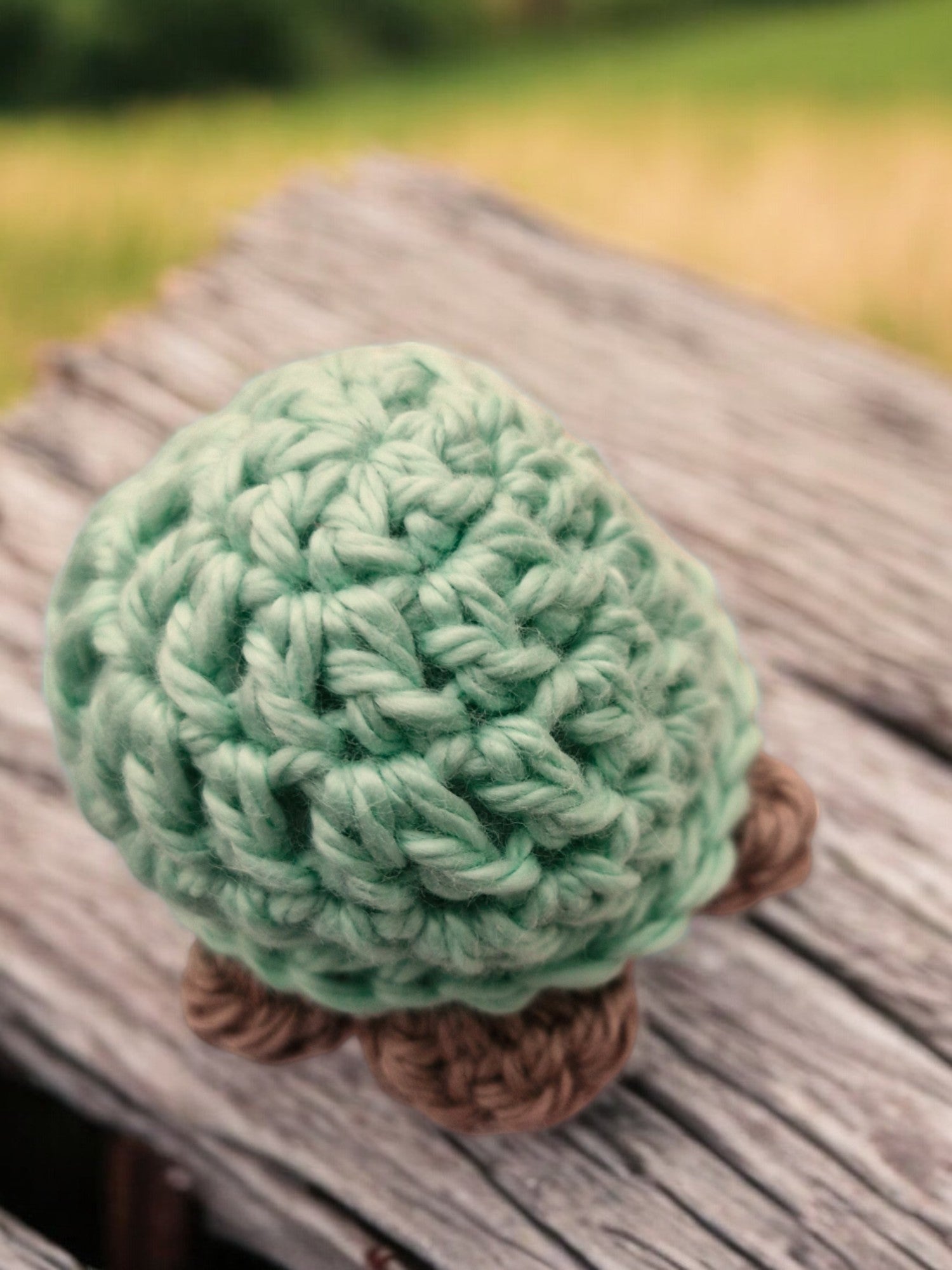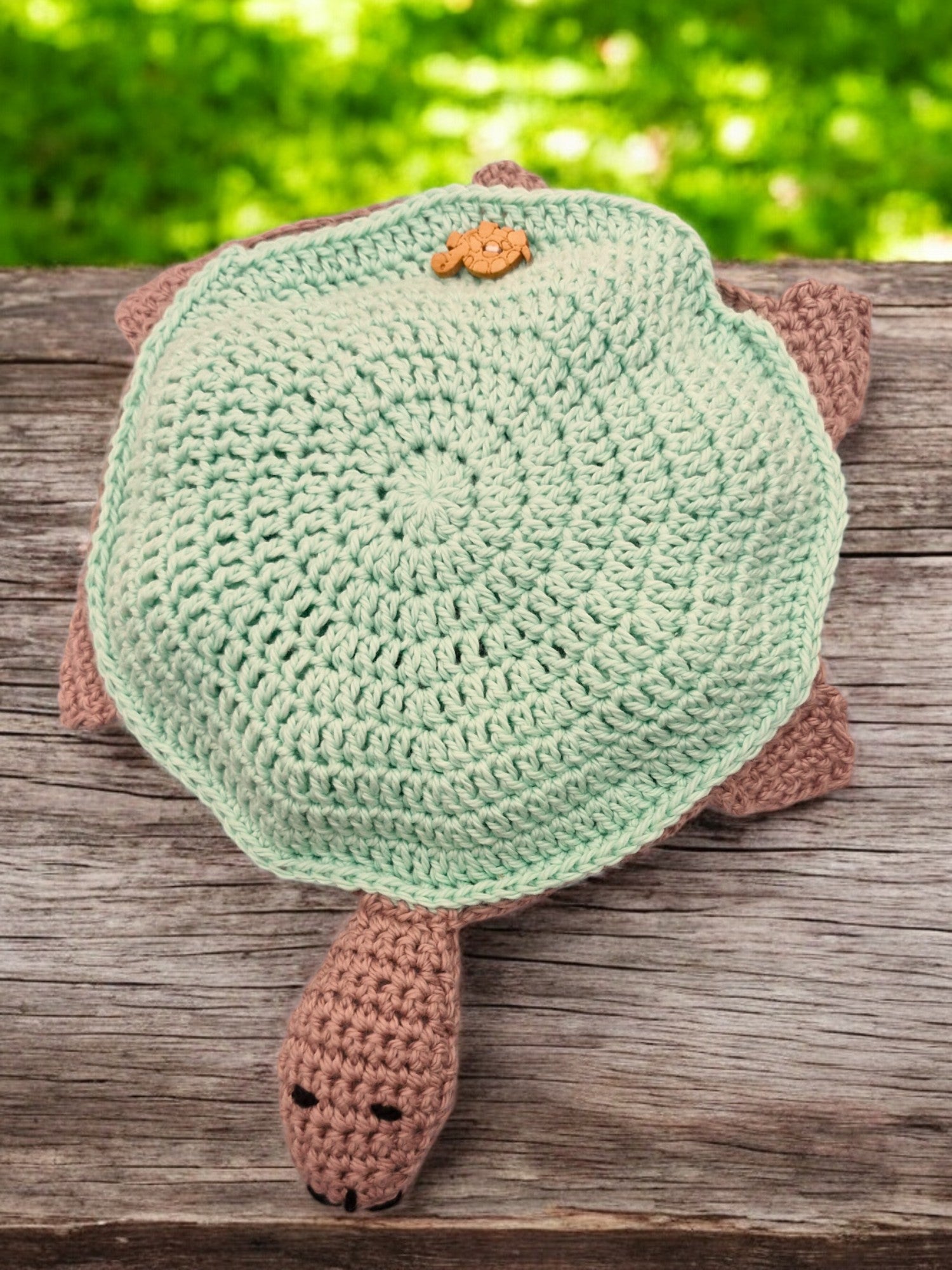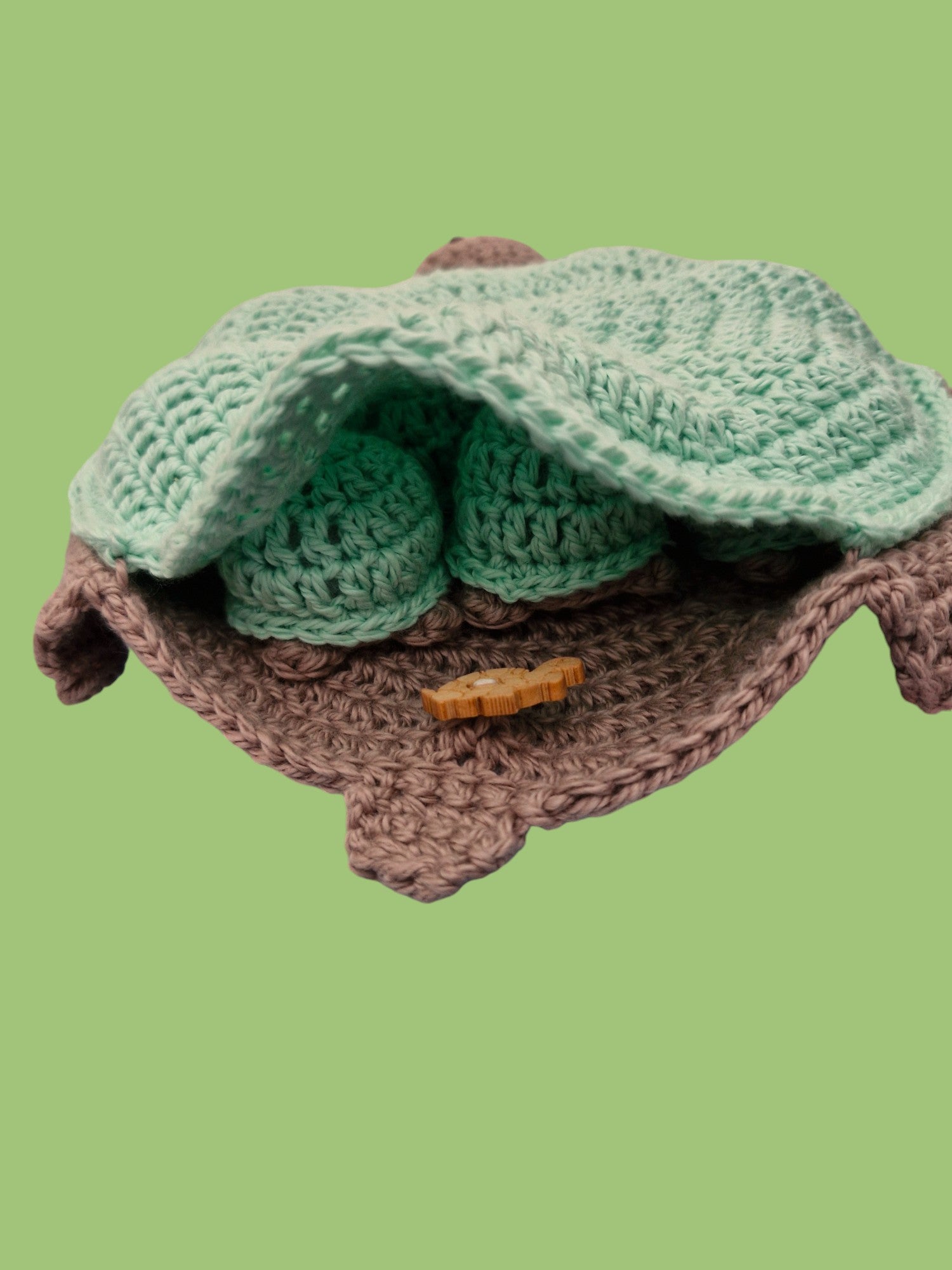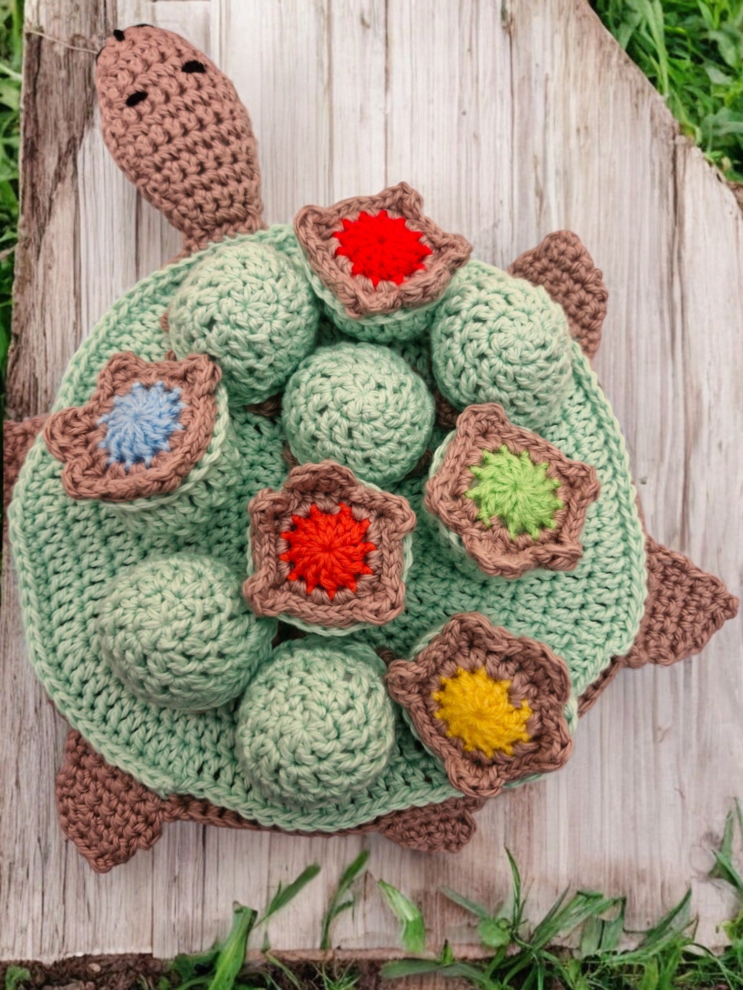 Hand Crocheted Turtle/Tortoise and Babies in Mint Green and Mink Brown Cotton. This a memory and colour learning game for toddlers and small children. One large Turtle contains 10 Baby Turtles which have coloured under bellies - 2 in each colour. Babies are stood right way up at the start of the game, two turtles are turned over to see if they match if not they are stood back up to try again. Teaches memory and colour learning, whilst being a lot of fun.