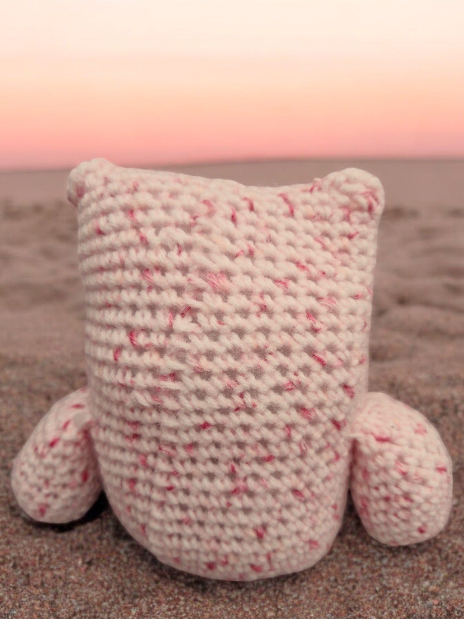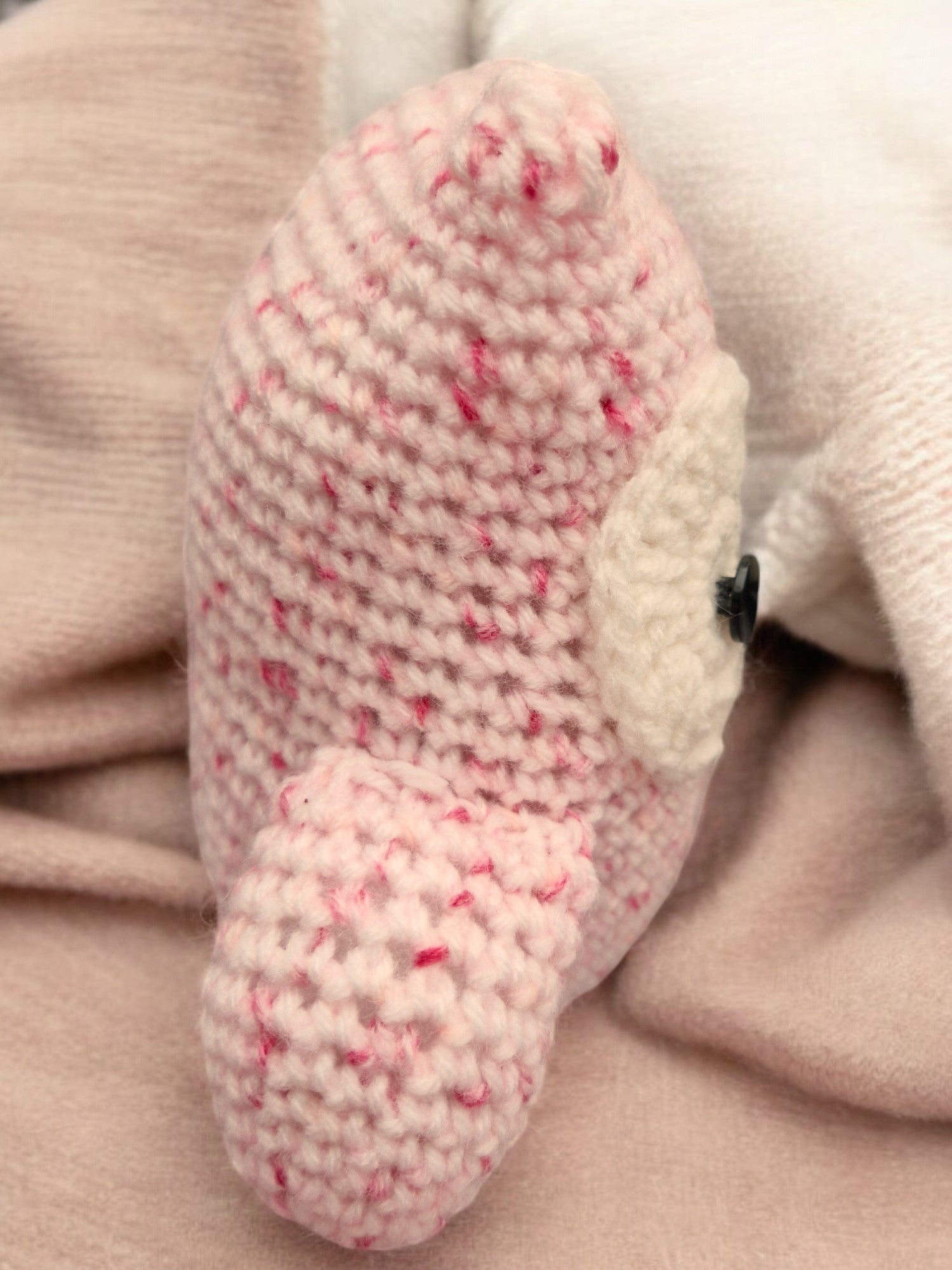 Hand Crocheted Owl in Pink Fleck DK. Owl is knitted with King Cole DK Pink Fleck yarn and stuffed with flame proof toy stuffing. Two large eyes with Black stemmed buttons for the centres. Yarn is soft and cuddly. Made from 100% acrylic - machine wash.