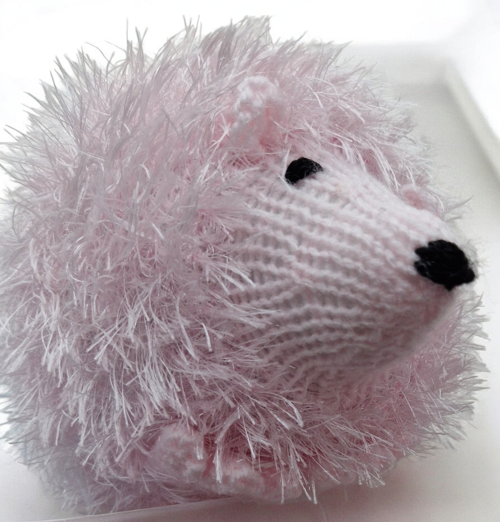 Hand Knitted Hedgehog in Pink Tinsel. Owl is knitted with King Cole Tinsel yarn and stuffed with flame proof toy stuffing. Two hand stitched eyes in Black, two Pink ears and Pink feet complete the effect . Yarn is soft and cuddly - this isn't real tinsel it's much softer. Made from 100% Polyester - cool machine wash.