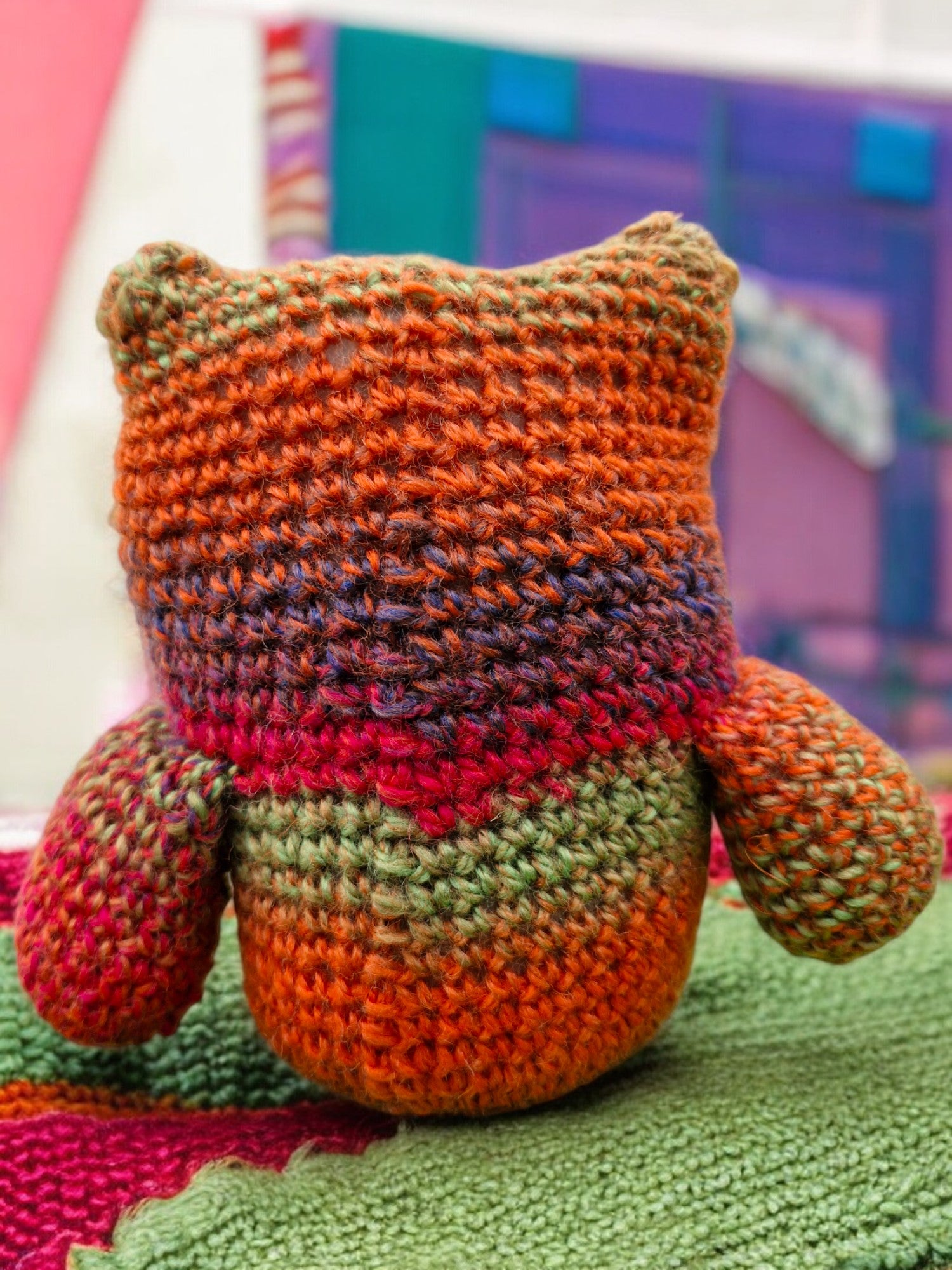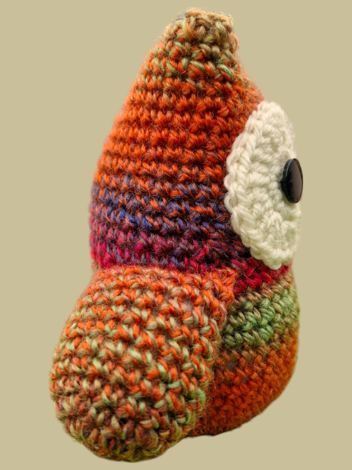 Hand Crocheted Owl in Rust Orange, Red, Brown and Green. Owl is knitted with King Cole Riot DK variegated yarn and stuffed with flame proof toy stuffing. Two large eyes with Black stemmed buttons for the centres. Yarn is soft and cuddly. Made from 70% acrylic,30% Wool - cool machine wash.