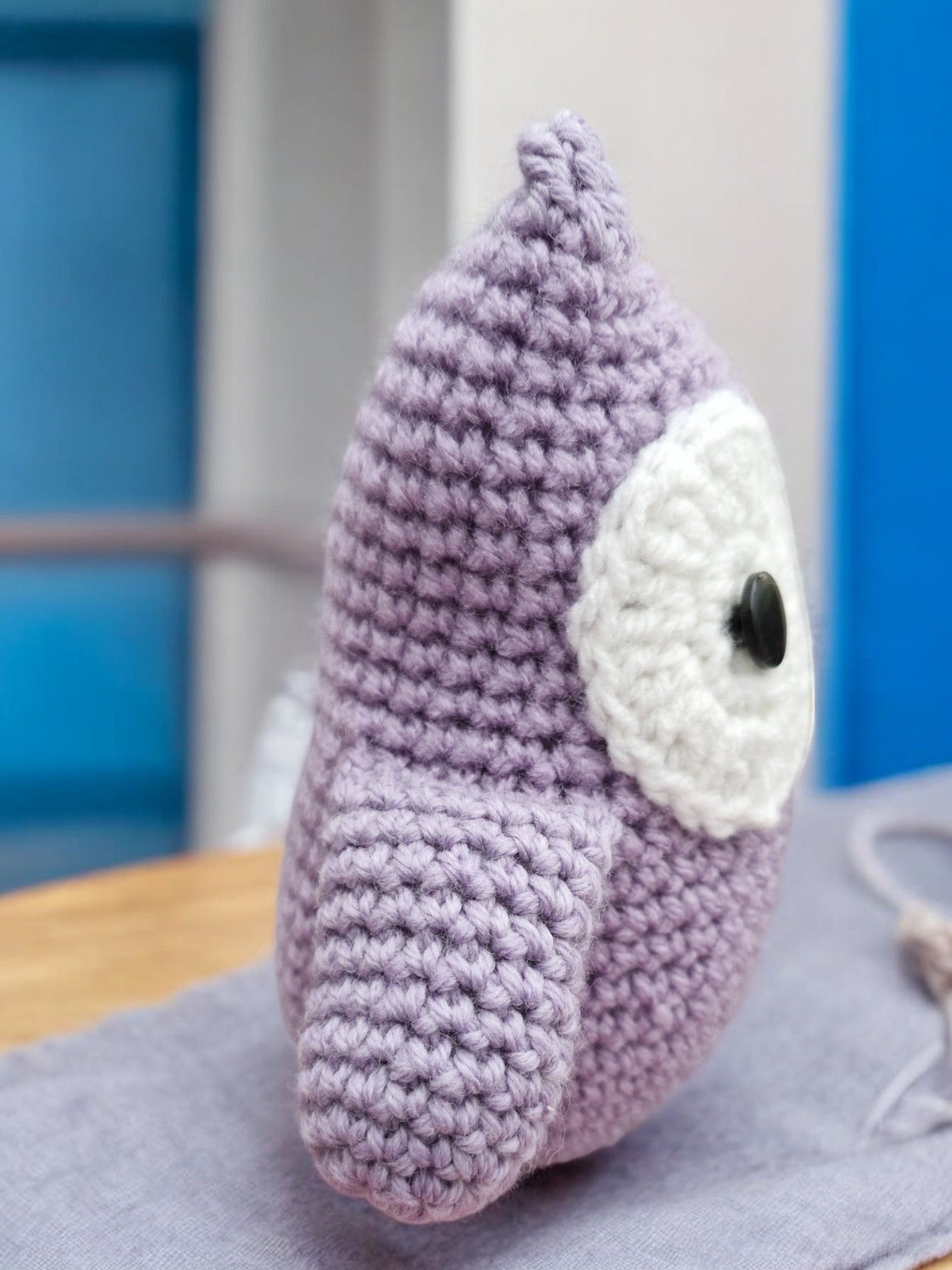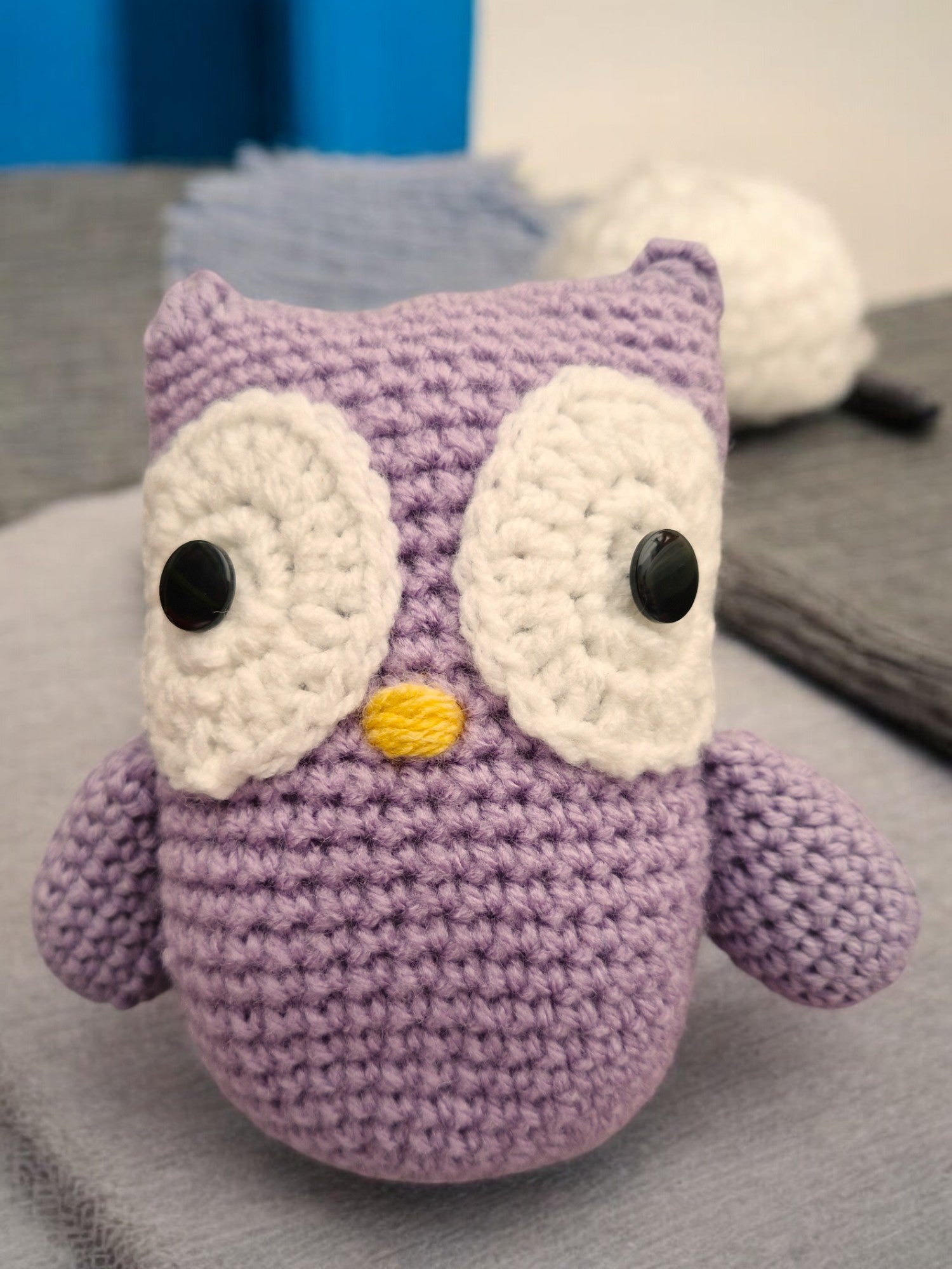 Hand Crocheted Owl in Purple DK. Owl is knitted with King Cole Pricewise DK yarn and stuffed with flame proof toy stuffing. Two large eyes with Black stemmed buttons for the centres. Yarn is soft and cuddly. Made from 100% acrylic - machine wash.