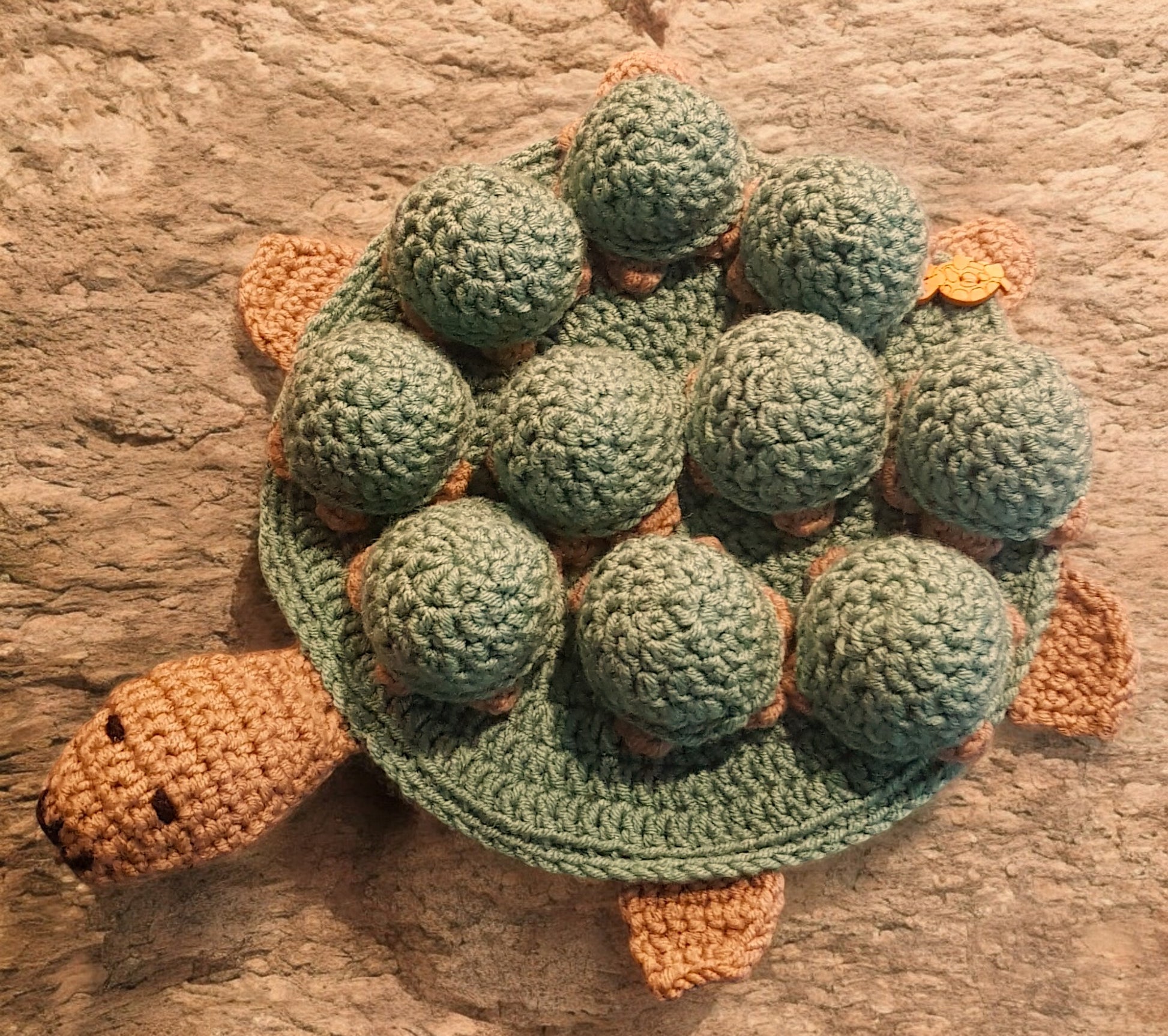 The baby turtles fit inside the Mother Turtle which then closes with a wooden Turtle button. All Turtles are made from King Cole Cherished Baby DK yarn. Baby Turtles are stuffed with flame proof toy stuffing. Yarn is 100% Acrylic - machine washable.