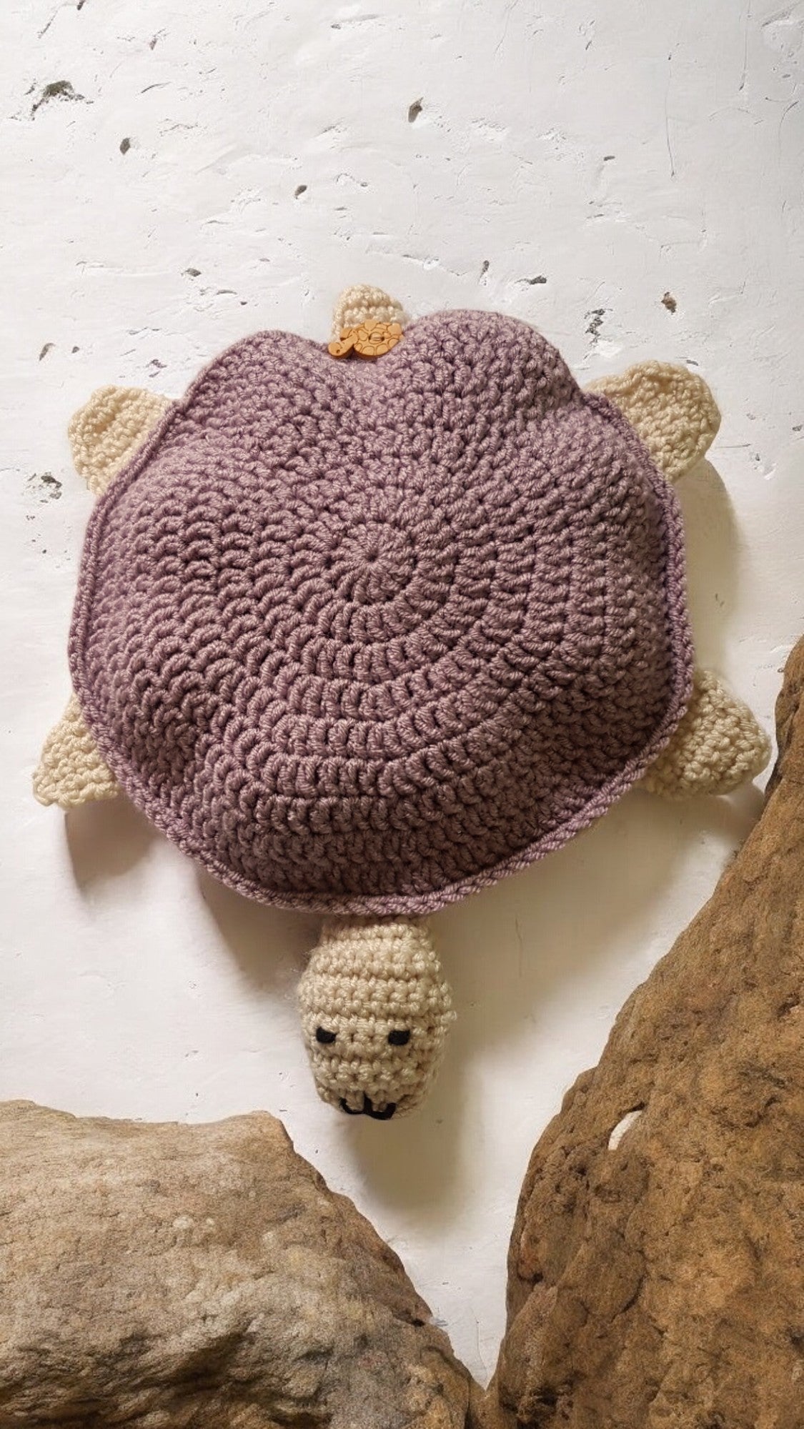 Hand Crocheted Turtle/Tortoise and Babies in Mulberry and Beige. This a memory and colour learning game for toddlers and small children. One large Turtle contains 10 Baby Turtles which have coloured under bellies - 2 in each colour. Babies are stood right way up at the start of the game, two turtles are turned over to see if their belly colours match, if not they are stood back up to try again. Teaches memory and colour learning, whilst being a lot of fun.