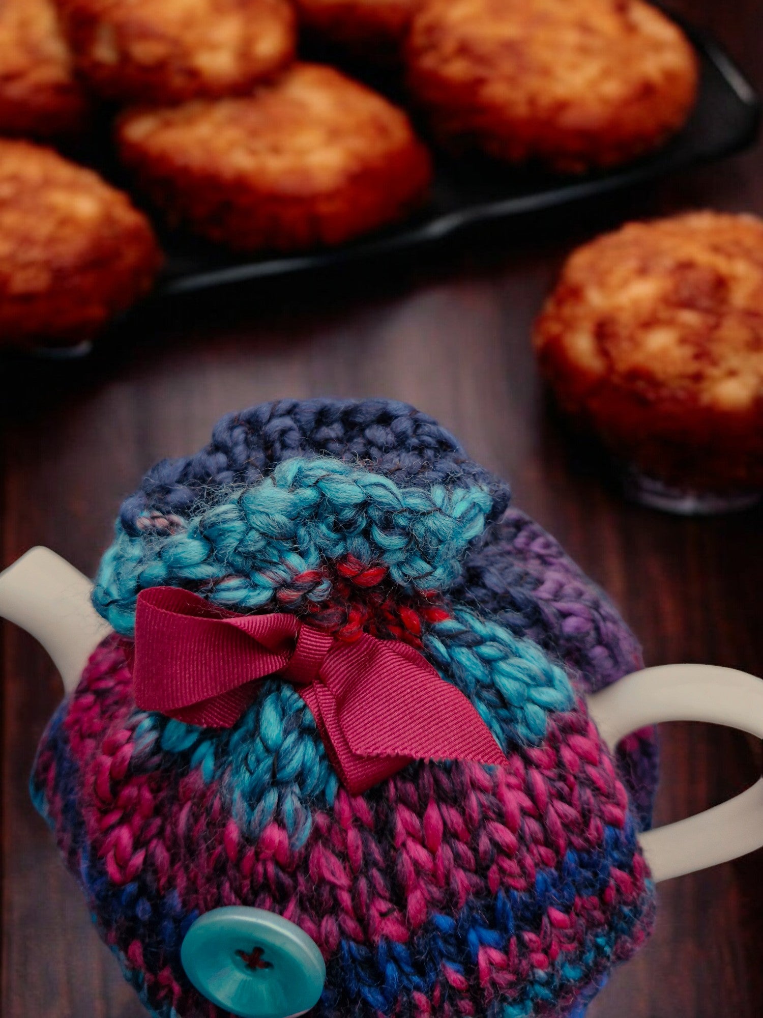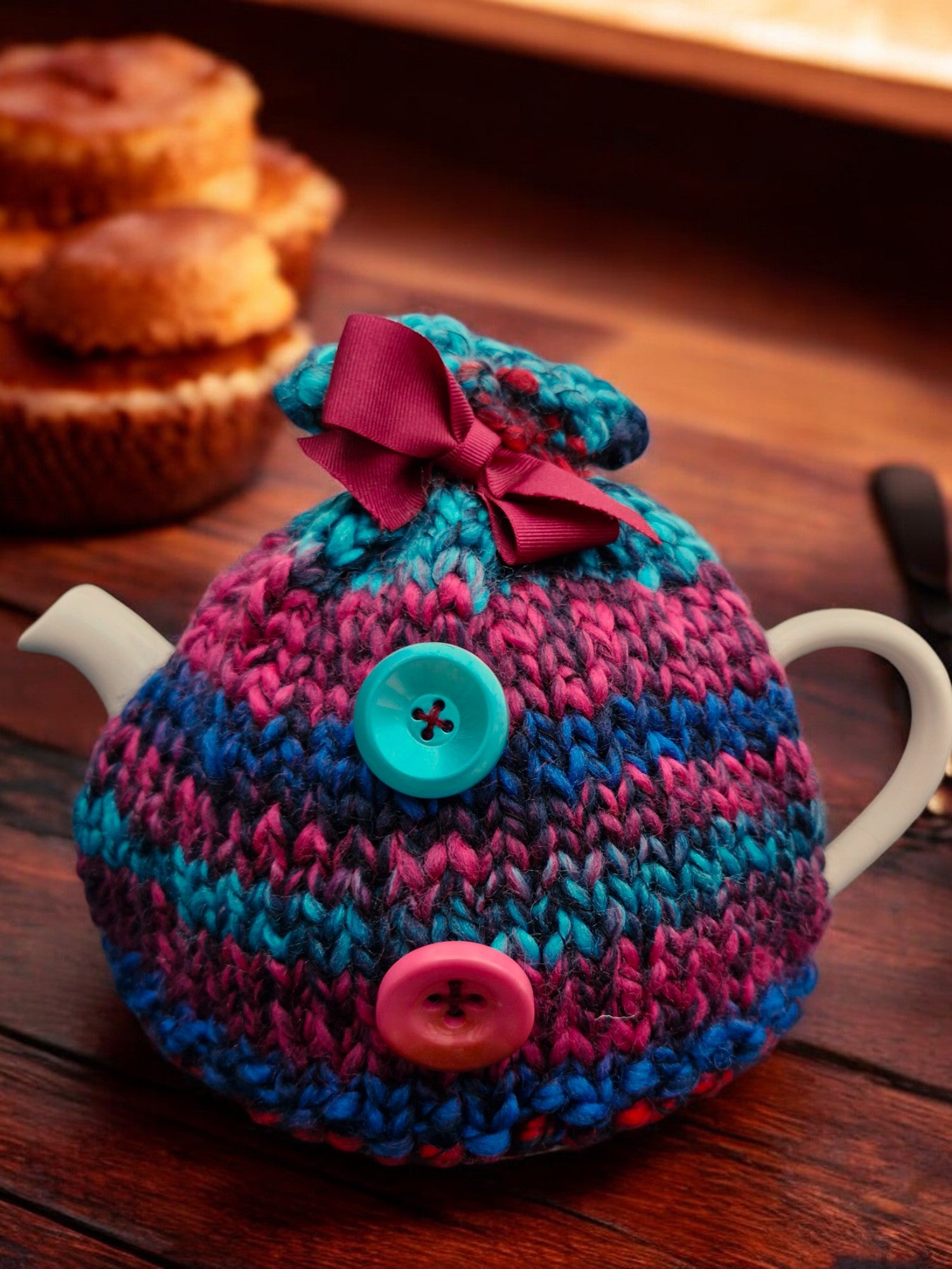 Brand new Hand Knitted Thick Super Chunky Small Tea Cosy in Red, Navy, Dark Cerise and Dark Turquoise with thin Black Twist. Tea Cosy is made from Super Chunky Yarn, alternating through the colours and decorated with large chunky Dark Turquoise and Cerise buttons and a Blood Red Ribbed Ribbon to fasten and gather the top. Yarn is made from 50% acrylic, 50% Wool - requires cool machine wash.