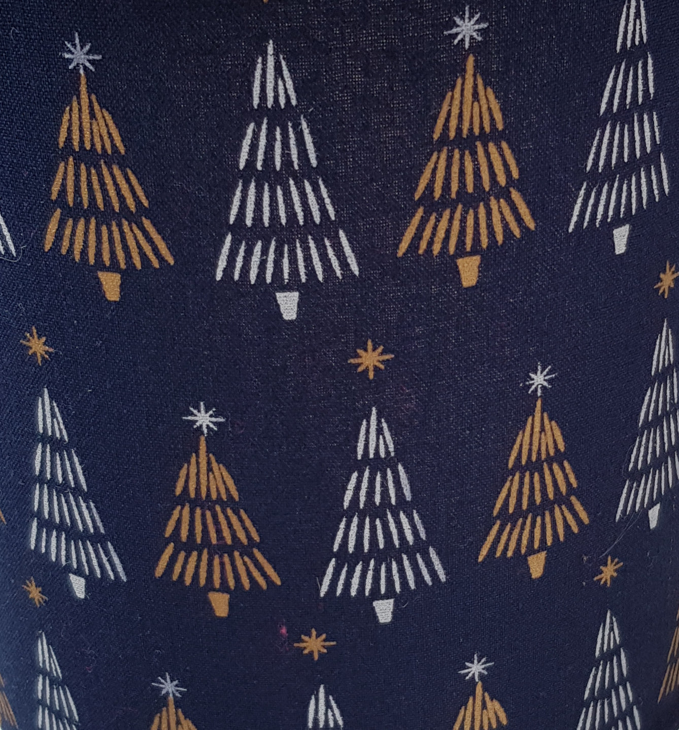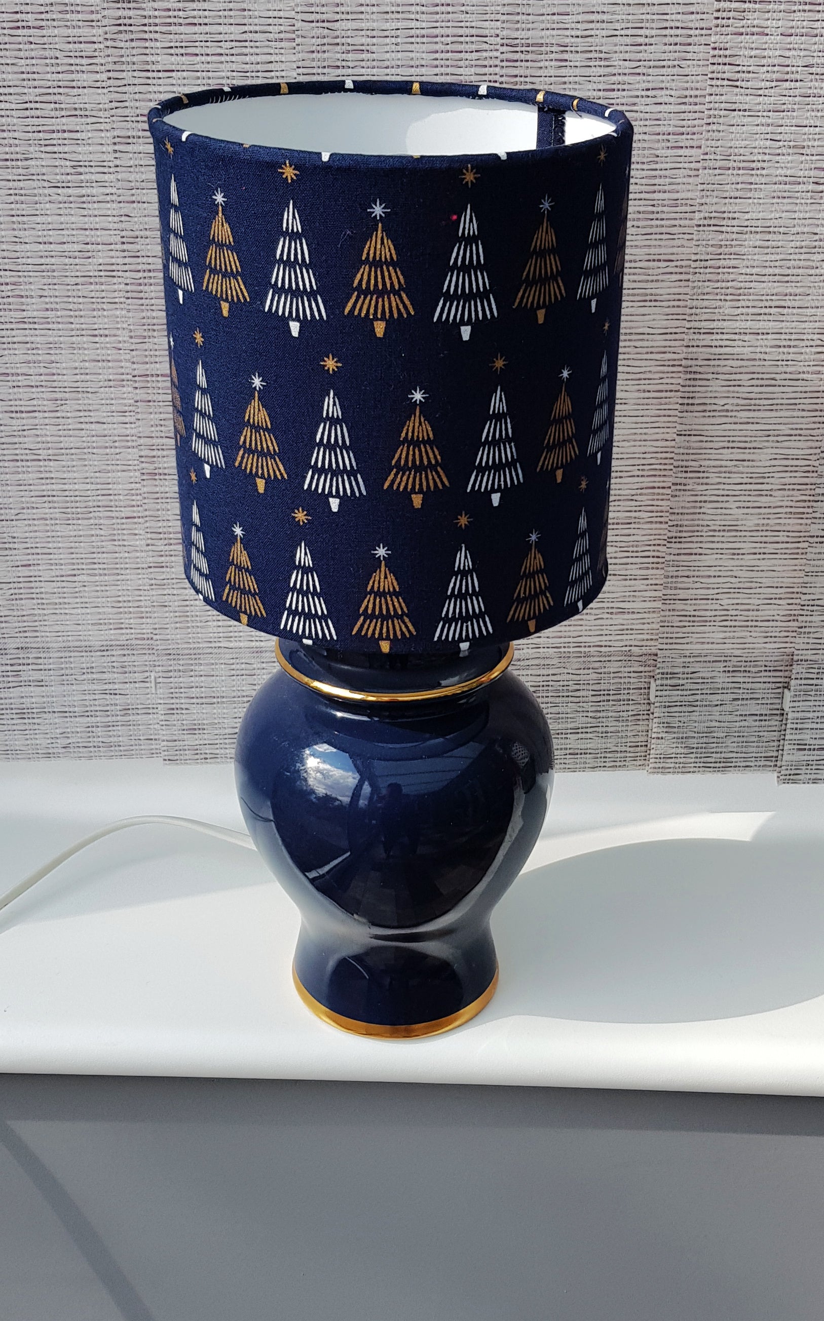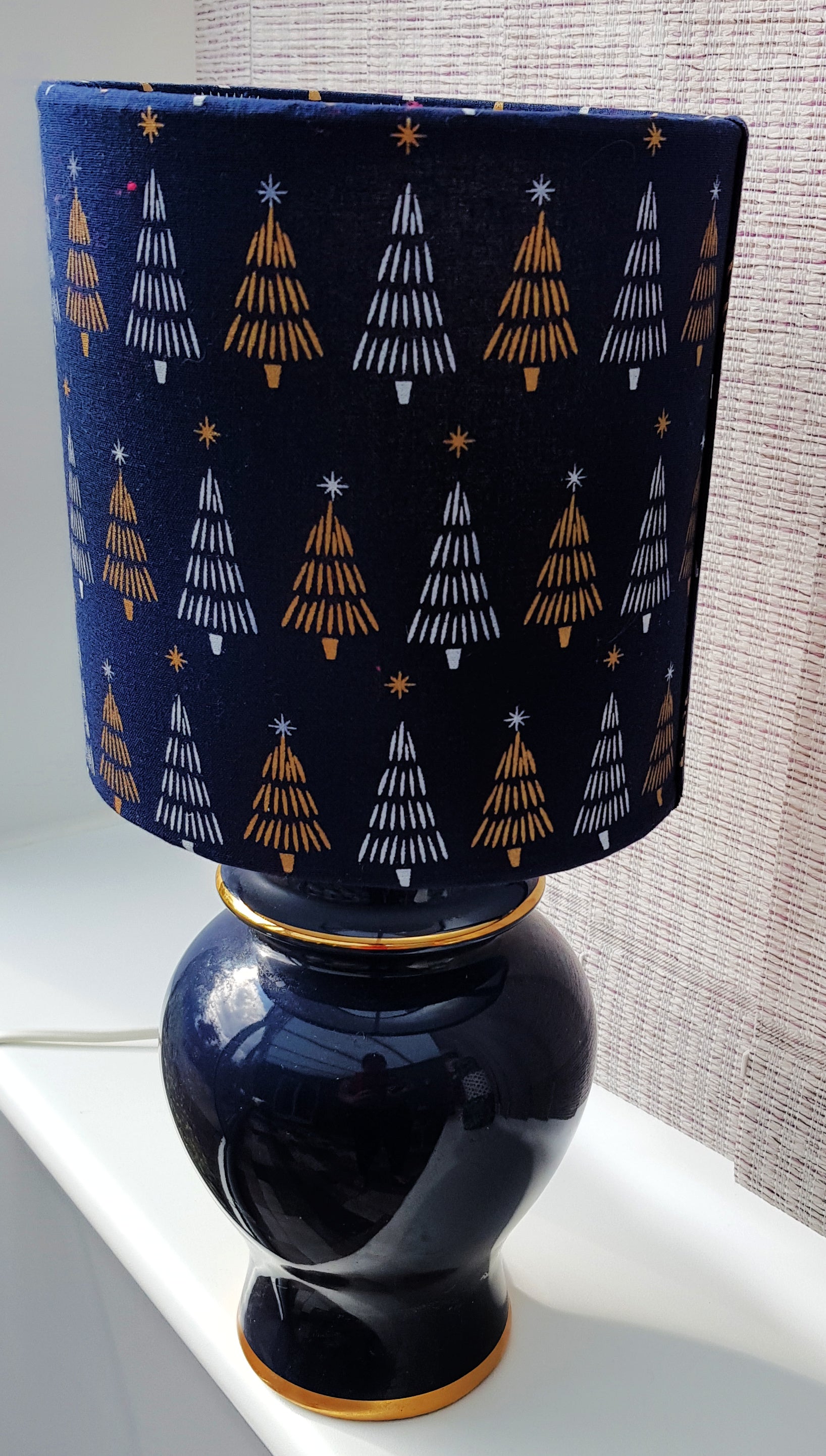 Handmade table, shelf or bedside unit lampshade. The 100% cotton fabric has a dark Navy Blue background and features Gold and White Christmas Trees.