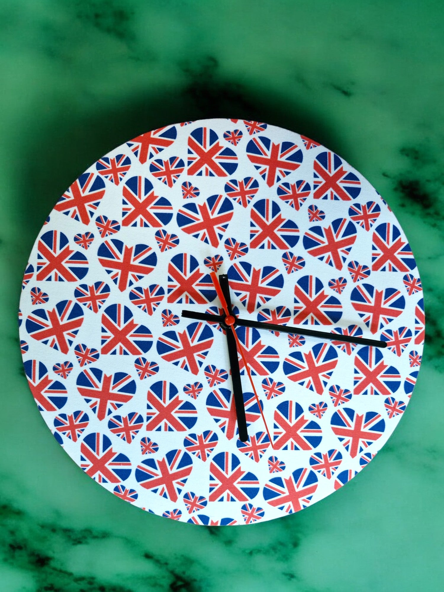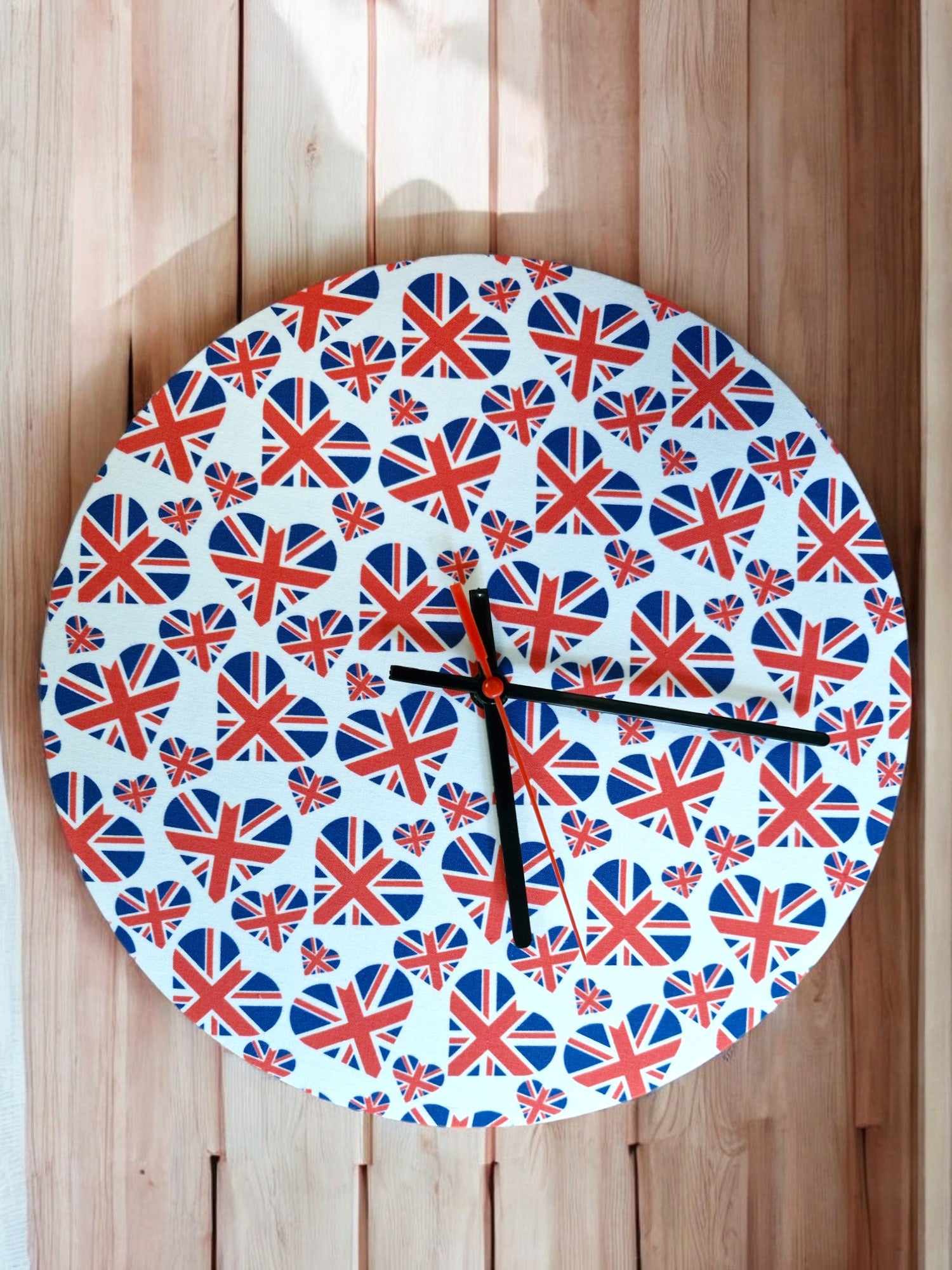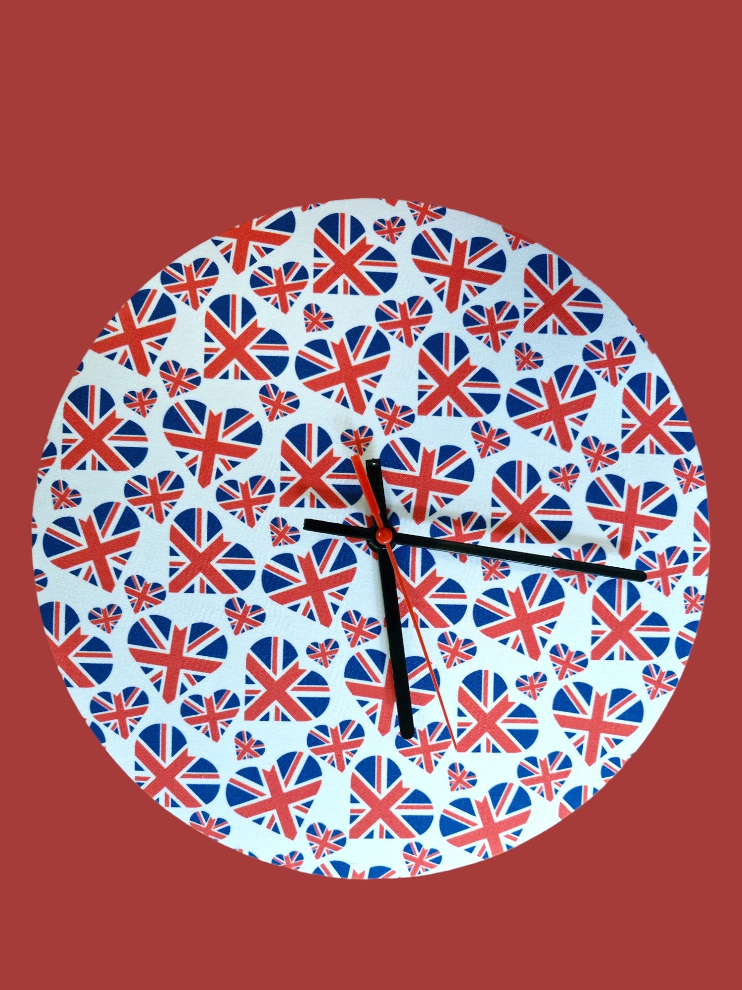 Brand new 30cms Round Clock featuring UK flag in Hearts