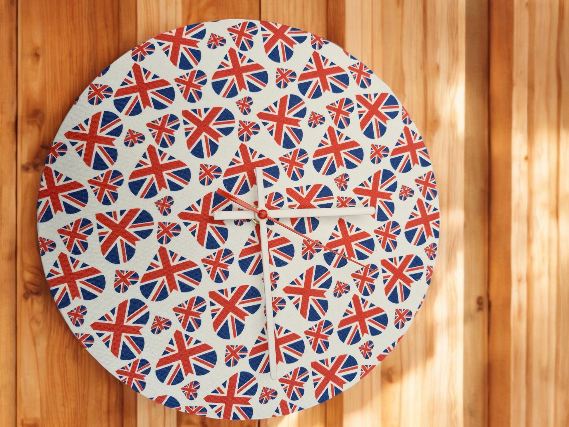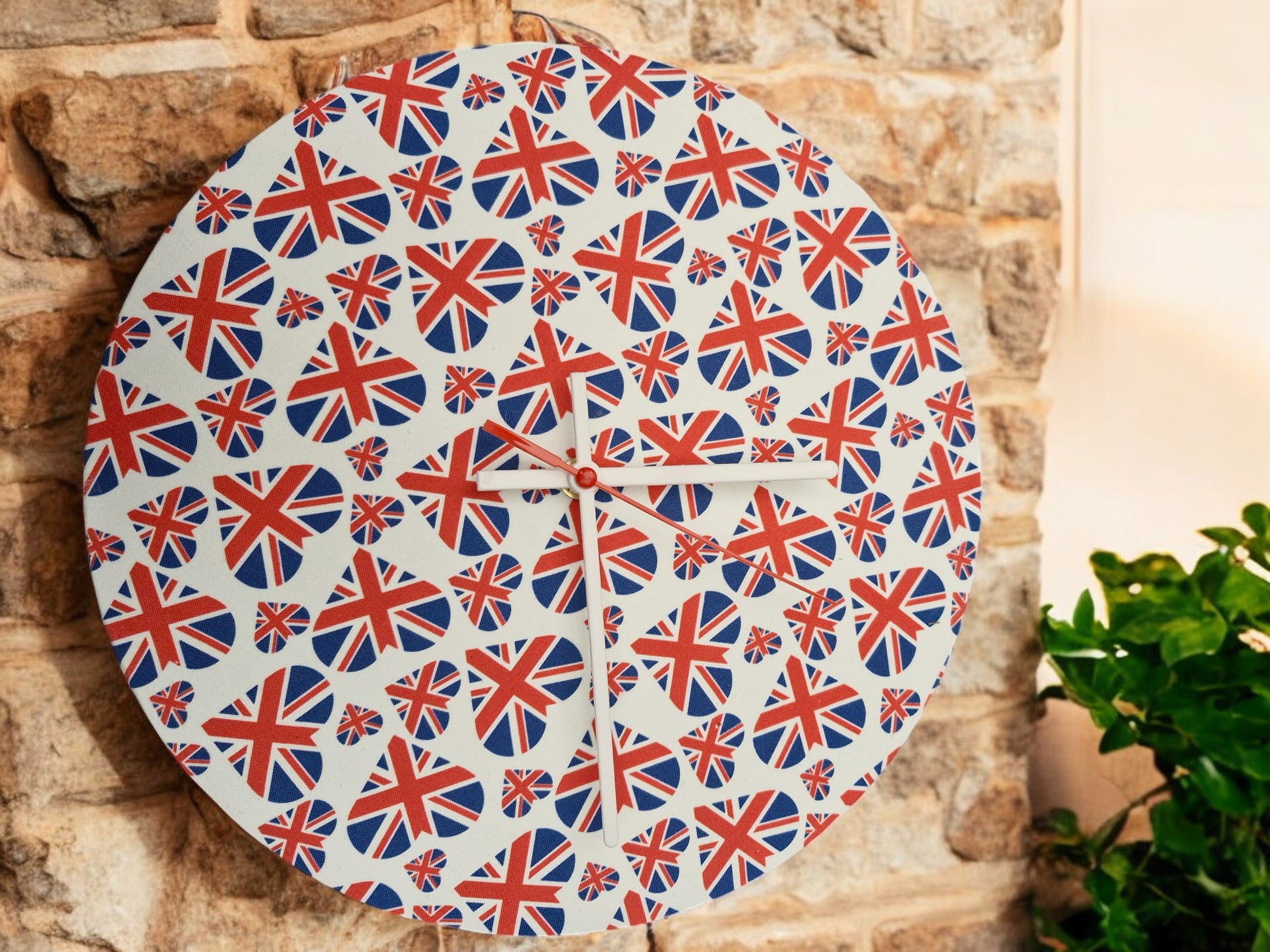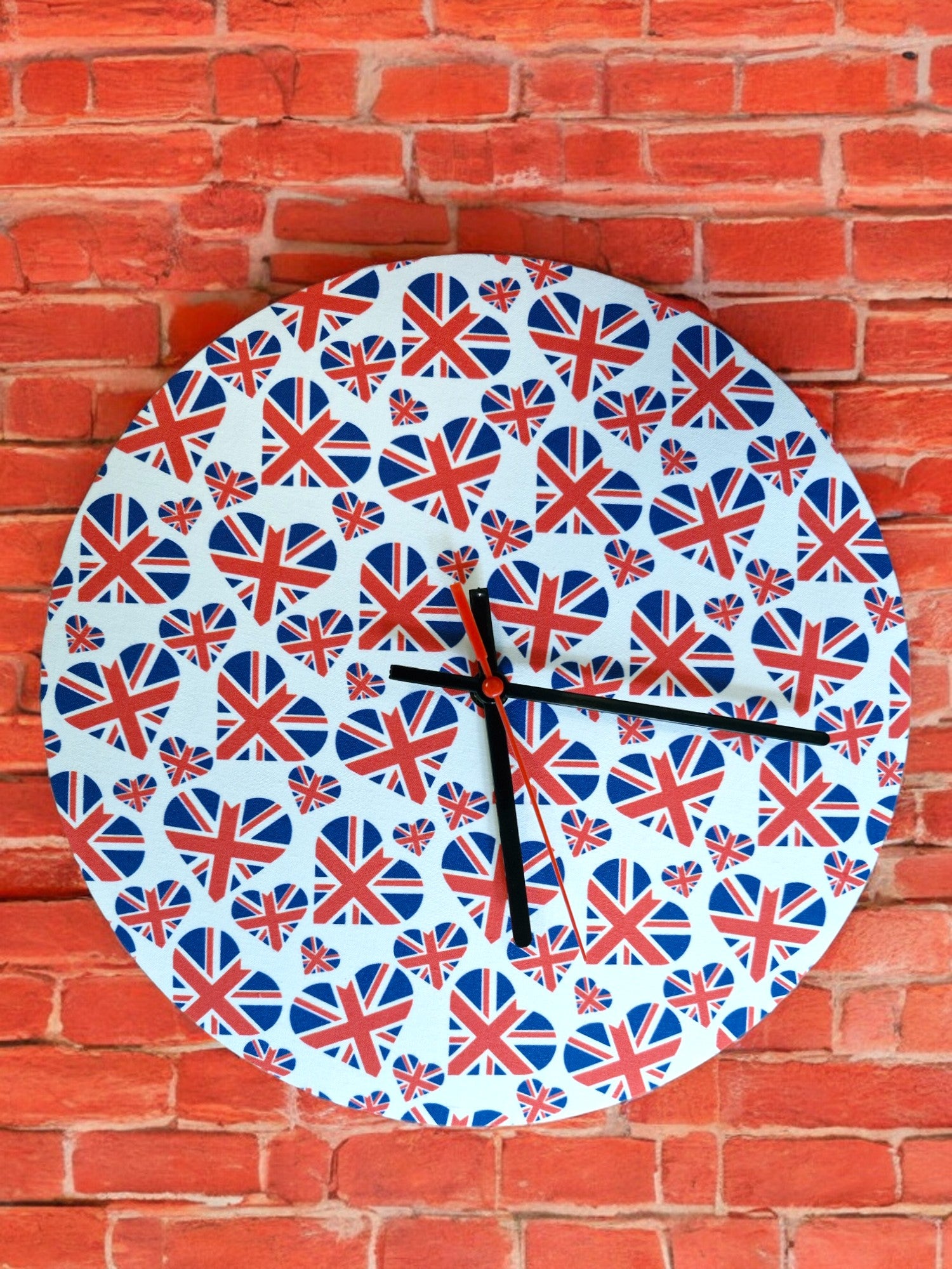 Brand new 30cms Round Clock featuring UK flag in Hearts