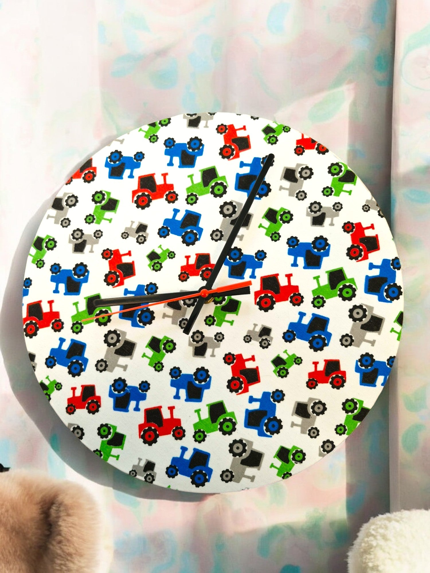 Handmade 30cms Round fully functioning Clock. The 100% cotton fabric has a White background and features Multi coloured and Black Tractors. The minute and hour hands are in Black with a Burnt Orange second hand.