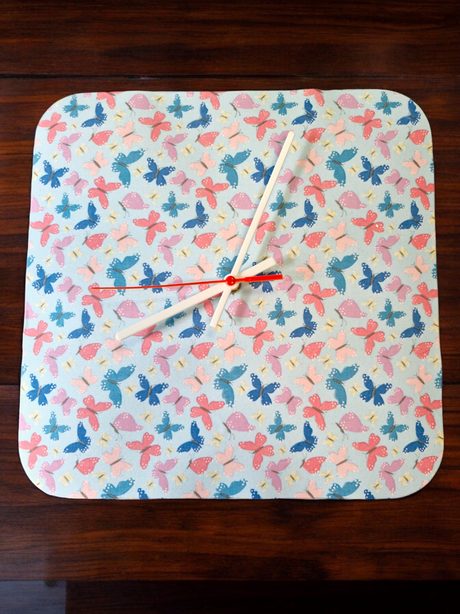 Handmade 30cms Square fully functioning Clock. The 100% cotton fabric has a Pale baby Blue background and features Blue and Pink Butterflies. The minute and hour hands are in White with a Burnt Orange second hand.