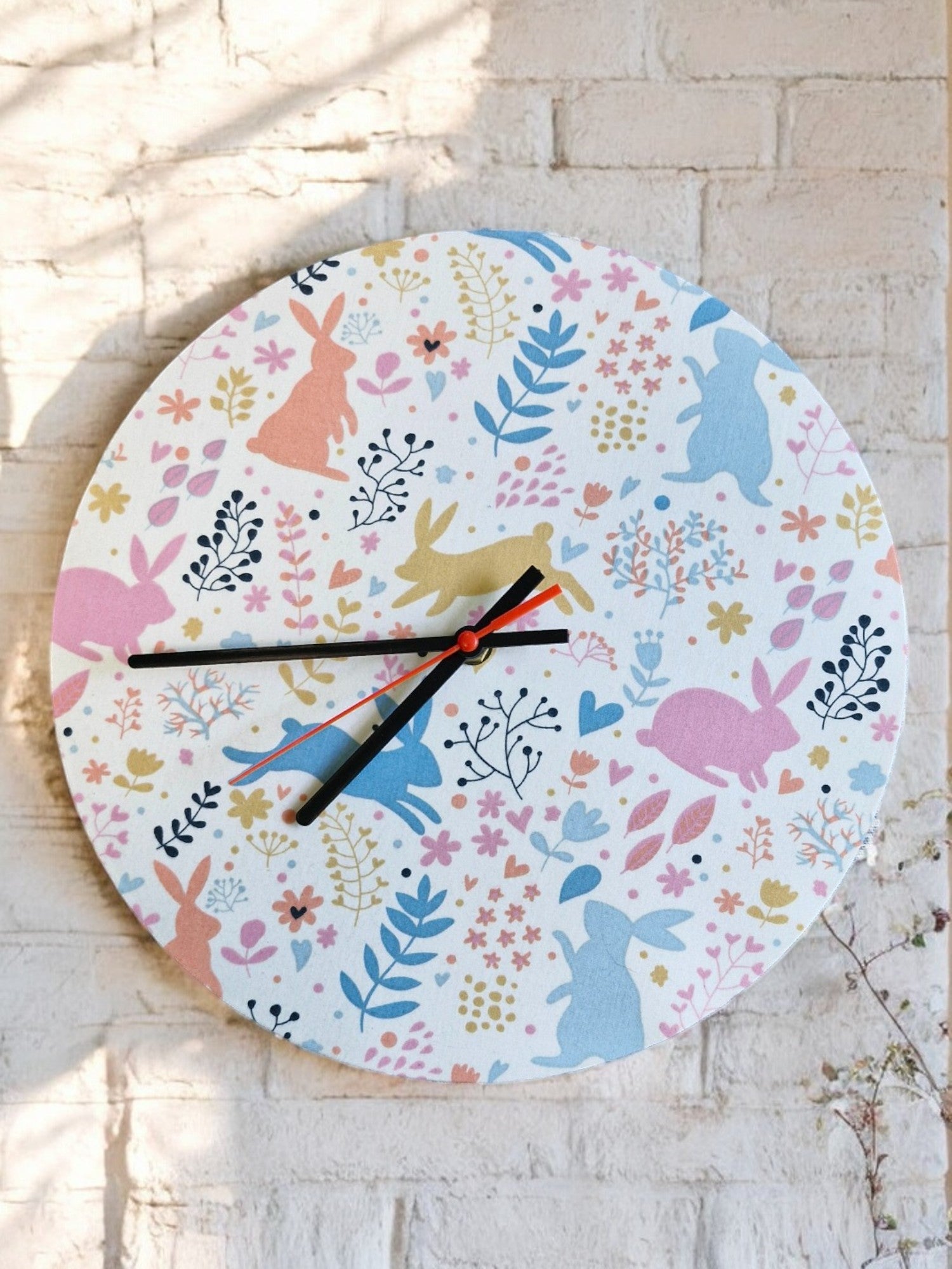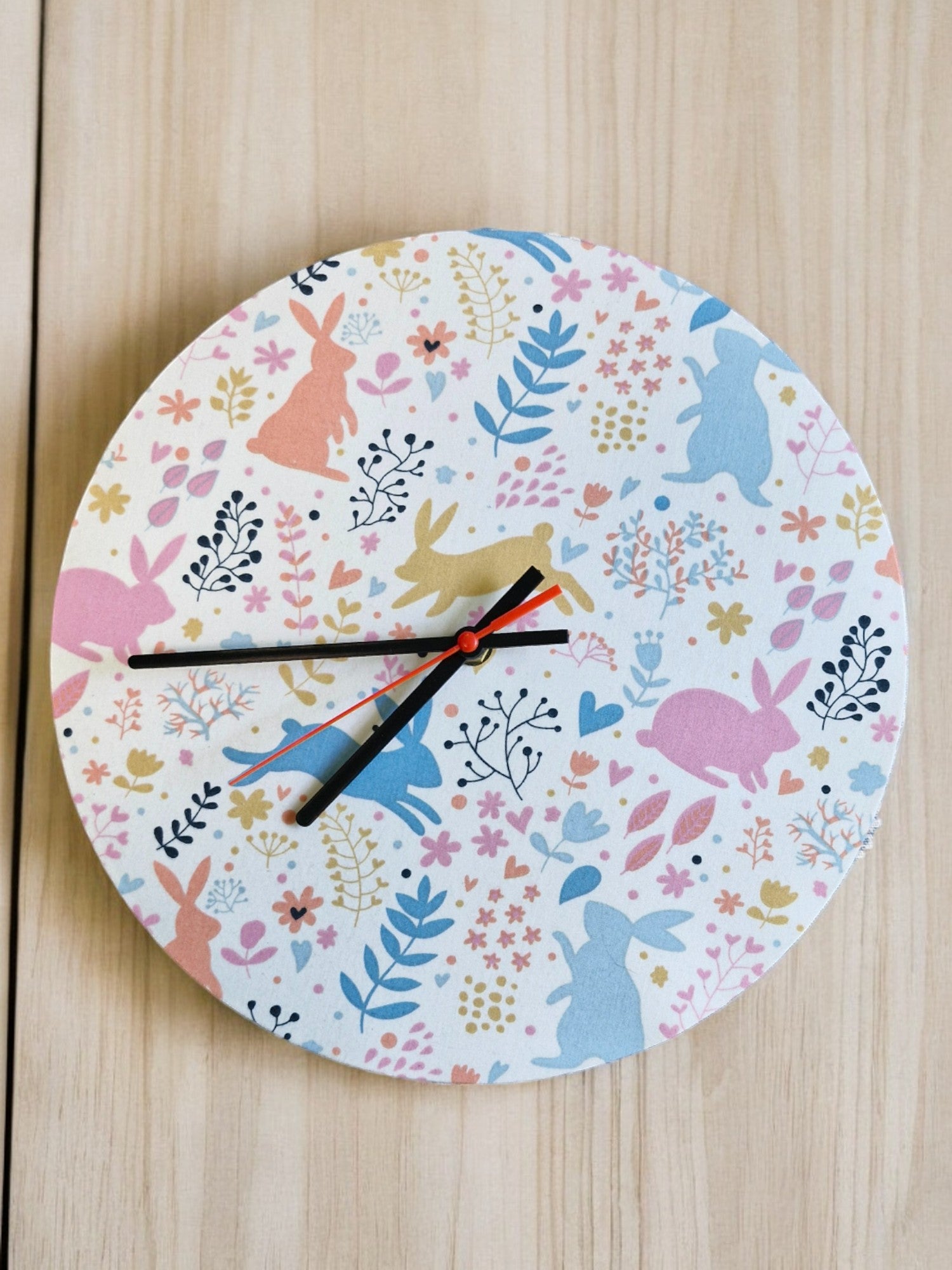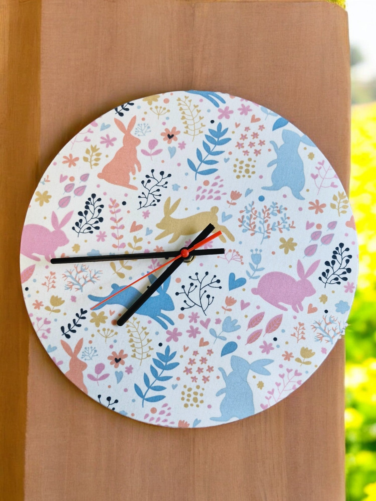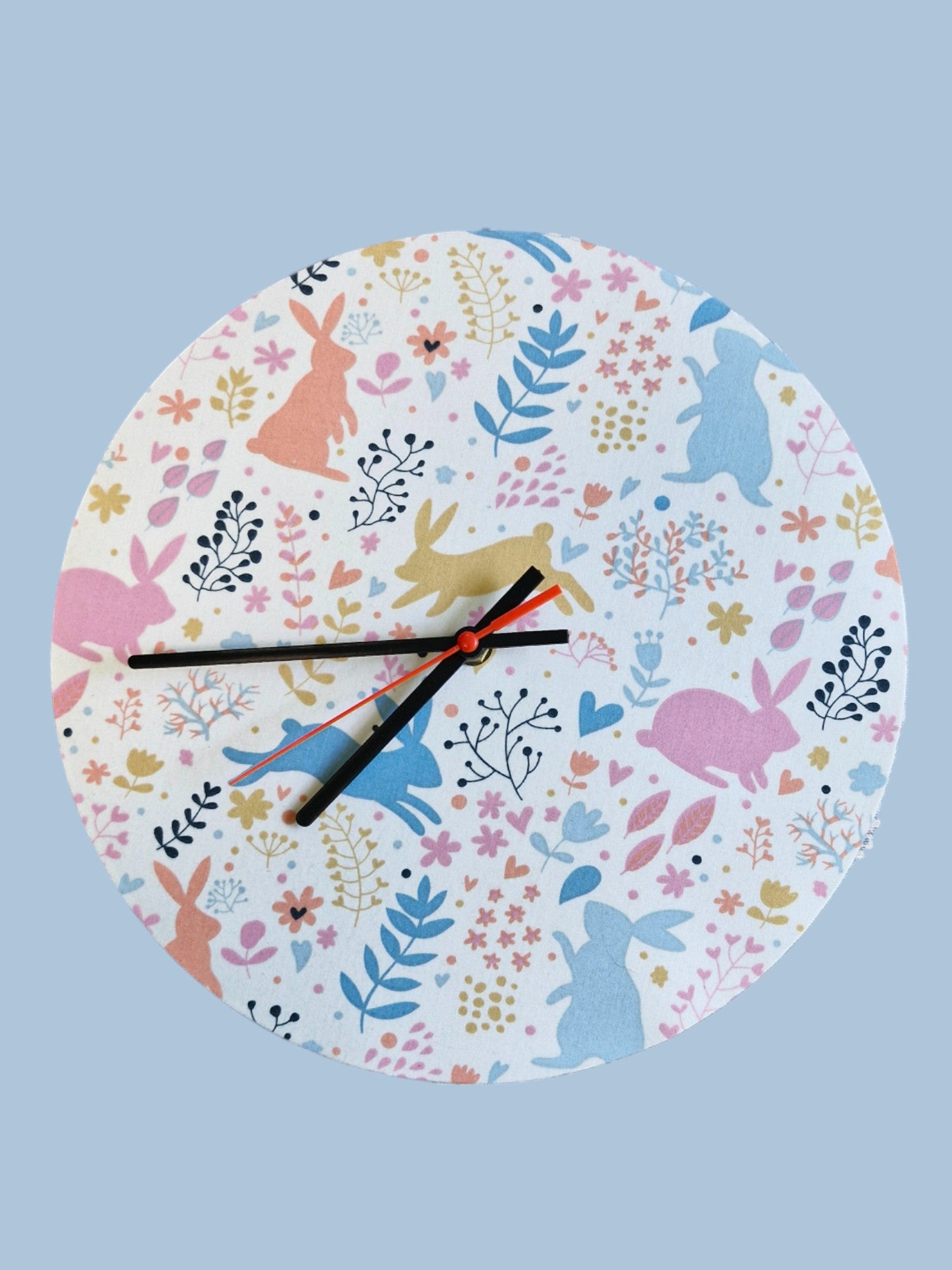 Handmade 30cms Round fully functioning Clock. The 100% cotton fabric has a White background with Pale Pink, Light Salmon and Pale Blue Rabbits and leaves all over. The minute and hour hands are in Black with a Burnt Orange second hand.