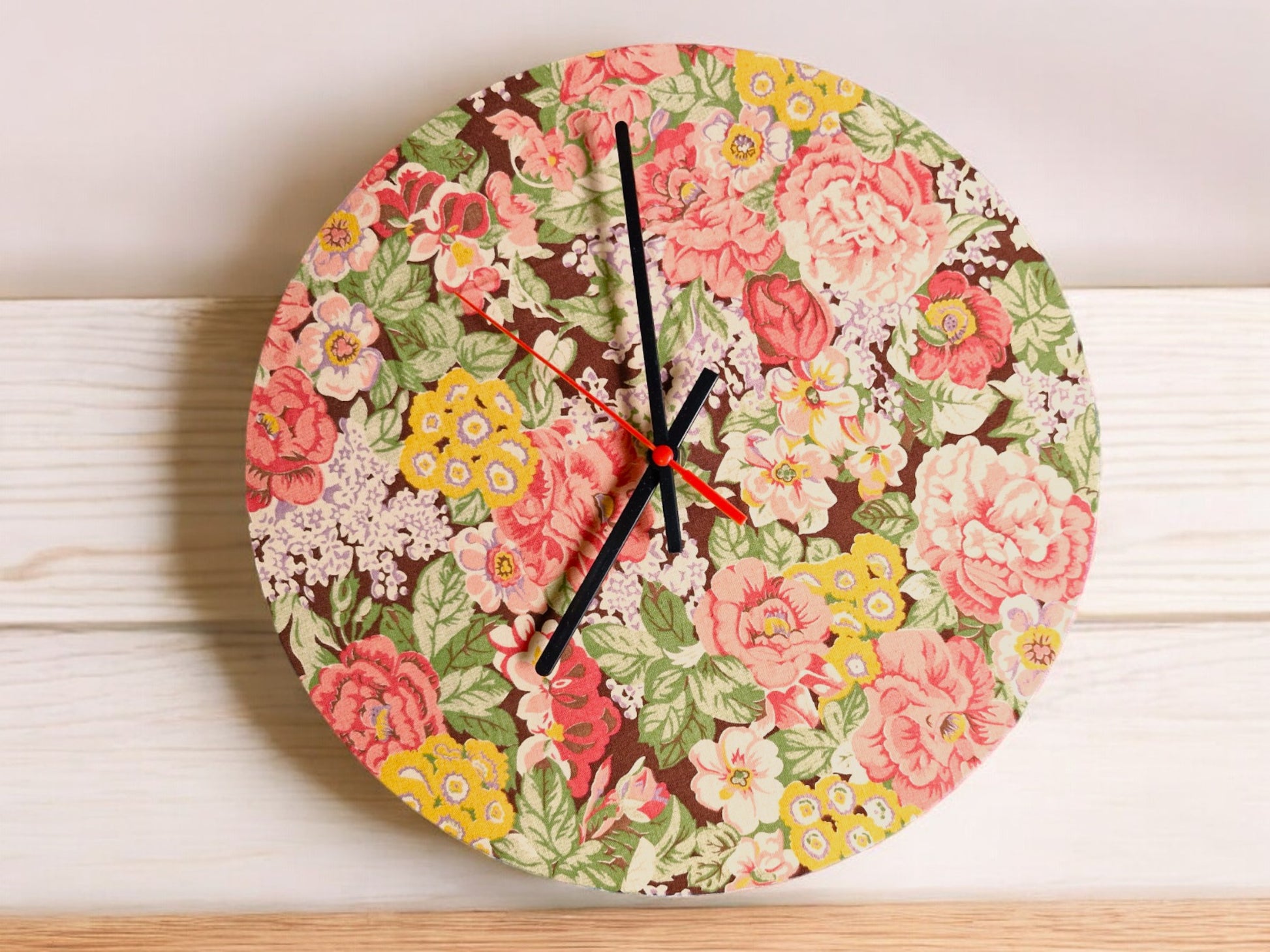 Handmade 30cms Round fully functioning Clock. The 100% cotton fabric has a Milk Chocolate background and features Multiple flowers and fauna. The minute and hour hands are in Black with a Burnt Orange second hand.