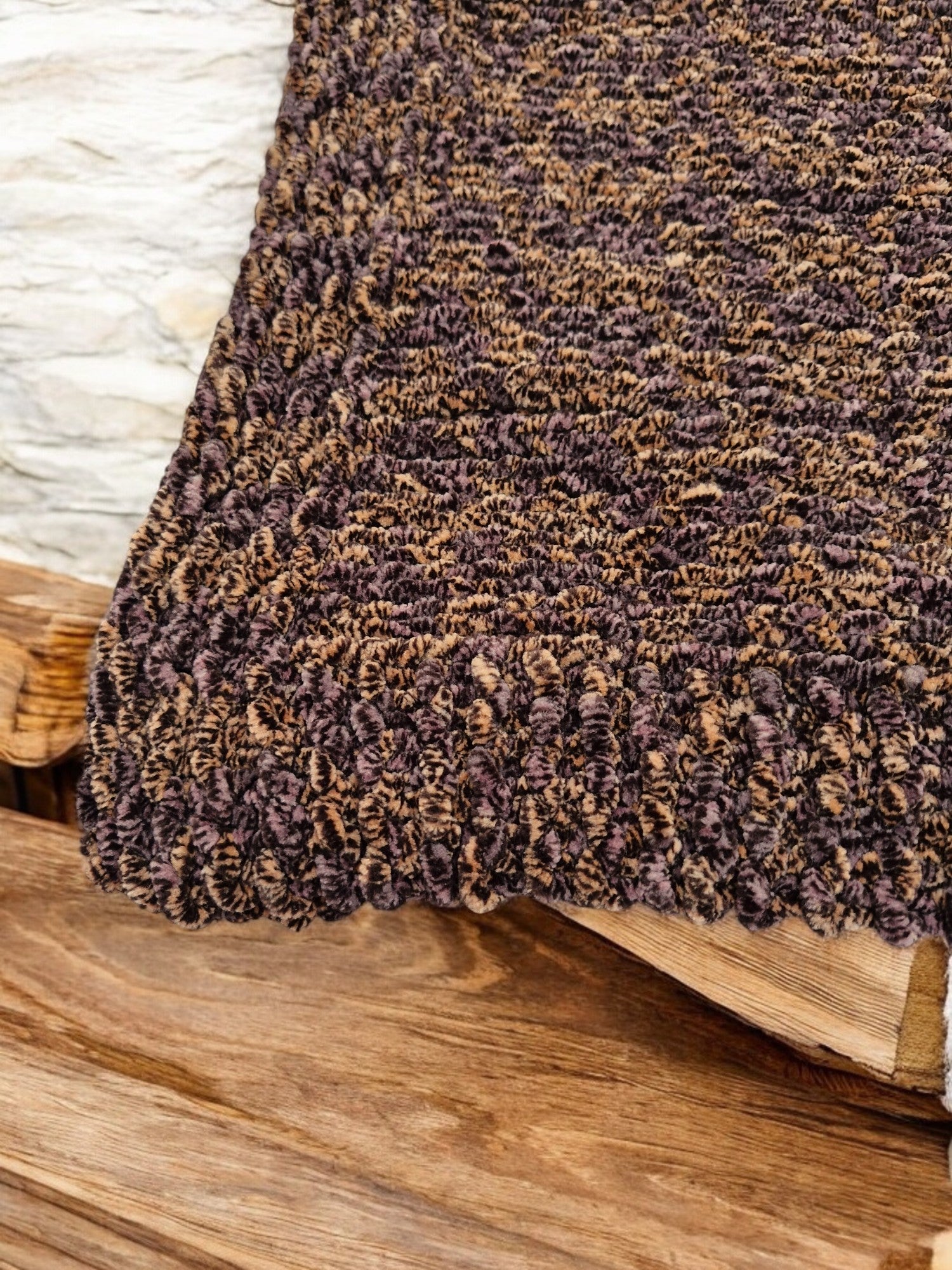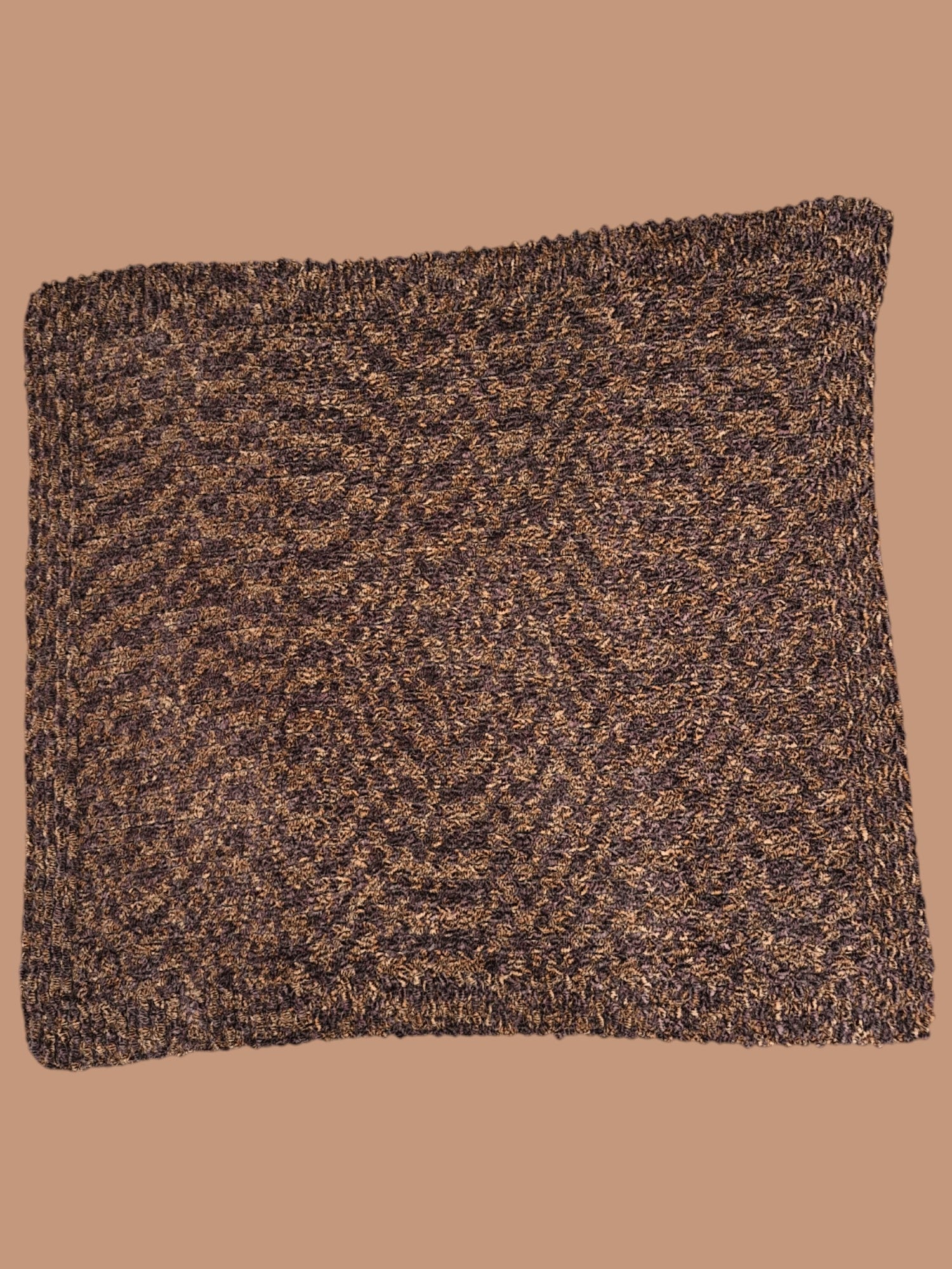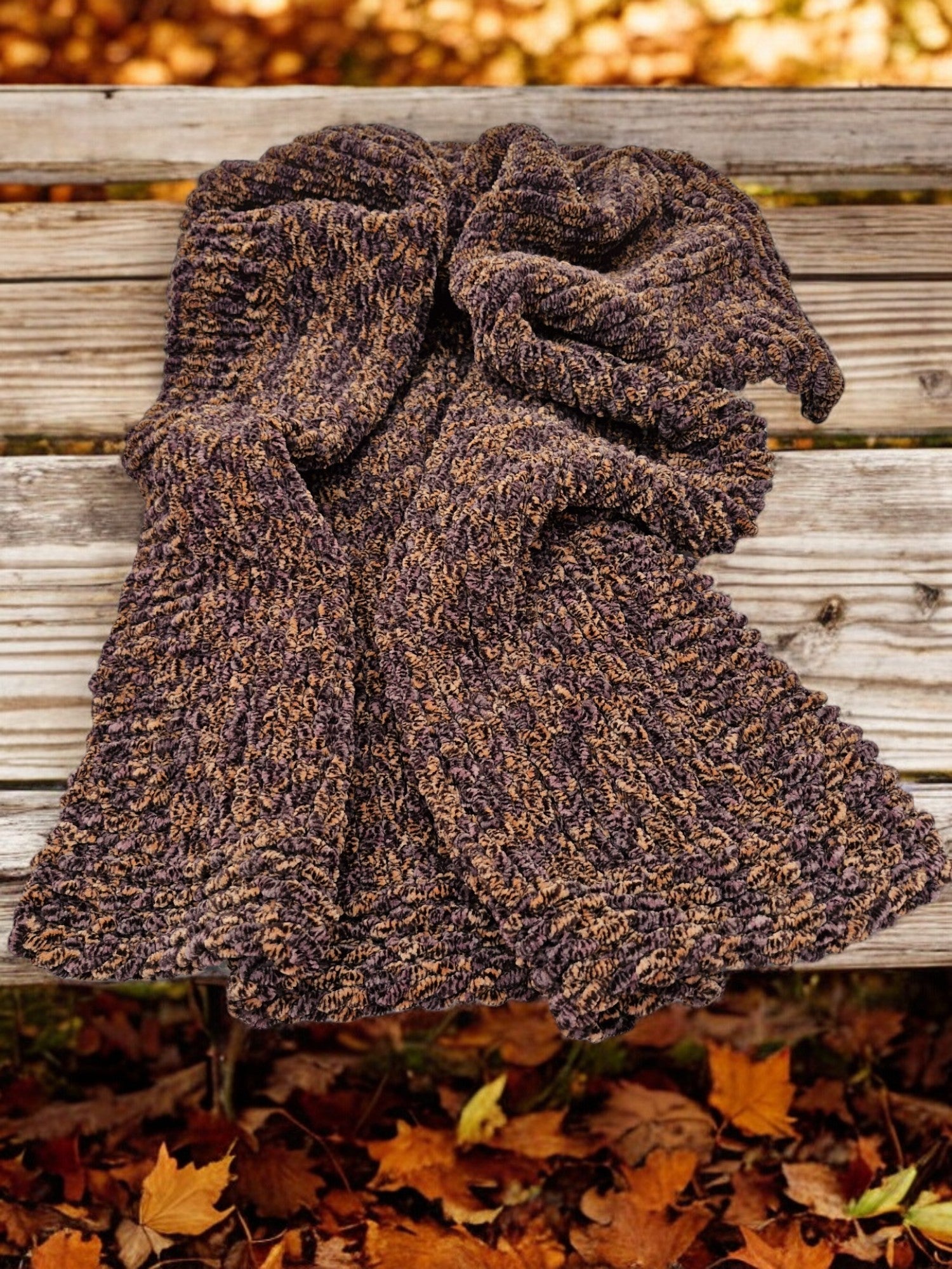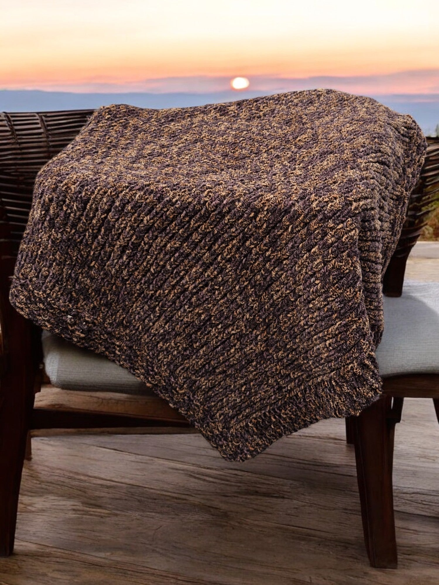 Brand new Hand Knitted Lap Blanket in shades of Brown. Made from James Brett Flutterby which has a chenille/velour type feel - very soft.. Colour is a tweed mingle of Chocolate, Mink, Mustard. Chunky weight - soft, thick and warm. Made from 100% Acrylic for easy wash.