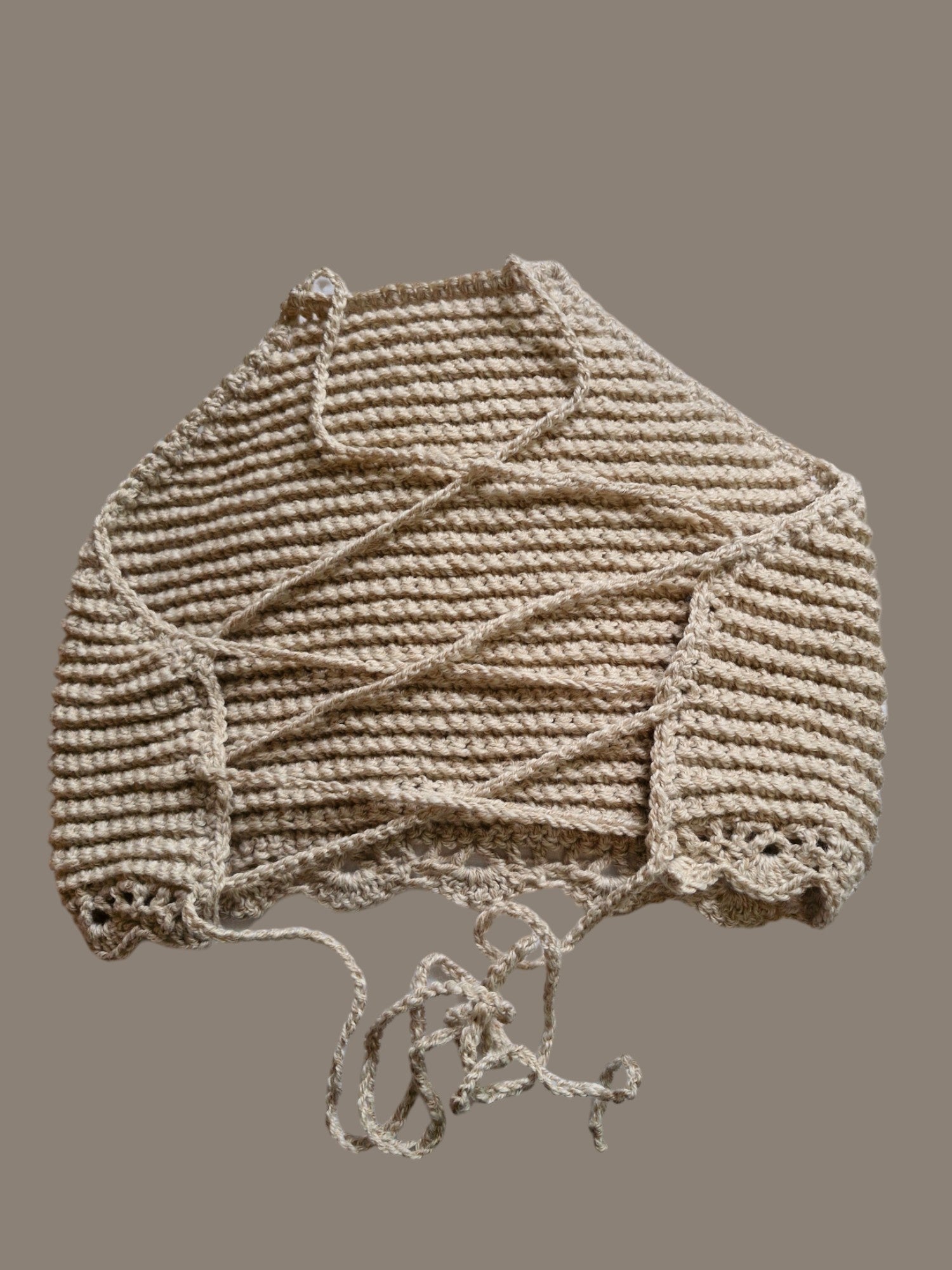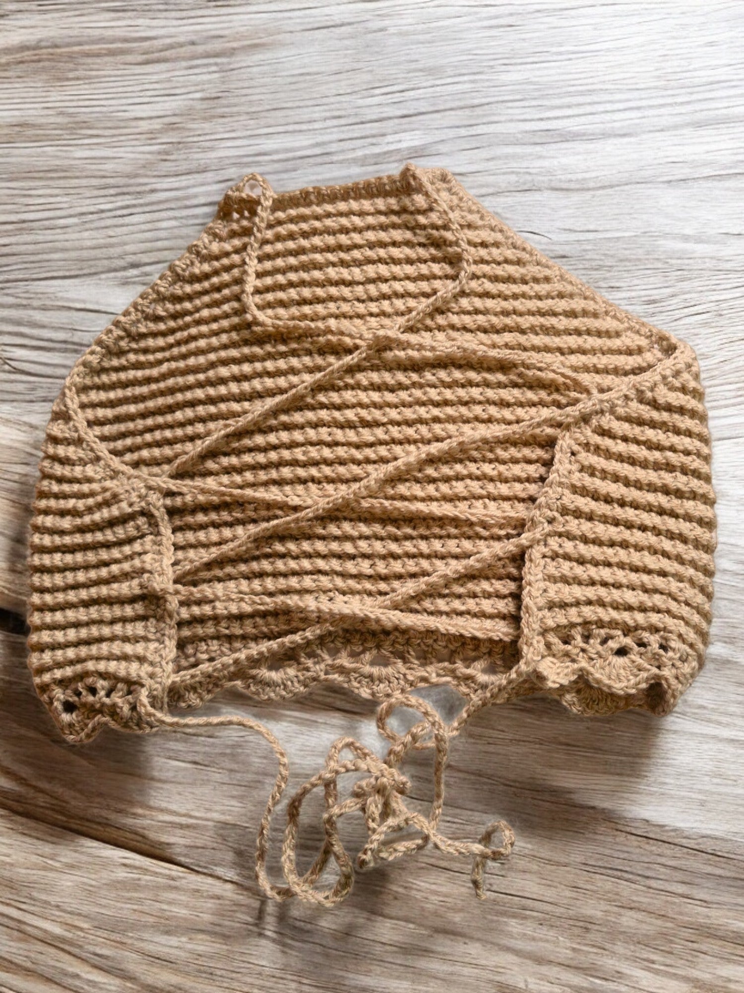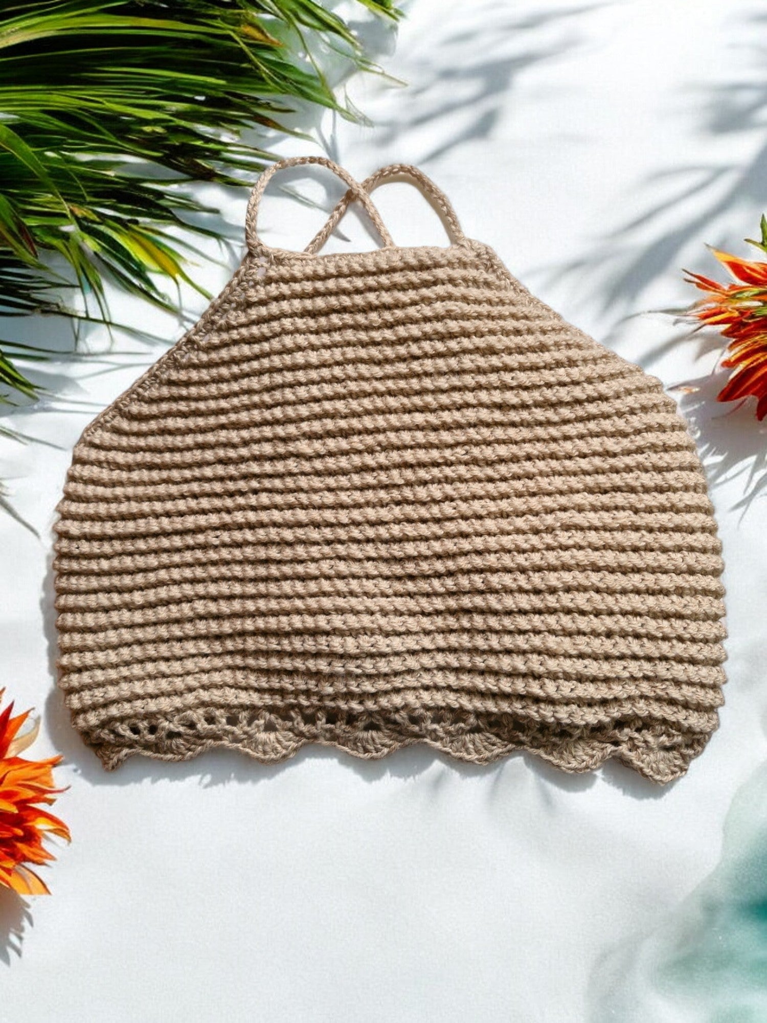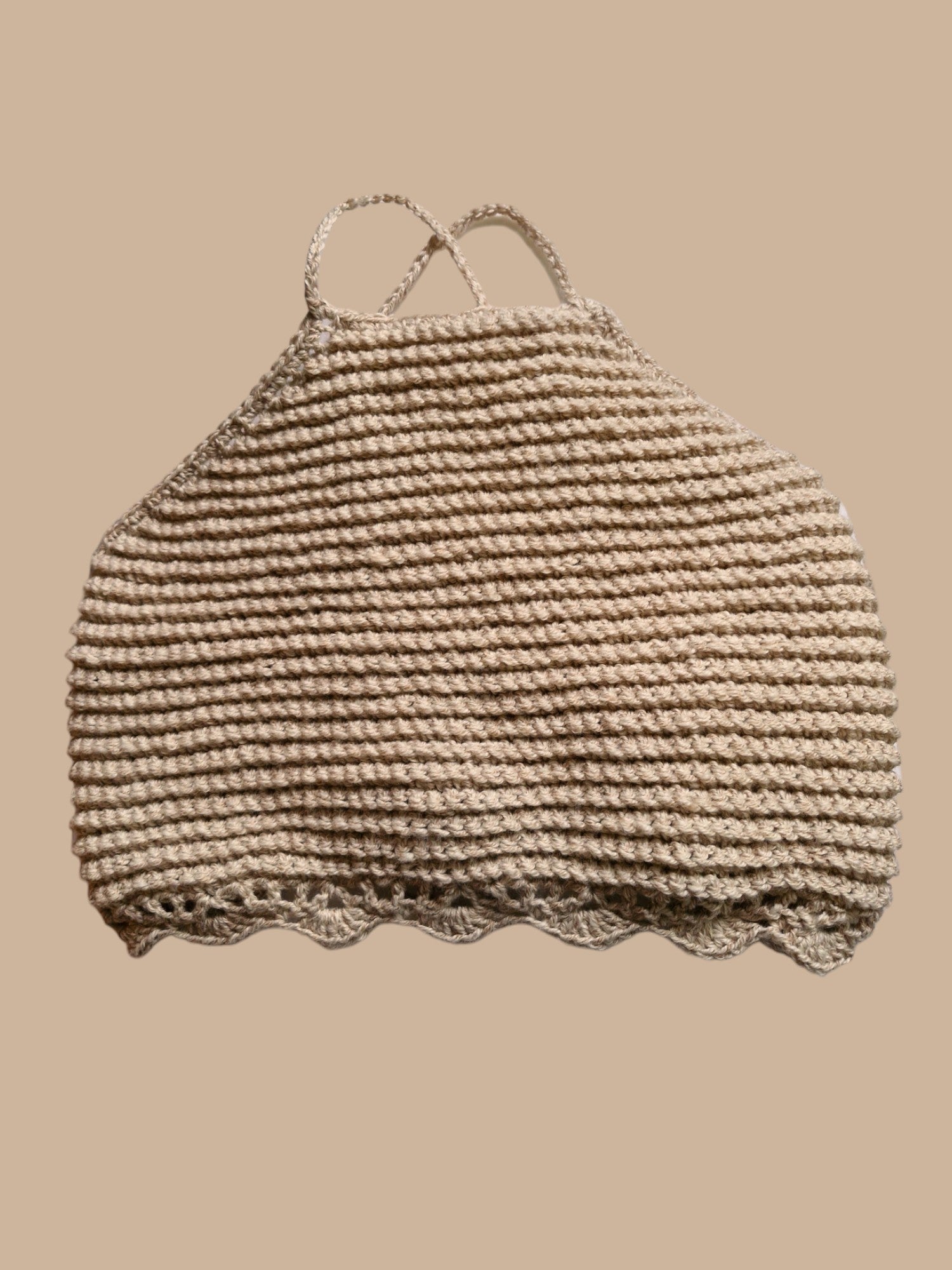 Women's Handmade Crochet Cropped Cross Back Top in Fawn with Lace Edging