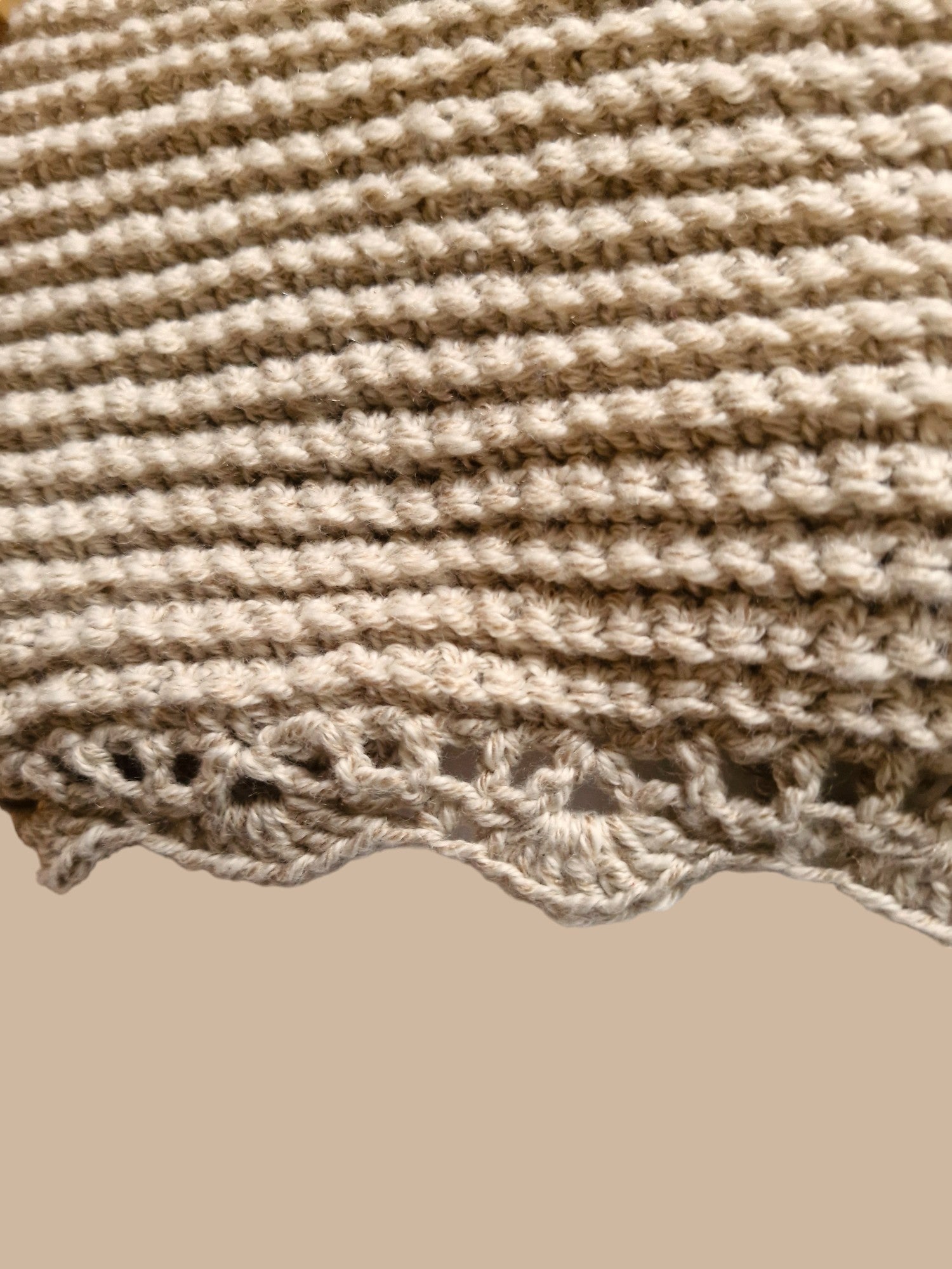 Brand new Women's Handmade Crochet Cross Back Top in Fawn with Lace Edging. Top has thin over shoulder straps which criss crosses across the back and fastens at the bottom in a bow. Design is horizontal rib with lace shell edging around the bottom. Made from 50% Cotton, 50% Acrylic.