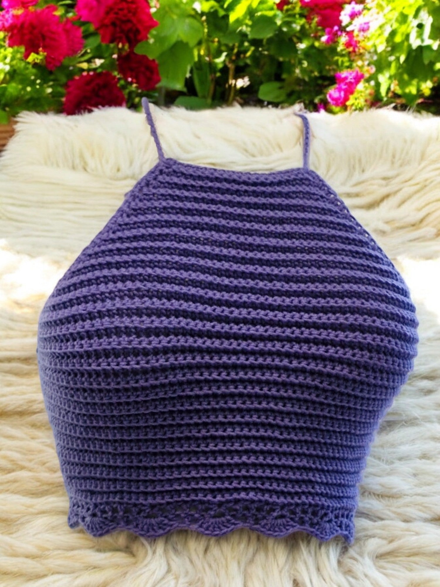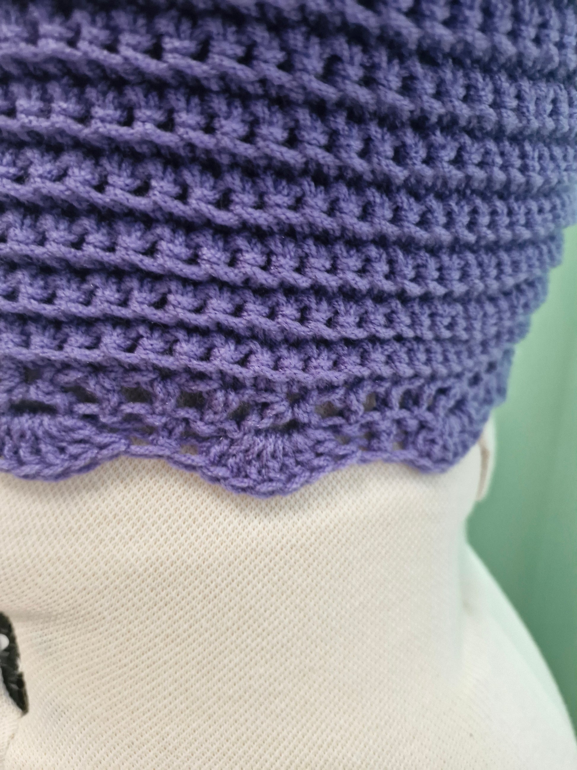 Brand new Women's Handmade Crochet Cross Back Top in Purple with Lace Edging. Top has thin over shoulder straps which criss crosses across the back and fastens at the bottom in a bow. Design is horizontal rib with lace shell edging around the bottom. Made from 100% Acrylic.