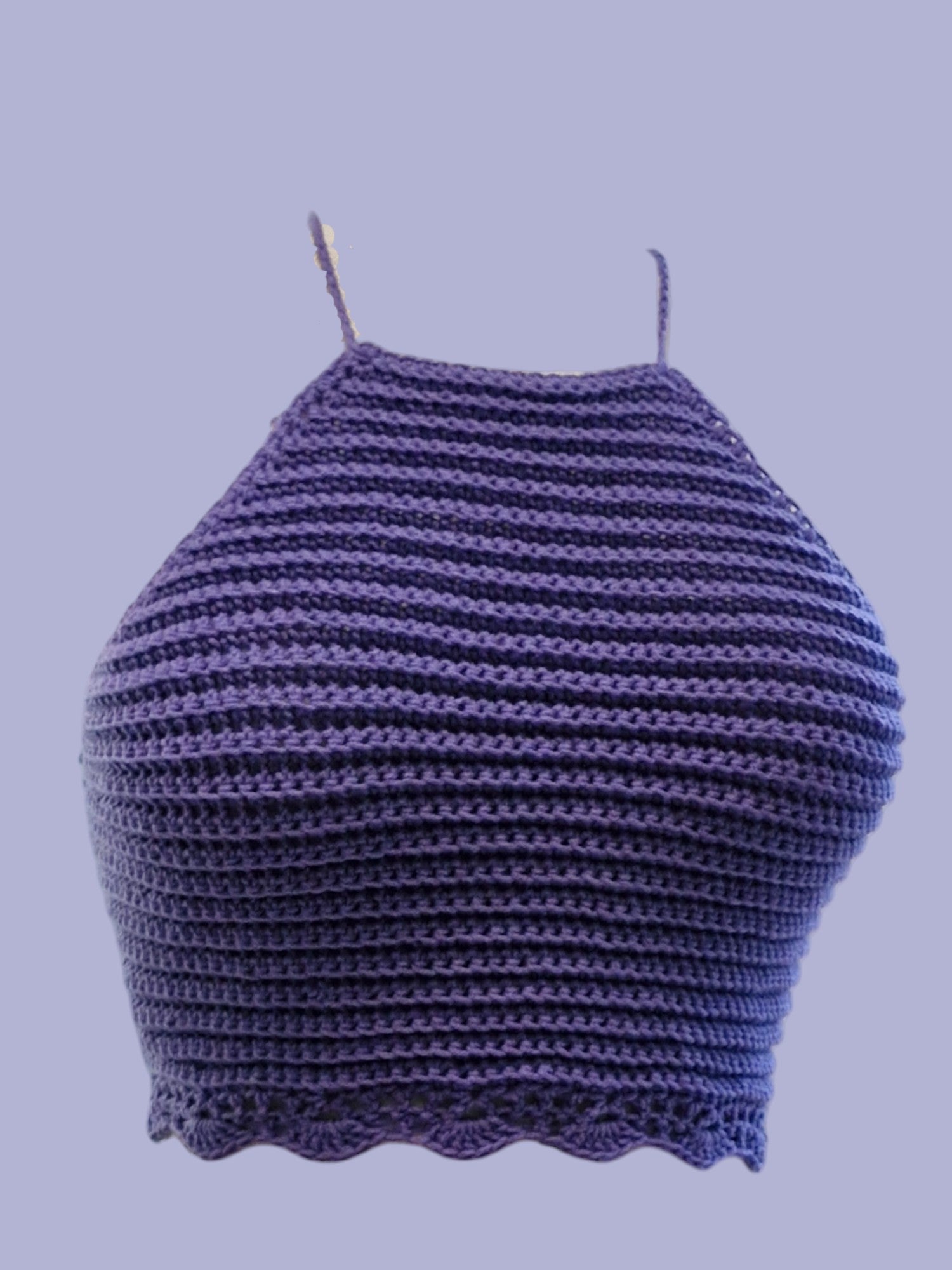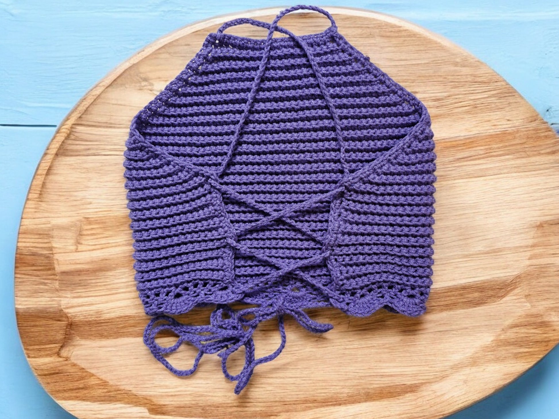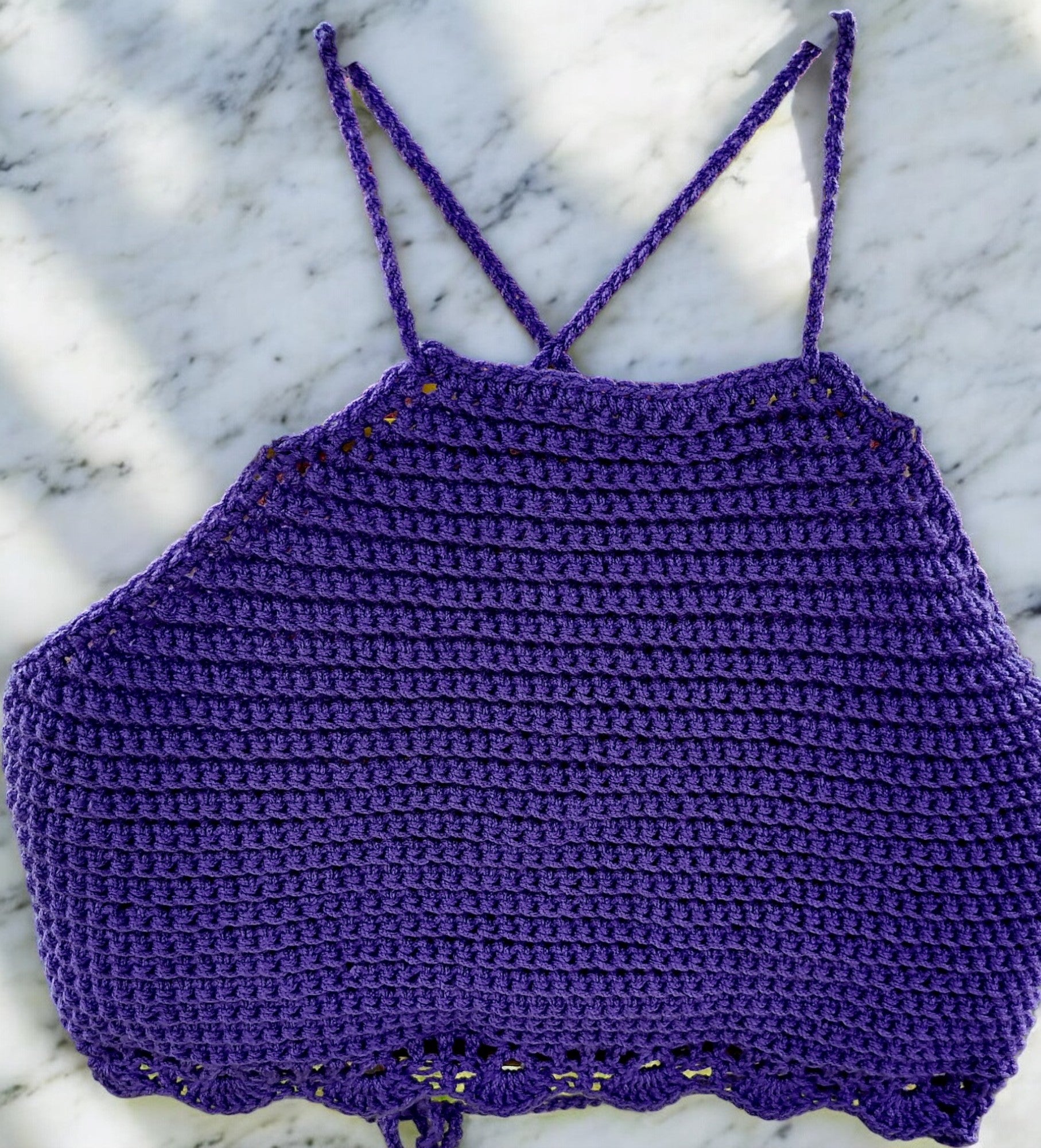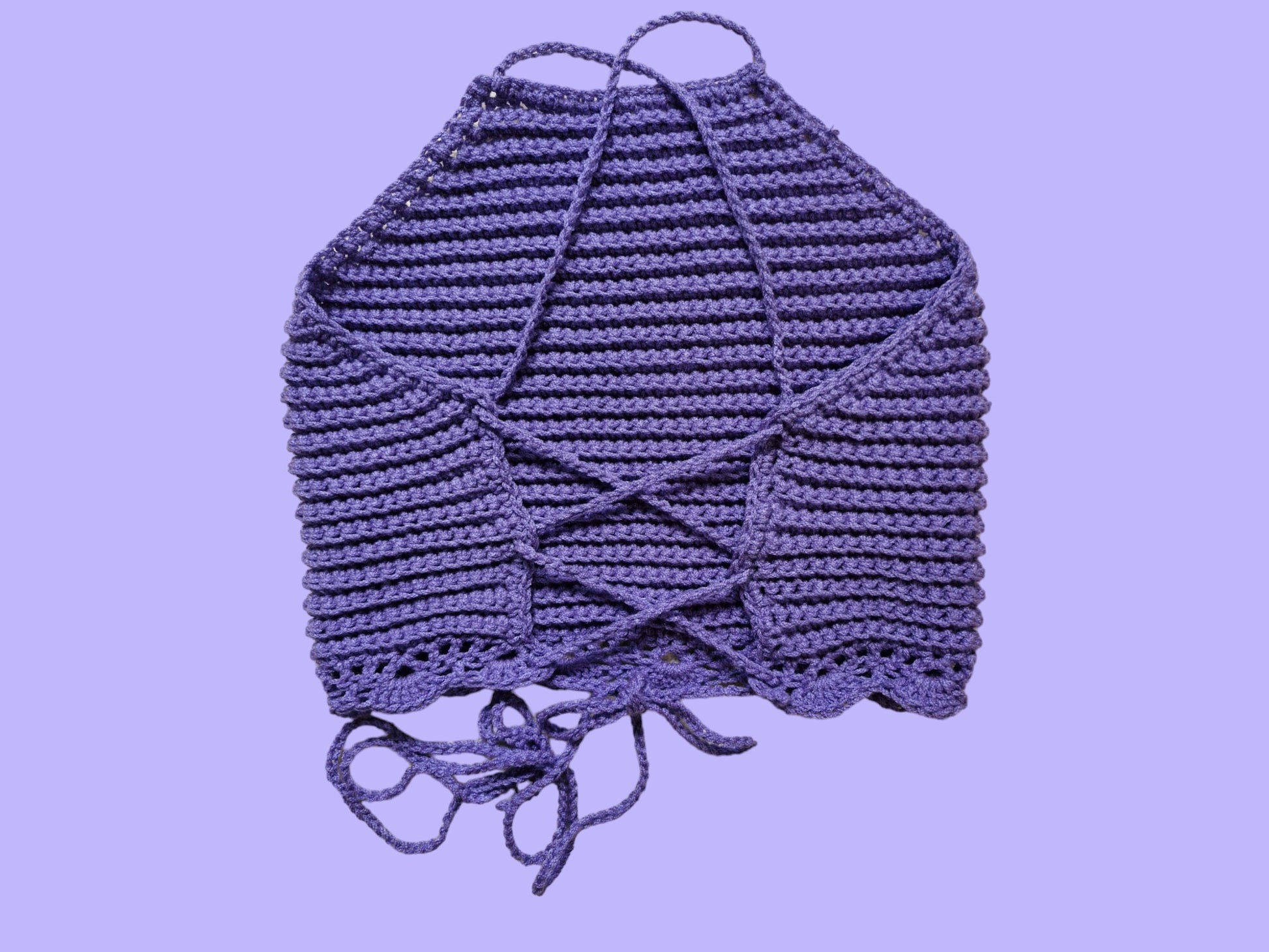 Women's Handmade Crochet Cropped Cross Back Top in Purple with Lace Edging