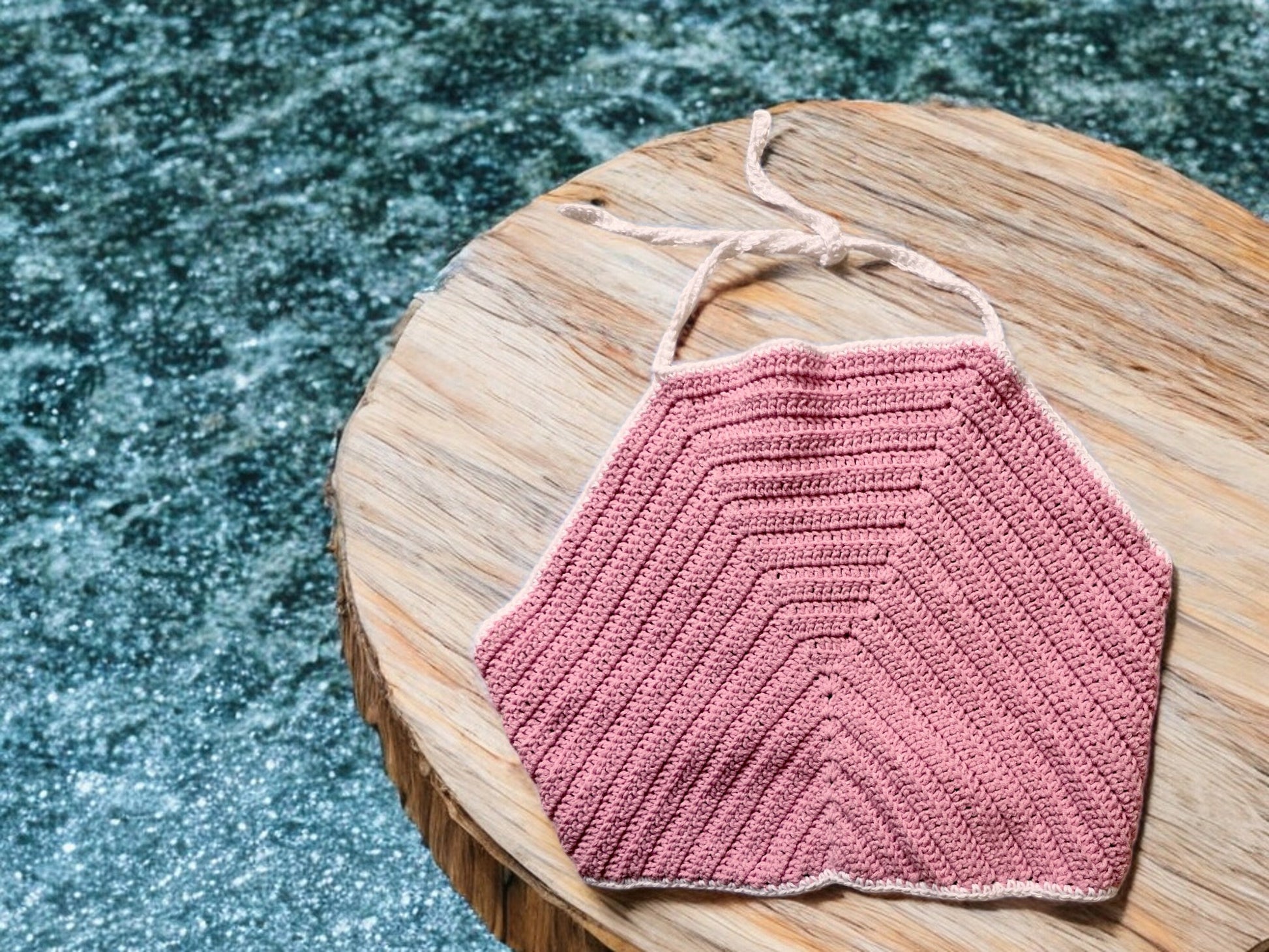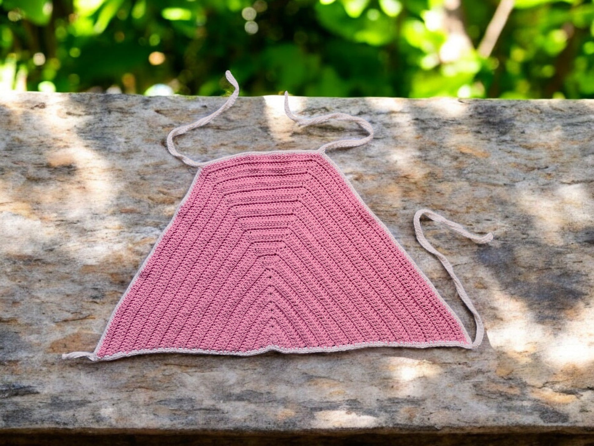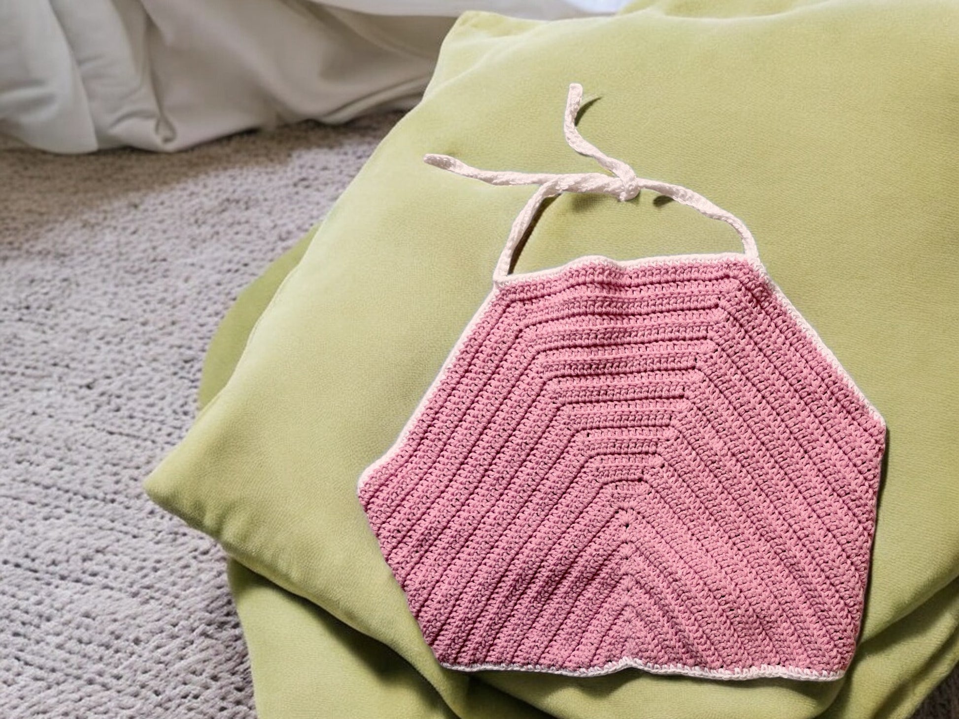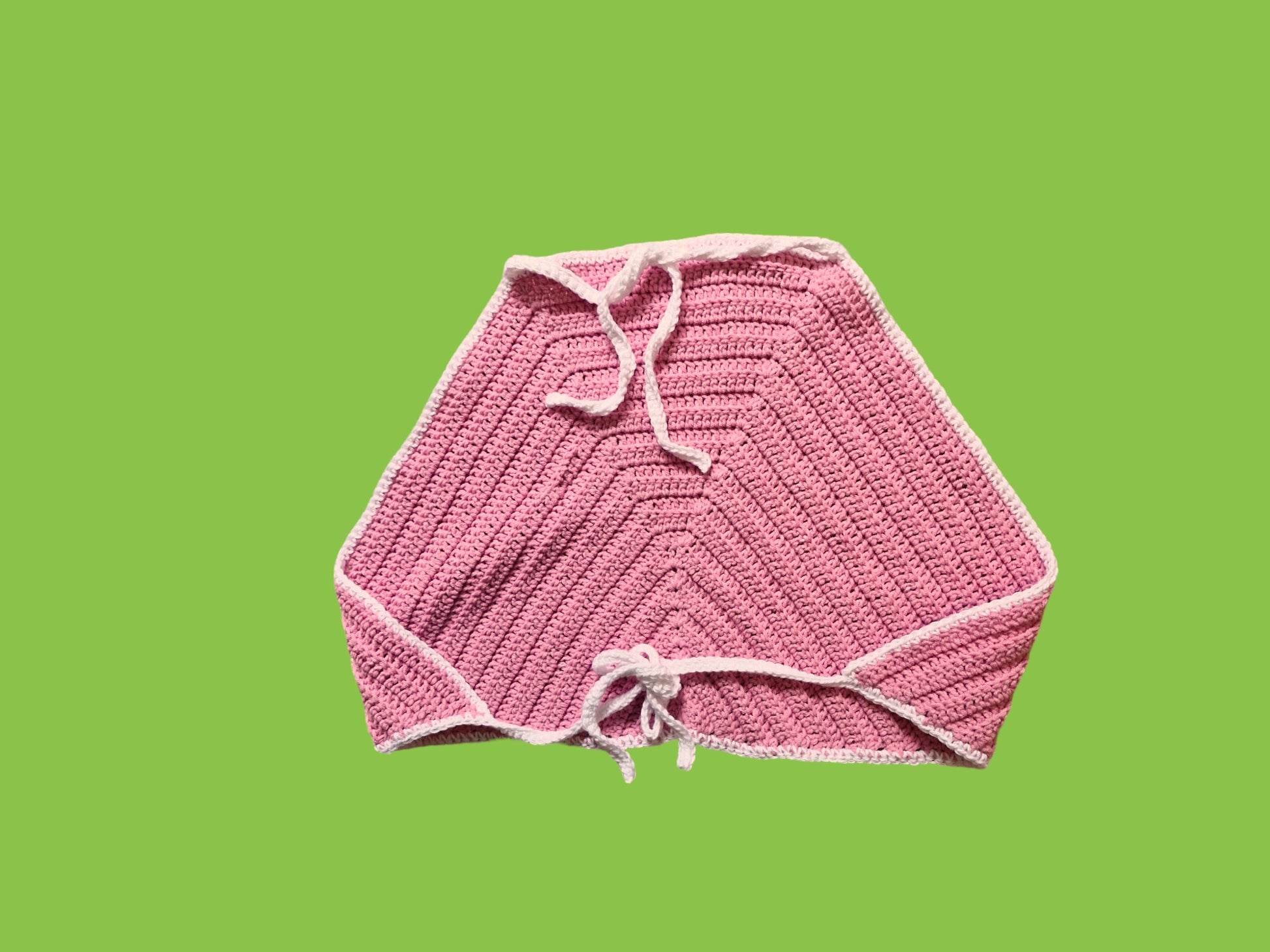 Brand new Womens Handmade Crochet Cropped Top in Pink with White Edging and Ties. Top is Halter Neck and fastens around the back neck and at the bottom around ribcage.
